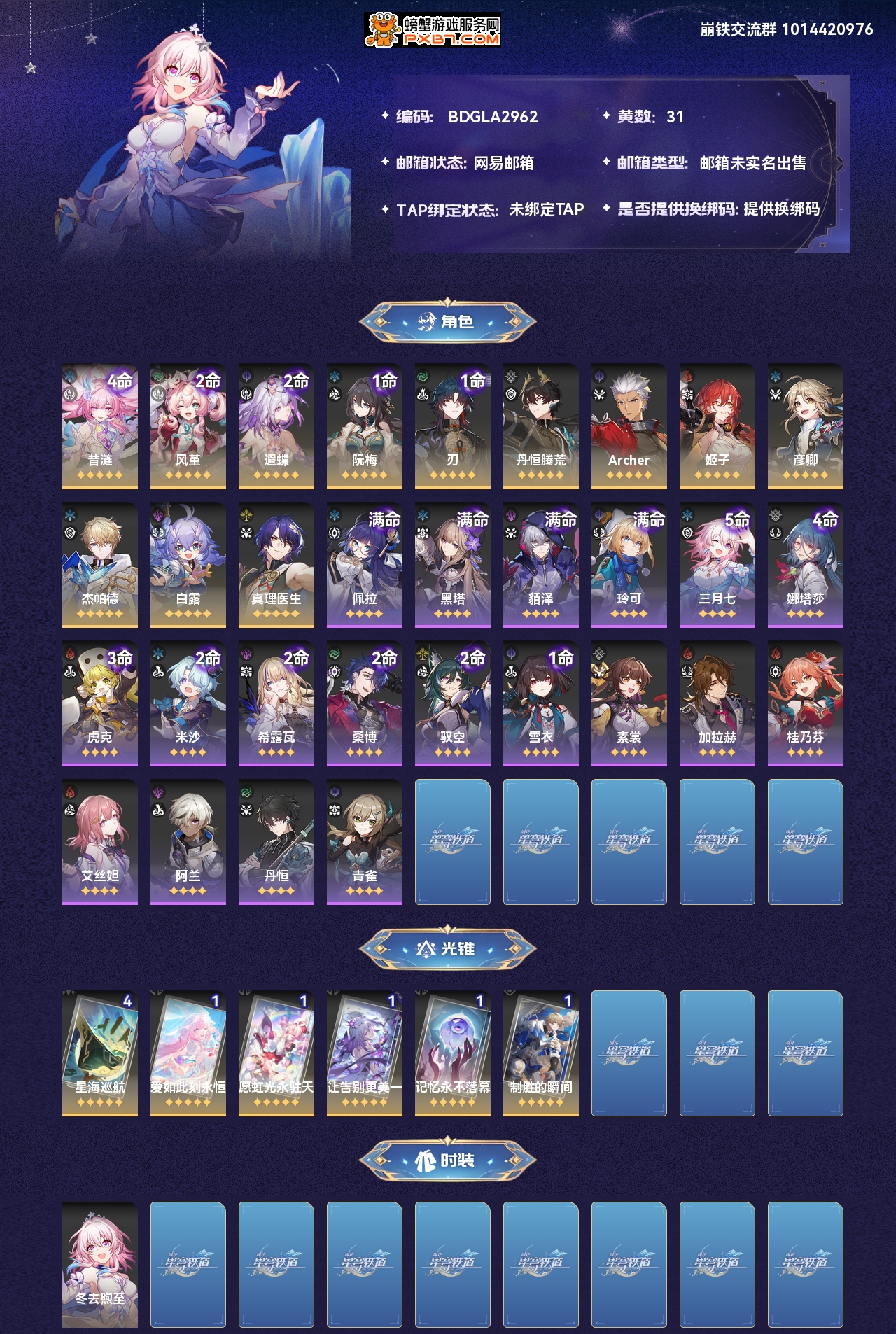【崩坏·星穹铁道】【lyxq7723】冒险等级:66,女主,五星数量:18,绑定情况:邮箱__五星角色:昔涟 4命|风堇 2命|遐蝶 2命|阮·梅 1命|刃 1命|丹恒·腾荒|archer|姬子|彦卿|杰帕德|白露|真理医生__五星光锥:星海巡航 4精|爱如此刻永恒|愿虹光永驻天空|让告别,更美一些|记忆永不落幕|制胜的瞬间,【邮箱未实名】