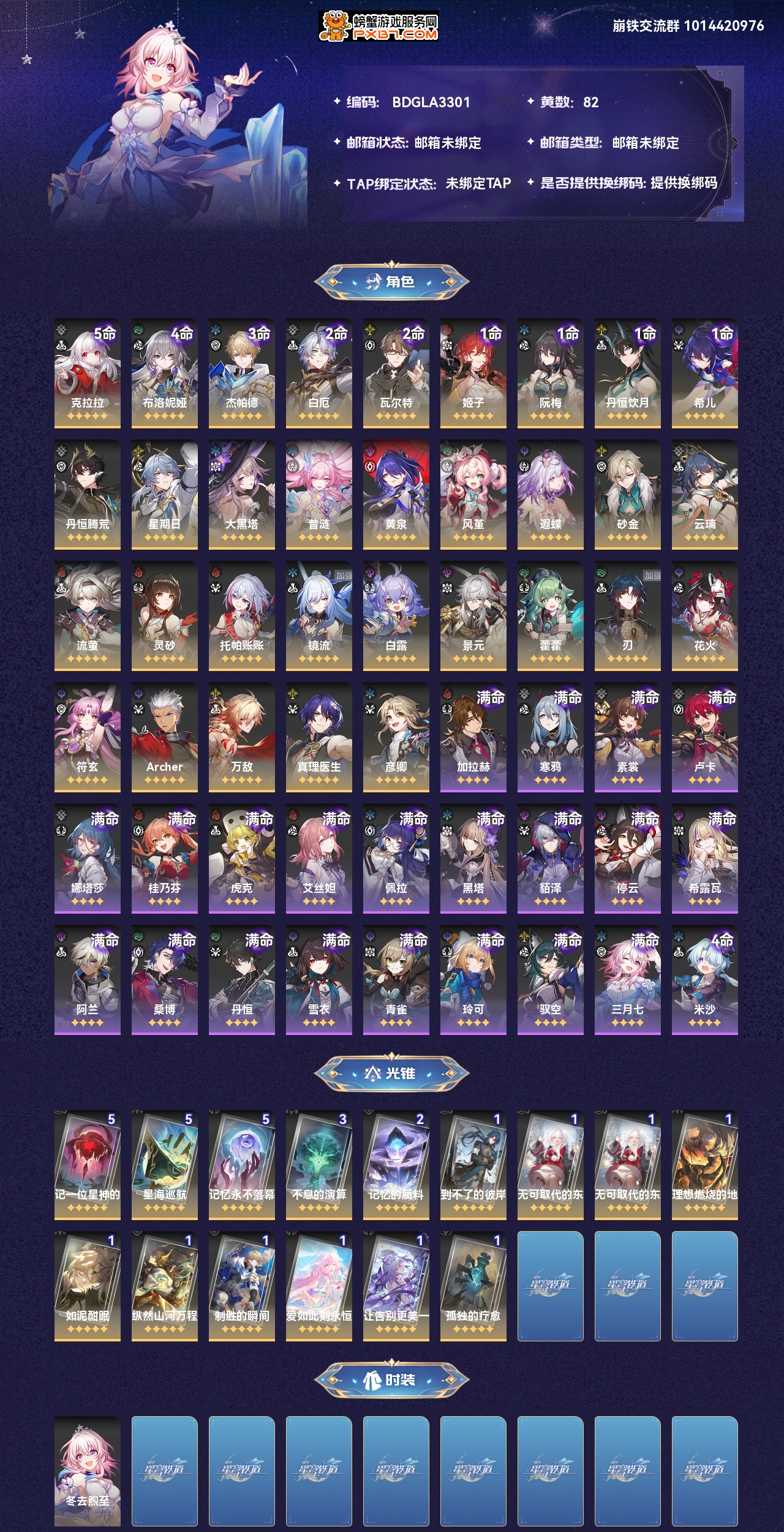 【崩坏·星穹铁道】【lyxq7789】冒险等级:70,女主,五星数量:46,绑定情况:手机号__五星角色:克拉拉 5命|布洛妮娅 4命|杰帕德 3命|白厄 2命|瓦尔特 2命|姬子 1命|阮·梅 1命|丹恒·饮月 1命|希儿 1命|丹恒·腾荒|星期日|大黑塔|昔涟|黄泉|风堇|遐蝶|砂金|云璃|流萤|灵砂|托帕账账|镜流|白露|景元|藿藿|刃|花火|符玄|archer|万敌|真理医生|彦卿__五星光锥:记一位星神的陨落 5精|星海巡航 5精|记忆永不落幕 5精|不息的演算 3精|记忆的质料 2精|到不了的彼岸|无可取代的东西|理想燃烧的地狱|如泥酣眠|纵然山河万程|制胜的瞬间|爱如此刻永恒|让告别,更美一些|孤独的疗愈,【邮箱未绑定】