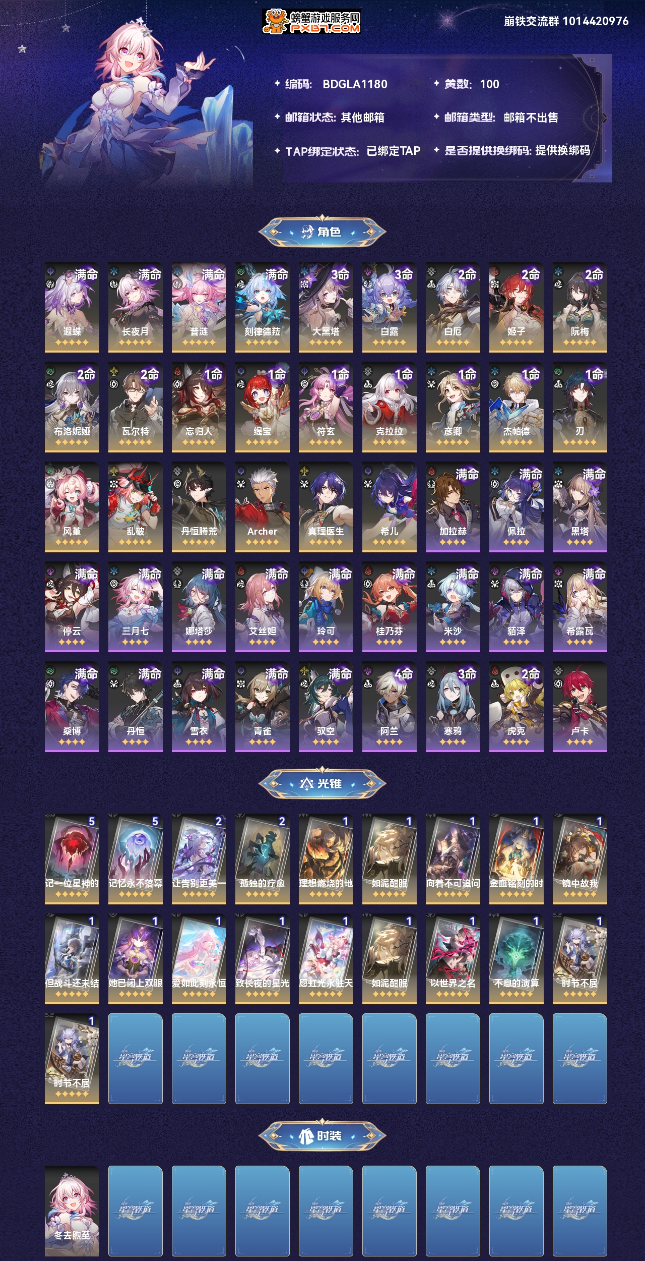 【崩坏·星穹铁道】【lyxq7775】冒险等级:70,女主,五星数量:41,绑定情况:taptap|邮箱__五星角色:遐蝶 6命|长夜月 6命|昔涟 6命|刻律德菈 6命|大黑塔 3命|白露 3命|白厄 2命|姬子 2命|阮·梅 2命|布洛妮娅 2命|瓦尔特 2命|忘归人 1命|缇宝 1命|符玄 1命|克拉拉 1命|彦卿 1命|杰帕德 1命|刃 1命|风堇|乱破|丹恒·腾荒|archer|真理医生|希儿__五星光锥:记一位星神的陨落 5精|记忆永不落幕 5精|让告别,更美一些 2精|孤独的疗愈 2精|理想燃烧的地狱|如泥酣眠|向着不可追问处|金血铭刻的时代|镜中故我|但战斗还未结束|她已闭上双眼|爱如此刻永恒|致长夜的星光|愿虹光永驻天空|以世界之名|不息的演算|时节不居,【邮箱不出售】