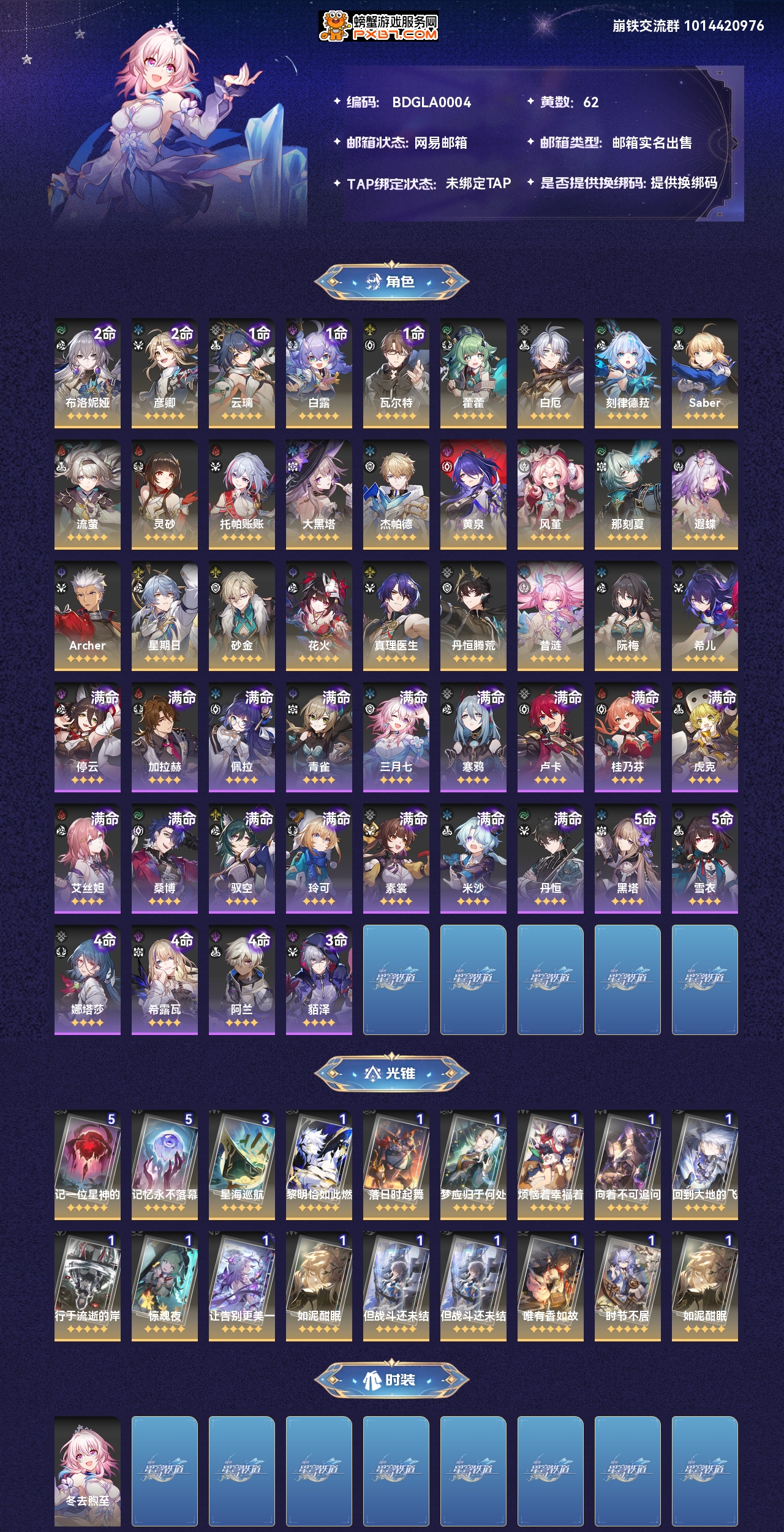 【崩坏·星穹铁道】【lyxq7806】冒险等级:70,女主,五星数量:43,绑定情况:邮箱__五星角色:布洛妮娅 2命|彦卿 2命|云璃 1命|白露 1命|瓦尔特 1命|藿藿|白厄|刻律德菈|saber|流萤|灵砂|托帕账账|大黑塔|杰帕德|黄泉|风堇|那刻夏|遐蝶|archer|星期日|砂金|花火|真理医生|丹恒·腾荒|昔涟|阮·梅|希儿__五星光锥:记一位星神的陨落 5精|记忆永不落幕 5精|星海巡航 3精|黎明恰如此燃烧|落日时起舞|梦应归于何处|烦恼着,幸福着|向着不可追问处|回到大地的飞行|行于流逝的岸|惊魂夜|让告别,更美一些|如泥酣眠|但战斗还未结束|唯有香如故|时节不居,【邮箱已实名】