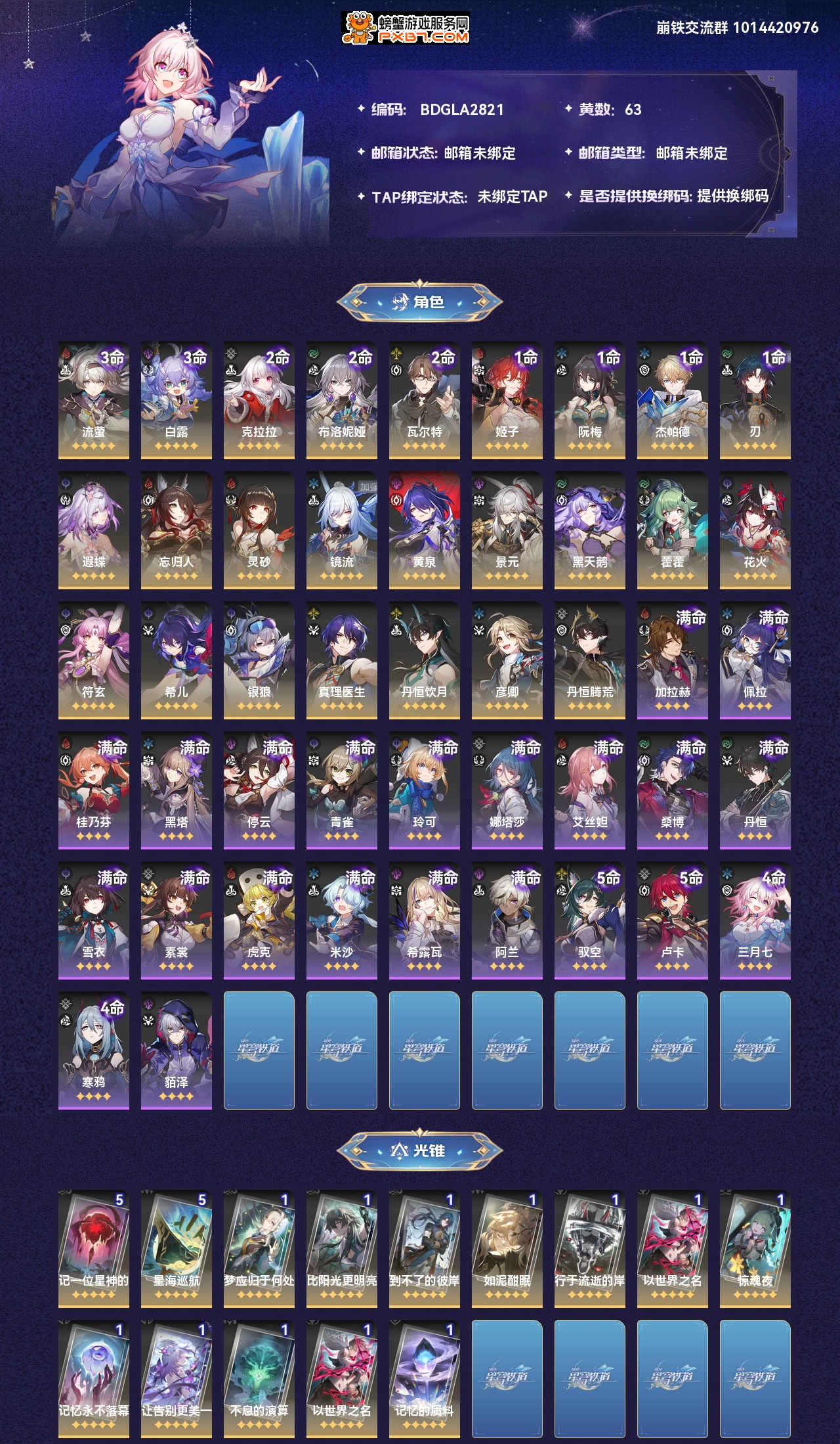 【崩坏·星穹铁道】【lyxq7807】冒险等级:70,女主,五星数量:38,绑定情况:手机号__五星角色:流萤 3命|白露 3命|克拉拉 2命|布洛妮娅 2命|瓦尔特 2命|姬子 1命|阮·梅 1命|杰帕德 1命|刃 1命|遐蝶|忘归人|灵砂|镜流|黄泉|景元|黑天鹅|藿藿|花火|符玄|希儿|银狼|真理医生|丹恒·饮月|彦卿|丹恒·腾荒__五星光锥:记一位星神的陨落 5精|星海巡航 5精|梦应归于何处|比阳光更明亮的|到不了的彼岸|如泥酣眠|行于流逝的岸|以世界之名|惊魂夜|记忆永不落幕|让告别,更美一些|不息的演算|记忆的质料,【邮箱未绑定】
