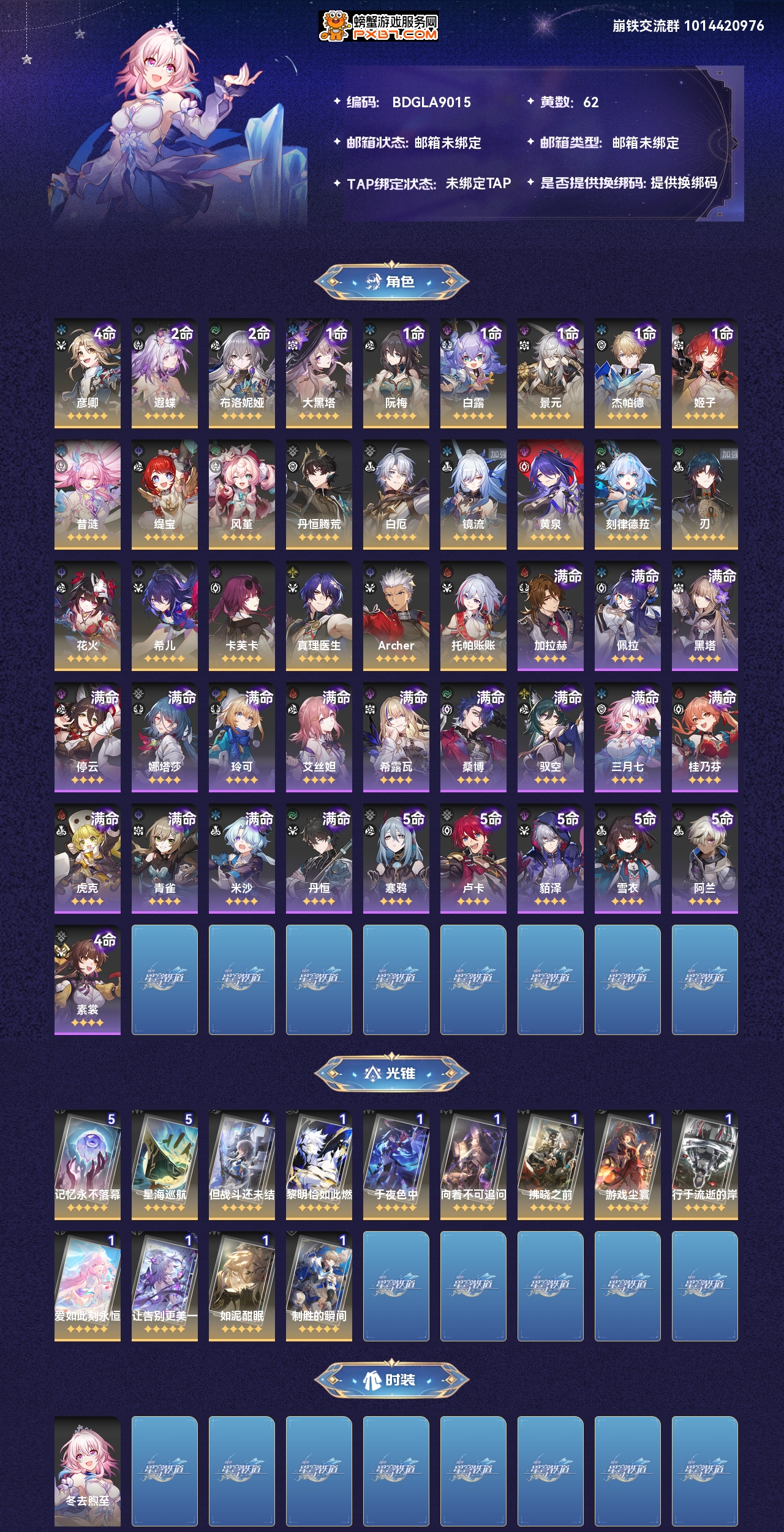 【崩坏·星穹铁道】【lyxq7822】冒险等级:70,男主,五星数量:37,绑定情况:手机号__五星角色:彦卿 4命|遐蝶 2命|布洛妮娅 2命|大黑塔 1命|阮·梅 1命|白露 1命|景元 1命|杰帕德 1命|姬子 1命|昔涟|缇宝|风堇|丹恒·腾荒|白厄|镜流|黄泉|刻律德菈|刃|花火|希儿|卡芙卡|真理医生|archer|托帕账账__五星光锥:记忆永不落幕 5精|星海巡航 5精|但战斗还未结束 4精|黎明恰如此燃烧|于夜色中|向着不可追问处|拂晓之前|游戏尘寰|行于流逝的岸|爱如此刻永恒|让告别,更美一些|如泥酣眠|制胜的瞬间,【邮箱未绑定】