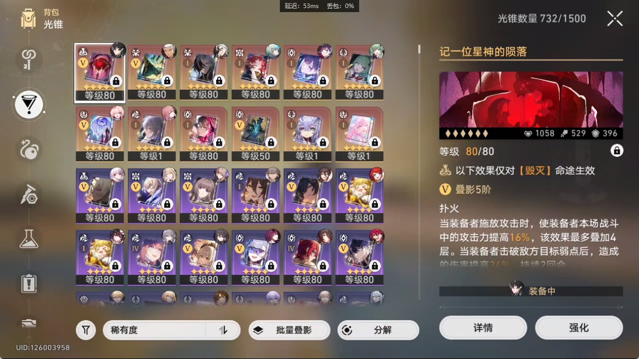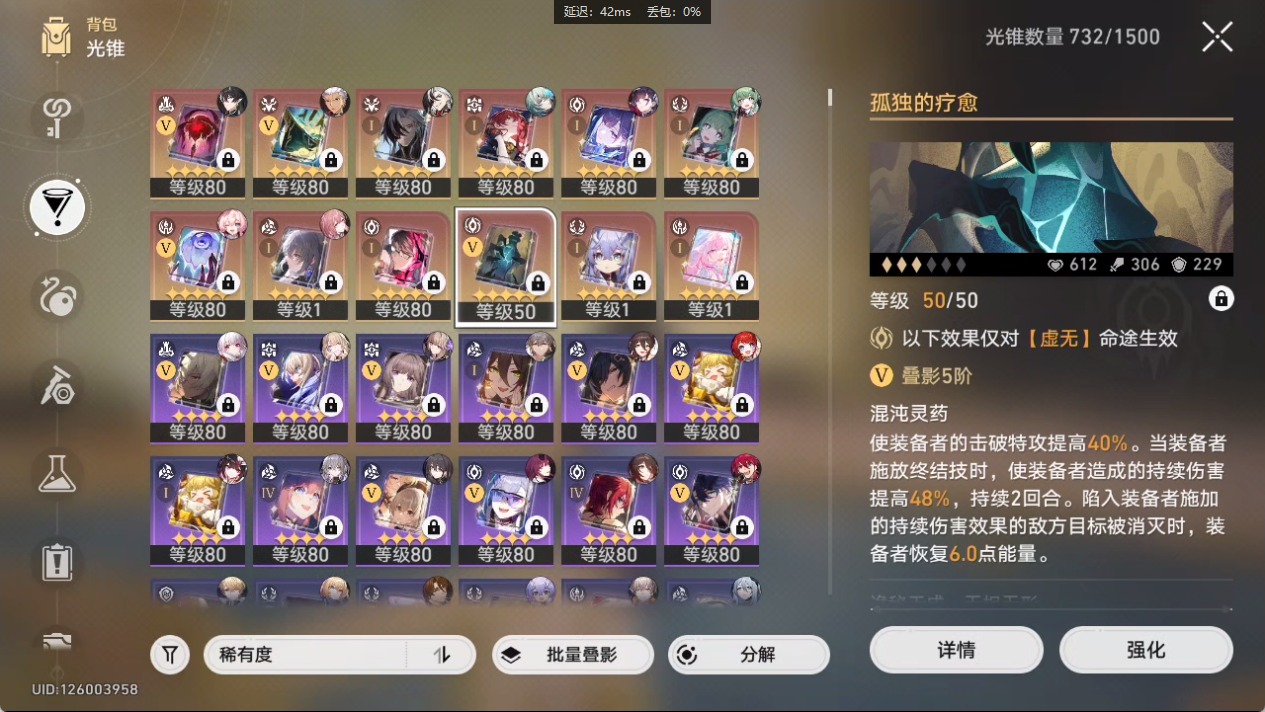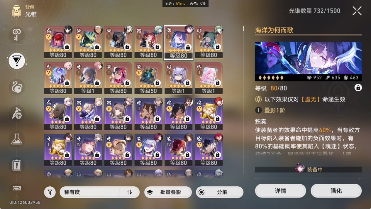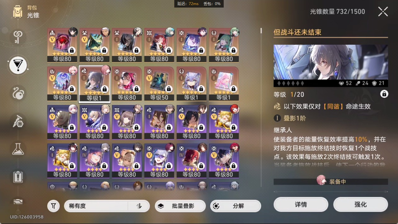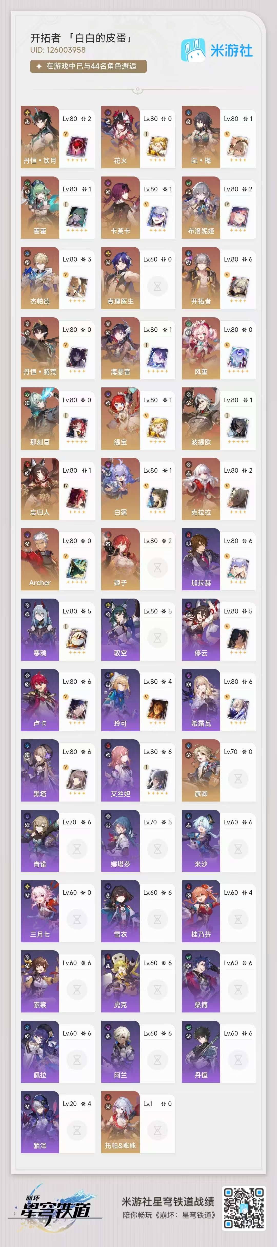 [14525629]【总黄数】:35 【3命金色角色】:3命杰帕德 【2命金色角色】:2命姬子2命布洛妮娅2命克拉拉2命丹恒•饮月 【1命金色角色】:1命忘归人1命缇宝1命海瑟音1命波提欧1命卡芙卡1命白露1命藿藿1命阮•梅 【0命金色角色】:0命那刻夏0命风堇0命archer0命丹恒·腾荒0命彦卿0命托帕账账0命真理医生0命花火 【精5武器】:精5记忆永不落幕精5记一位星神的陨落精5星海巡航 【精1武器】:精1驶向第二次生命精1海洋为何而歌精1时节不居精1以世界之名精1但战斗还未结束精1银河铁道之夜精1惊魂夜精1孤独的疗愈精1爱如此刻永恒