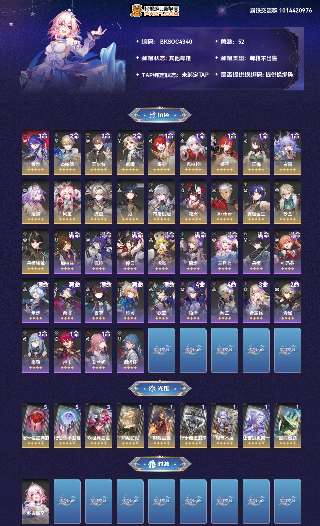 【崩坏·星穹铁道】【lyxq7849】冒险等级:70,男主,五星数量:28,绑定情况:邮箱__五星角色:黄泉 3命|杰帕德 2命|瓦尔特 2命|彦卿 2命|缇宝 1命|克拉拉 1命|姬子 1命|阮·梅 1命|白露 1命|遐蝶|风堇|流萤|刃|布洛妮娅|花火|archer|真理医生|砂金|丹恒·腾荒__五星光锥:记一位星神的陨落 5精|记忆永不落幕 5精|以世界之名 3精|如泥酣眠|游戏尘寰|行于流逝的岸|时节不居|让告别,更美一些|星海巡航,【邮箱不出售】