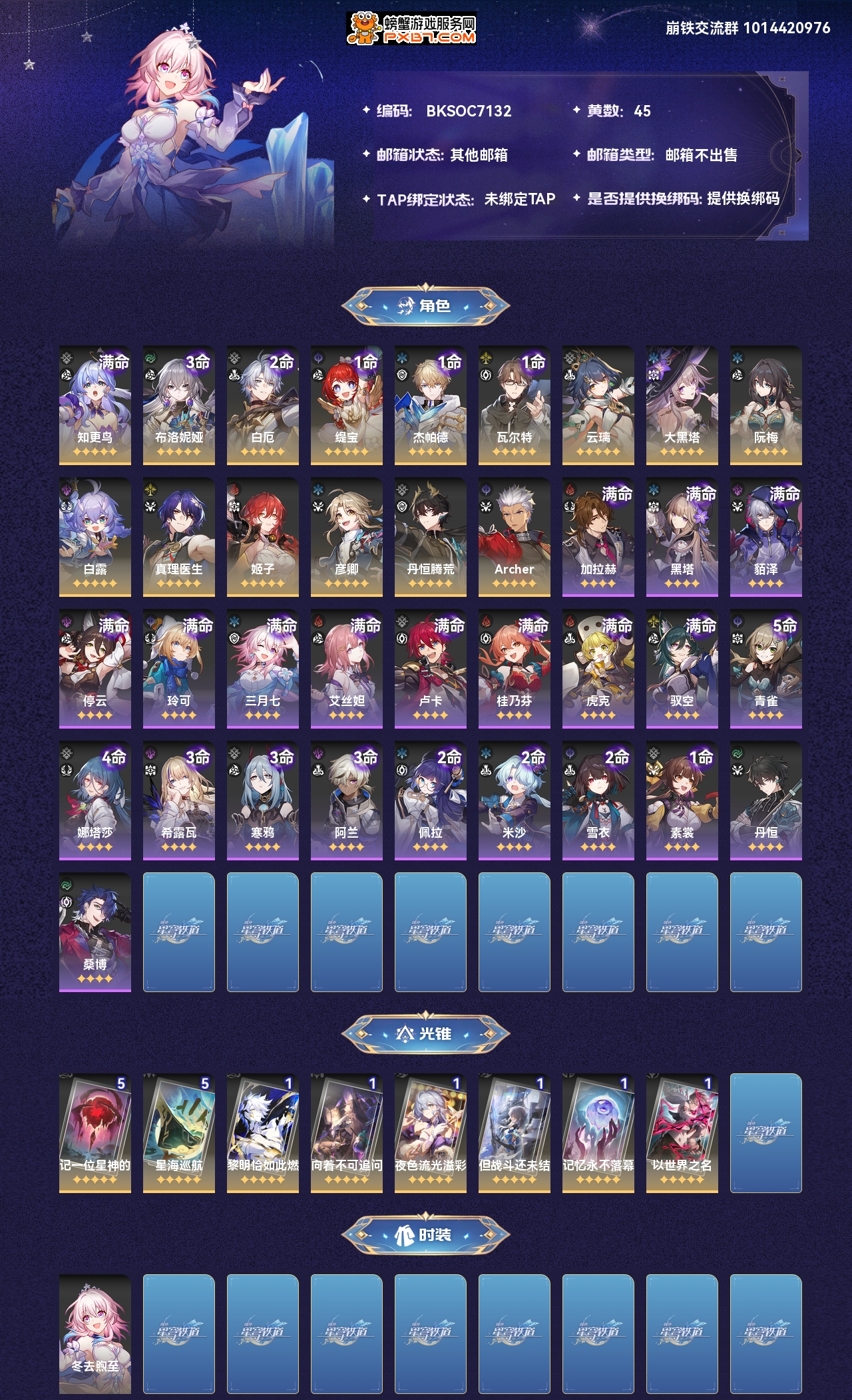 【崩坏·星穹铁道】【lyxq7858】冒险等级:70,男主,五星数量:23,绑定情况:邮箱__五星角色:知更鸟 6命|布洛妮娅 3命|白厄 2命|缇宝 1命|杰帕德 1命|瓦尔特 1命|云璃|大黑塔|阮·梅|白露|真理医生|姬子|彦卿|丹恒·腾荒|archer__五星光锥:记一位星神的陨落 5精|星海巡航 5精|黎明恰如此燃烧|向着不可追问处|夜色流光溢彩|但战斗还未结束|记忆永不落幕|以世界之名,【邮箱不出售】
