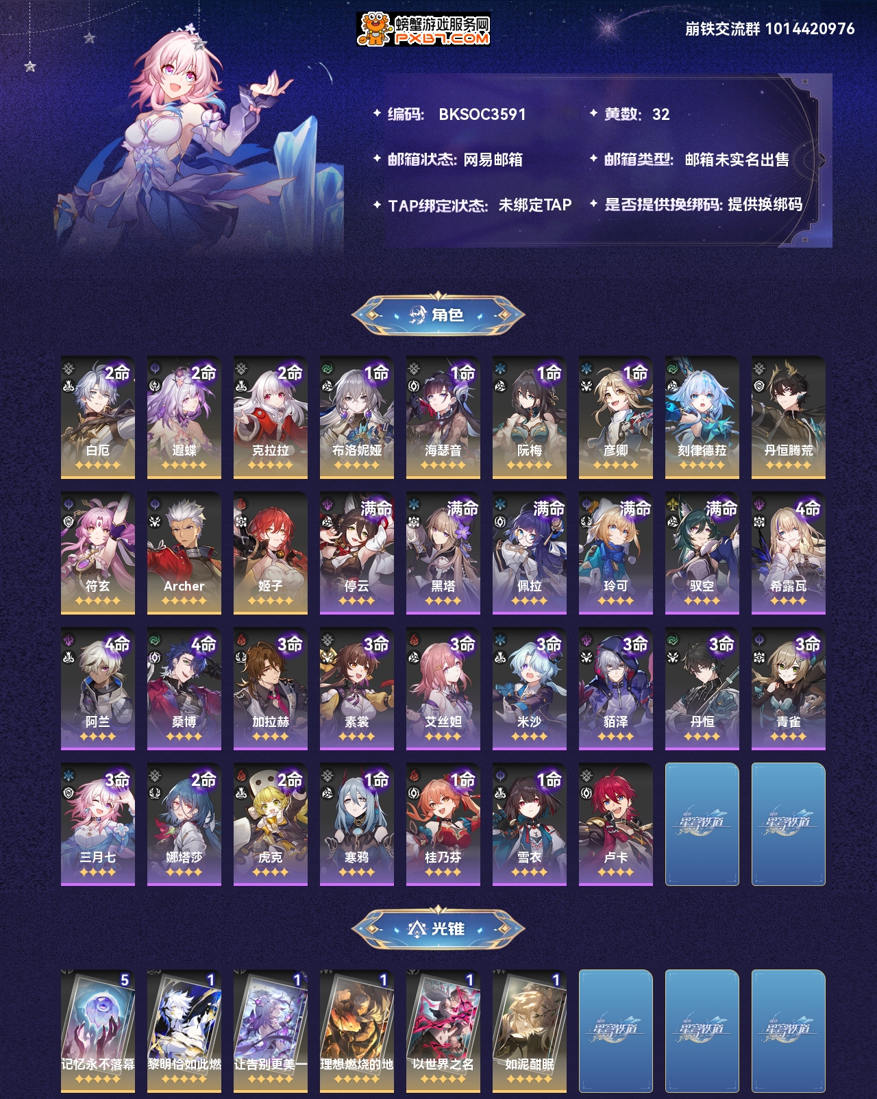 【崩坏·星穹铁道】【lyxq7819】冒险等级:68,男主,五星数量:18,绑定情况:邮箱__五星角色:白厄 2命|遐蝶 2命|克拉拉 2命|布洛妮娅 1命|海瑟音 1命|阮·梅 1命|彦卿 1命|刻律德菈|丹恒·腾荒|符玄|archer|姬子__五星光锥:记忆永不落幕 5精|黎明恰如此燃烧|让告别,更美一些|理想燃烧的地狱|以世界之名|如泥酣眠,【邮箱未实名】