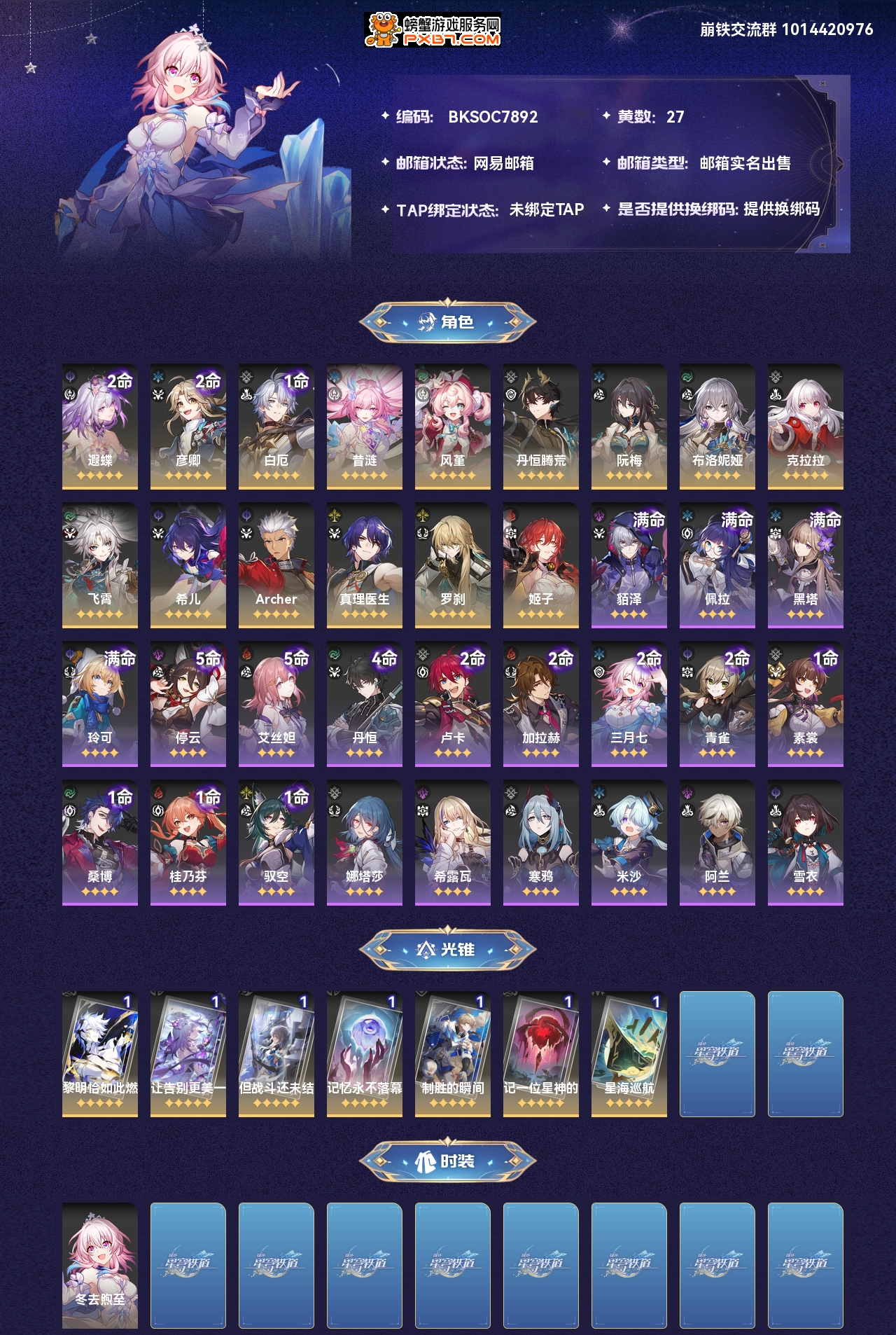 【崩坏·星穹铁道】【lyxq7823】冒险等级:66,女主,五星数量:22,绑定情况:邮箱__五星角色:遐蝶 2命|彦卿 2命|白厄 1命|昔涟|风堇|丹恒·腾荒|阮·梅|布洛妮娅|克拉拉|飞霄|希儿|archer|真理医生|罗刹|姬子__五星光锥:黎明恰如此燃烧|让告别,更美一些|但战斗还未结束|记忆永不落幕|制胜的瞬间|记一位星神的陨落|星海巡航,【邮箱已实名】