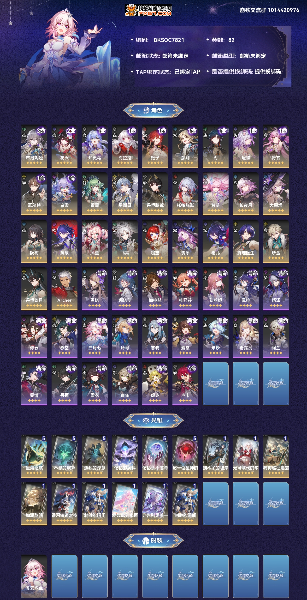 【崩坏·星穹铁道】【lyxq7892】冒险等级:70,女主,五星数量:43,绑定情况:taptap__五星角色:布洛妮娅 3命|花火 2命|知更鸟 1命|克拉拉 1命|姬子 1命|彦卿 1命|刃 1命|遐蝶 1命|符玄 1命|瓦尔特 1命|白露 1命|藿藿|星期日|丹恒·腾荒|托帕账账|昔涟|长夜月|大黑塔|阮·梅|黄泉|风堇|飞霄|缇宝|翡翠|希儿|真理医生|砂金|丹恒·饮月|archer__五星光锥:星海巡航 5精|不息的演算 5精|孤独的疗愈 5精|记忆的质料 5精|记忆永不落幕 5精|记一位星神的陨落 5精|到不了的彼岸|无可取代的东西|我将,巡征追猎|如泥酣眠|银河铁道之夜|制胜的瞬间|爱如此刻永恒|让告别,更美一些,【邮箱未绑定】