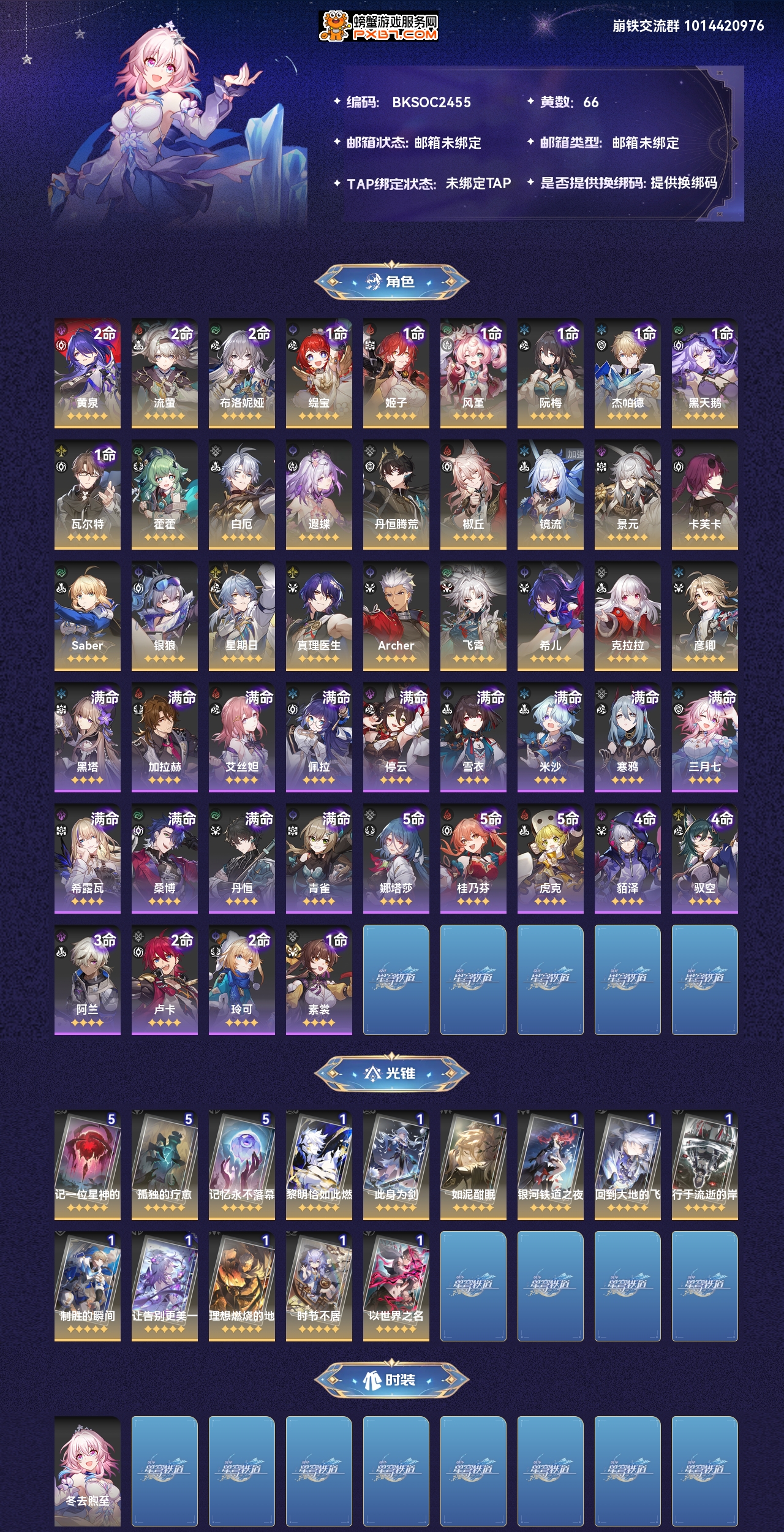 【崩坏·星穹铁道】【lyxq7868】冒险等级:70,女主,五星数量:41,绑定情况:手机号__五星角色:黄泉 2命|流萤 2命|布洛妮娅 2命|缇宝 1命|姬子 1命|风堇 1命|阮·梅 1命|杰帕德 1命|黑天鹅 1命|瓦尔特 1命|藿藿|白厄|遐蝶|丹恒·腾荒|椒丘|镜流|景元|卡芙卡|saber|银狼|星期日|真理医生|archer|飞霄|希儿|克拉拉|彦卿__五星光锥:记一位星神的陨落 5精|孤独的疗愈 5精|记忆永不落幕 5精|黎明恰如此燃烧|此身为剑|如泥酣眠|银河铁道之夜|回到大地的飞行|行于流逝的岸|制胜的瞬间|让告别,更美一些|理想燃烧的地狱|时节不居|以世界之名,【邮箱未绑定】