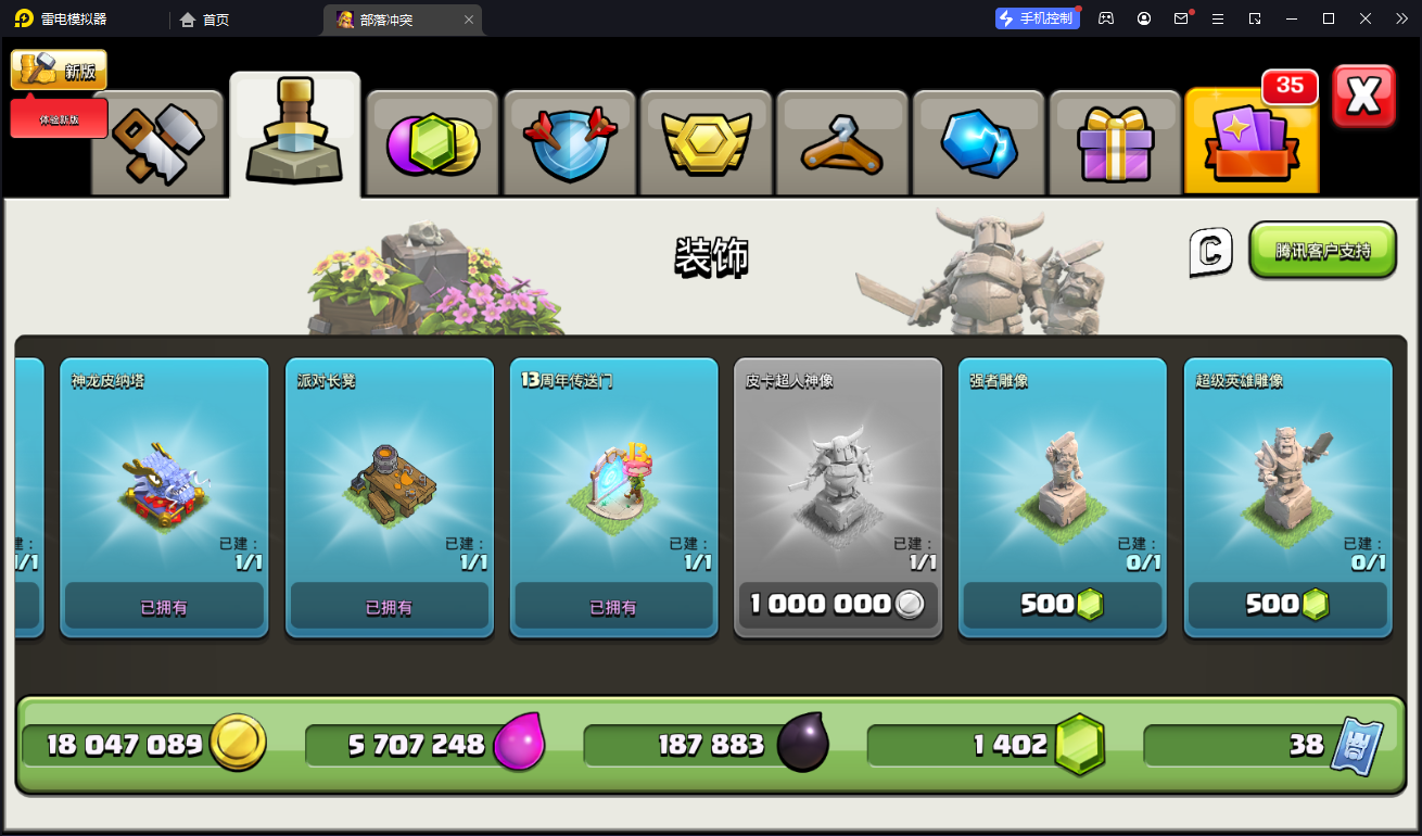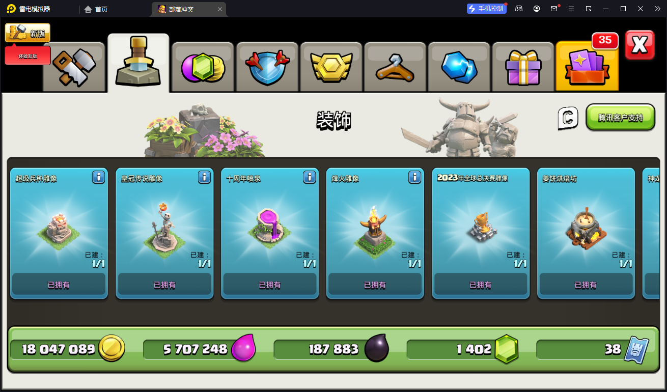 [14591054]t12266国服不分系统 q/v互通【 262级】18 本10 夜 场景13 皮肤48 宝石1402五王等级:102 100 90 79 55装备技能: 11级拳套 2级冰箭 2级火球 27级火箭繁荣度等级:118稀有皮肤:摘星侦查员 托塔天王李靖 场景:部落工坊 海上基地 冰天雪地 狂野丛林 像素世界 原始秘地 皇家竞技场 缤纷乐园 魔法世界 南瓜墓园 幽静丛林 哥布林洞窟 clash-a-rama