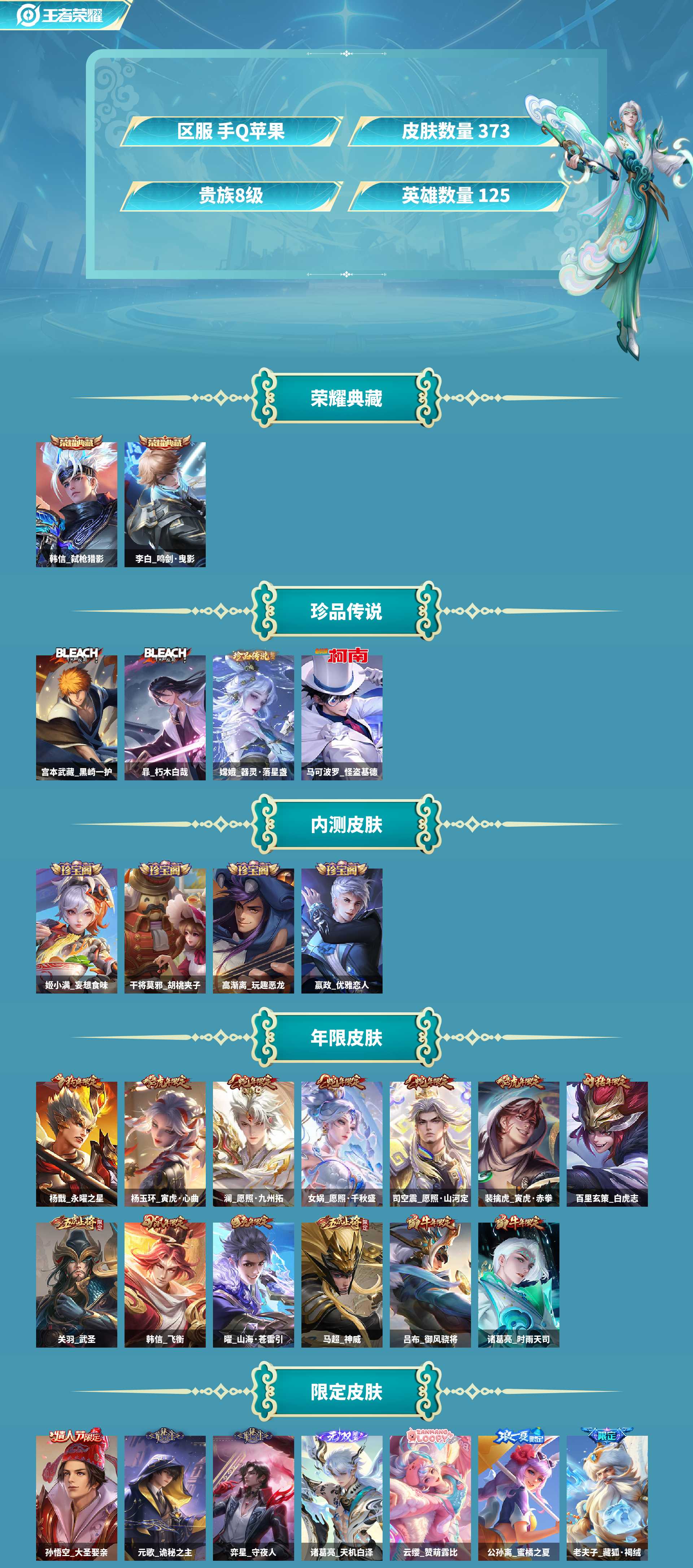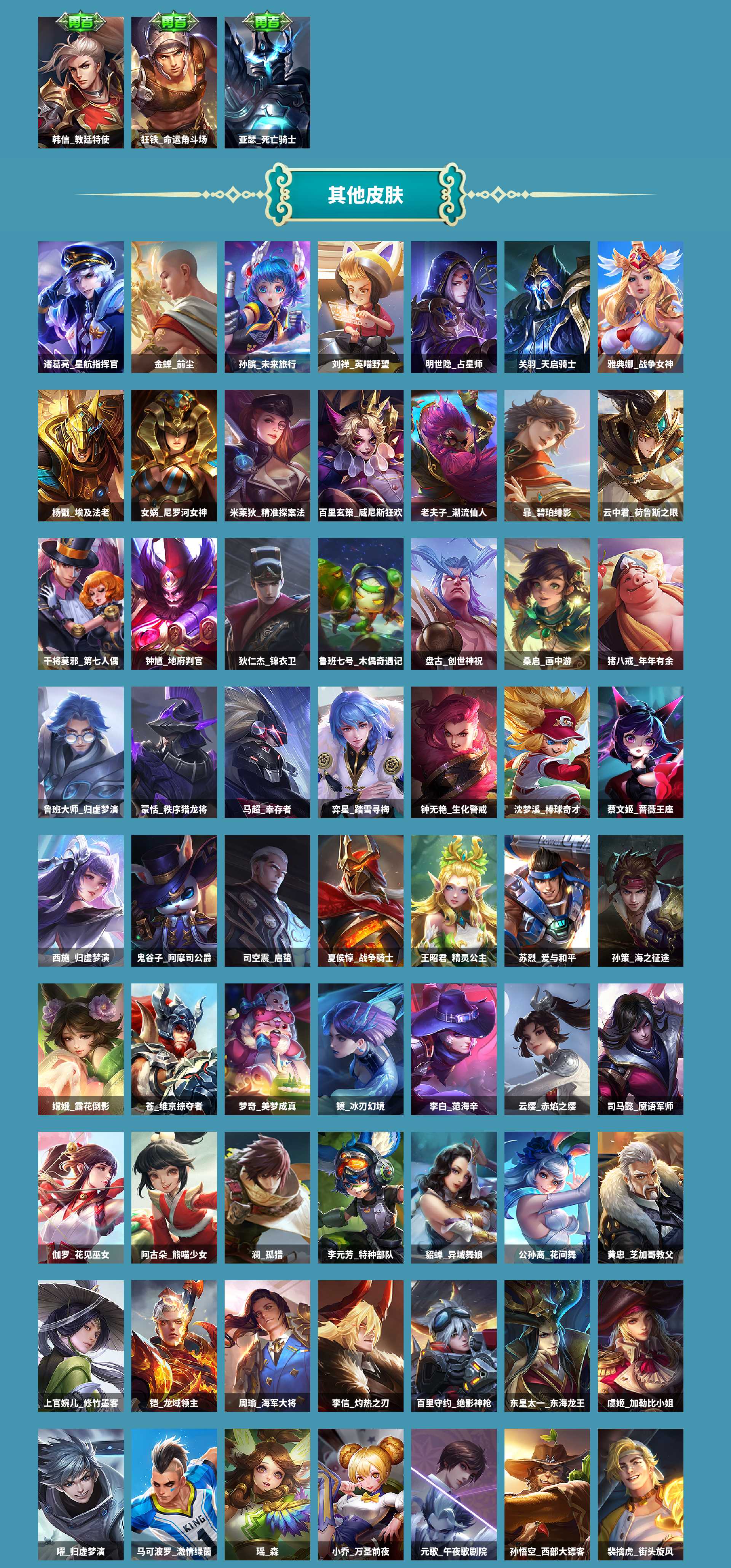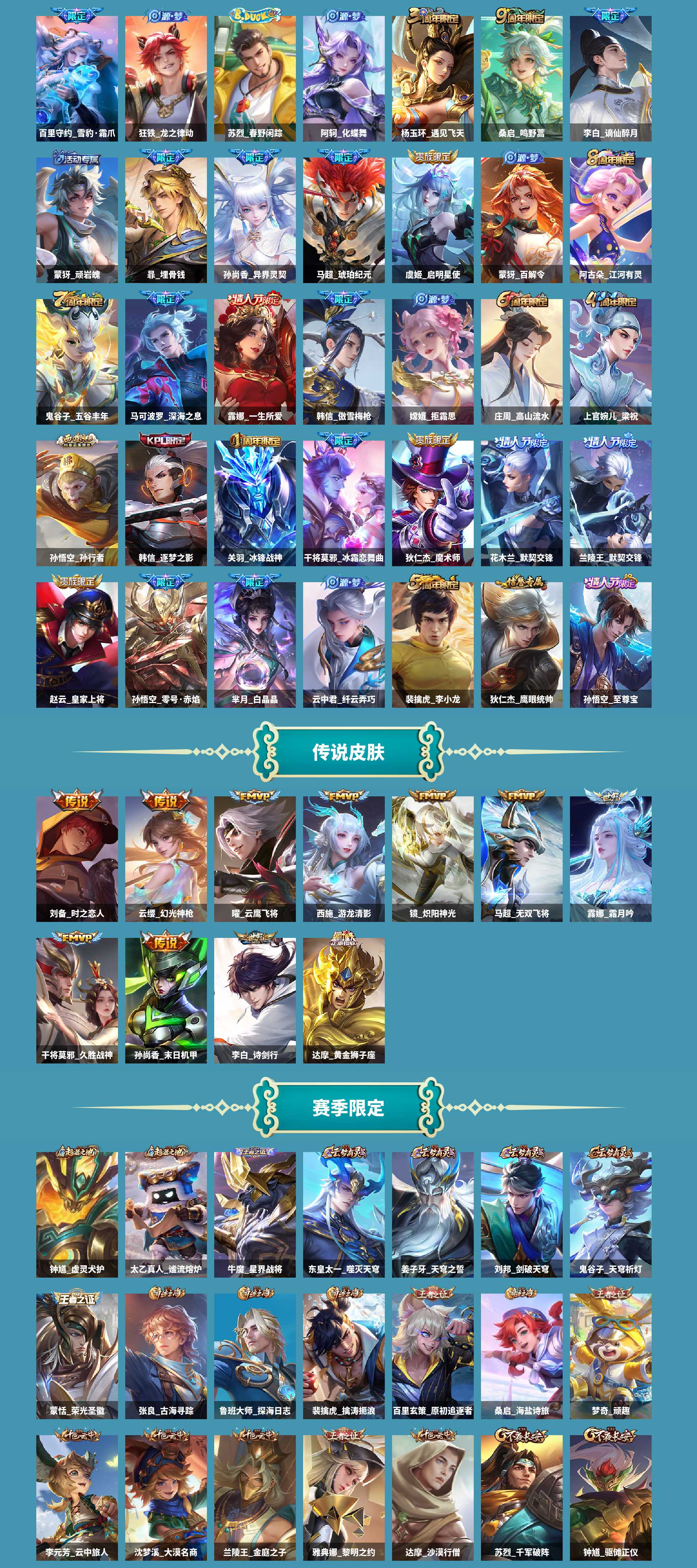 al614770 【极品紫螳螂无敌战神都市猎人粉熊背包红眼罩m4五爪金龙 6粉5特效1车 连体王者376皮28传说4珍品2水晶1无双】 皮肤数375 典藏皮肤数2 无双皮肤数1 传说皮肤数28 珍品传说皮数4 史诗皮肤数113 英雄数126 贵族等级【文本】贵族8级 【贵族8级】 【可排位】 【否】 【不支持】 荣耀典藏2 珍品传说4 内测皮肤4 年限皮肤13 限定皮肤128 赛季限定29 史诗皮肤112 战令限定30 勇者皮肤155 其他皮肤68 荣耀典藏:韩信弑呛猎影,李白鸣剑曳影; 珍品传说:宫本武藏黑崎一护,暃朽木白哉,嫦娥器灵落星盏,马可波罗怪盗基德; 内测皮肤:姬小满妄想食味,干将莫邪胡桃夹子,高渐离玩趣恶龙,嬴政优雅恋人; 年限皮肤:杨戬永曜之星,杨玉环寅虎心曲,澜愿照九州拓,女娲愿照千秋盛,司空震愿照山河定,裴擒虎寅虎赤拳,百里玄策白虎志,关羽武圣,韩信飞衡,曜山海苍雷引,马超神威,吕布御风骁将,诸葛亮时雨天司; 限定皮肤:孙悟空大圣娶亲,元歌诡秘之主,杨戬永曜之星,弈星守夜人,诸葛亮天机白泽,杨玉环寅虎心曲,云缨赞萌露比,后羿石田雨龙,白起死霸装,宫本武藏黑崎一护,暃朽木白哉,姬小满小满鸭,公孙离蜜橘之夏,老夫子_藏狐·褐绒,百里守约雪豹霜爪,狂铁龙之律动,苏烈春野闲踪,钟馗虚灵犬护,阿轲化蝶舞,赵怀真器灵浮梦炉,嫦娥器灵落星盏,澜愿照九州拓,女娲愿照千秋盛,司空震愿照山河定,马超访茗客,孙膑茶境仙,太乙真人谧流熔炉,牛魔星界战将,老夫子百相守梦,百里守约百相守梦,吕布逐霄战戟,马可波罗怪盗基德,杨玉环遇见飞天,桑启鸣野蒿,李白谪仙醉月,亚连破空之剑,孙悟空神迹守卫,东皇太一噬灭天穹,盘古敬我三分,蒙犽顽岩魄,蔡文姬夏日便利店,虞姬夏日便利店,姬小满妄想食味,暃埋骨钱,孙尚香异界灵契,姜子牙天穹之誓,刘邦剑破天穹,沈梦溪龙舞盛年,马超琥珀纪元,裴擒虎寅虎赤拳,虞姬启明星使,高渐离燃音魔法,妲己灵卜魔法,鬼谷子天穹祈灯,蒙恬荣光圣徽,蒙犽百解令,百里玄策白虎志,司空震地狱燃心,阿古朵江河有灵,关羽武圣,张良古海寻踪,艾琳流音漫舞,鲁班大师探海日志,裴擒虎擒涛扼浪,暃星界游侠,韩信飞衡,曜山海苍雷引,干将莫邪胡桃夹子,百里玄策原初追逐者,嫦娥暖冬兔眠,桑启海盐诗旅,梦奇顽趣,太乙真人华丽摇滚,元歌无心,鬼谷子五谷丰年,李元芳云中旅人,狂铁电玩高手,王昭君午后时光,马可波罗深海之息,沈梦溪大漠名商,兰陵王金庭之子,雅典娜黎明之约,黄忠火炮绅士,露娜一生所爱,芈月幻夜卜梦,高渐离玩趣恶龙,韩信傲雪梅呛,达摩沙漠行僧,嫦娥拒霜思,马超神威,庄周高山流水,上官婉儿梁祝,孙悟空孙行者,苏烈千军破阵,老夫子航海奇遇记,嬴政优雅恋人,韩信逐梦之影,墨子神迹守卫,钟馗驱傩正仪,米莱狄胡桃异想国,关羽冰锋战神,程咬金演武夺筹,达摩星际陆战队,元歌云间偶戏,干将莫邪冰霜恋舞曲,狄仁杰魔术师,吕布御风骁将,花木兰默契交锋,兰陵王默契交锋,诸葛亮时雨天司,赵云皇家上将,孙悟空零号赤焰,芈月白晶晶,亚瑟潮玩骑士王,狄仁杰万华元夜,项羽海滩派对,云中君纤云弄巧,蒙犽狂想玩偶喵,裴擒虎李小龙,雅典娜单词大作战,鬼谷子原初探秘者,狄仁杰鹰眼统帅,老夫子醍醐杖,狄仁杰阴阳师,明世隐疑决卦,孙悟空至尊宝,牛魔御旌,狂铁御狮; 赛季限定:甄姬逆浪荇歌,钟馗虚灵犬护,太乙真人谧流熔炉,牛魔星界战将,东皇太一噬灭天穹,姜子牙天穹之誓,刘邦剑破天穹,鬼谷子天穹祈灯,蒙恬荣光圣徽,张良古海寻踪,鲁班大师探海日志,裴擒虎擒涛扼浪,百里玄策原初追逐者,桑启海盐诗旅,梦奇顽趣,李元芳云中