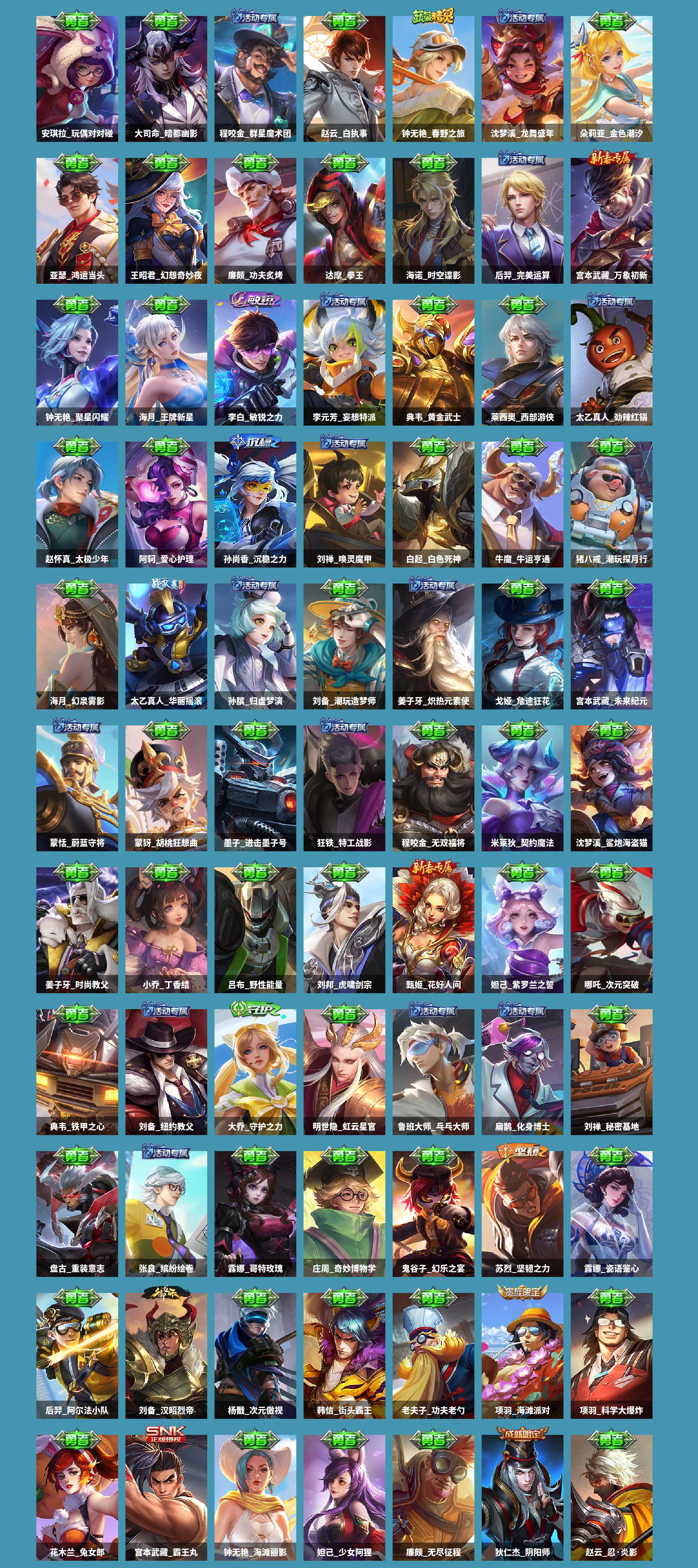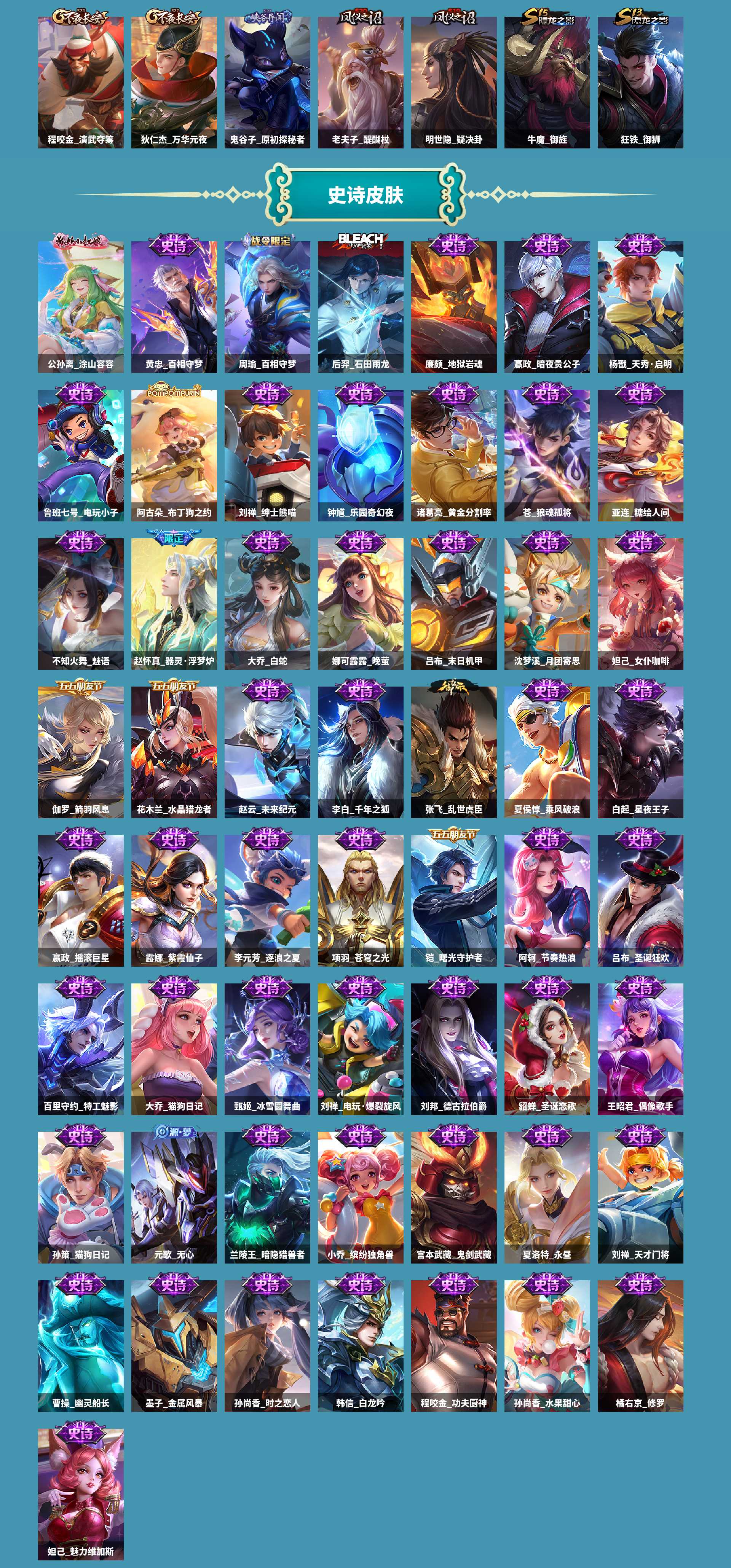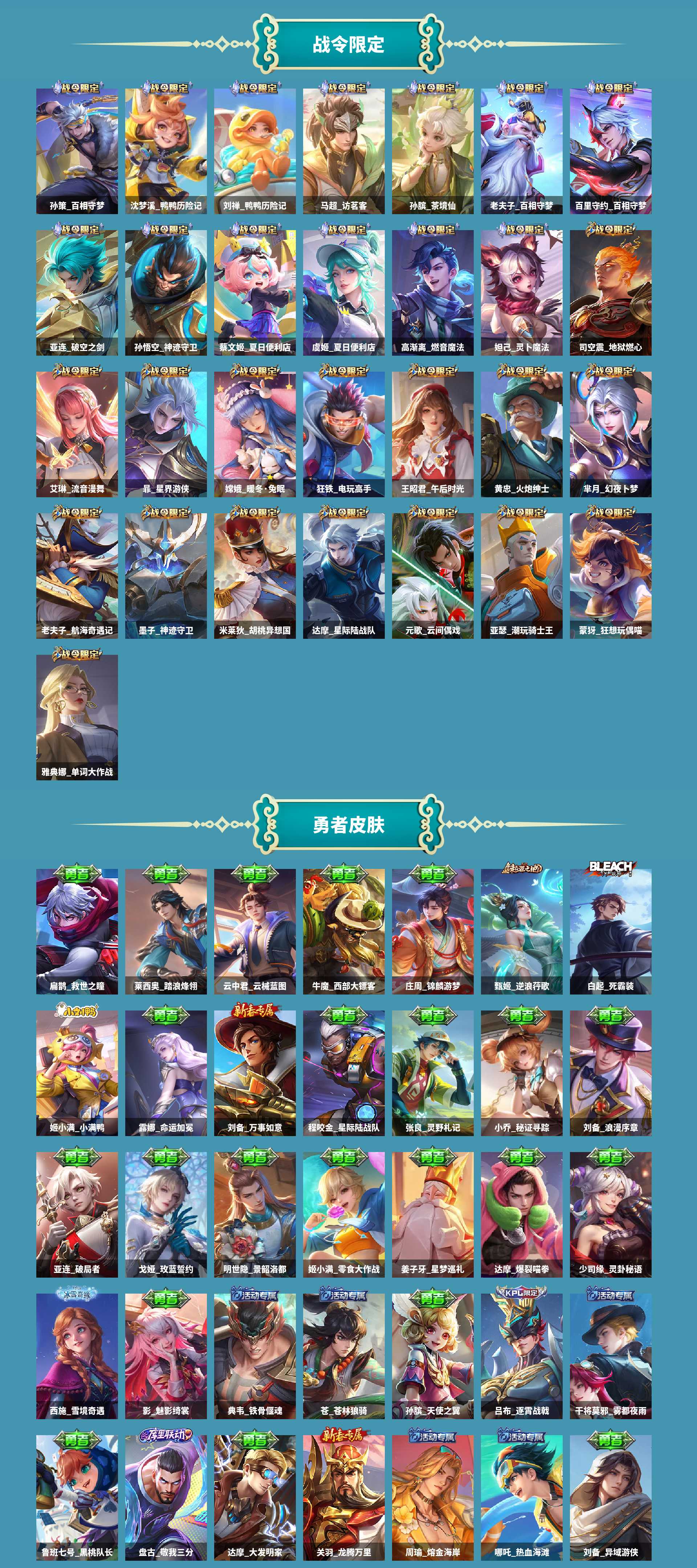 al614770 【极品紫螳螂无敌战神都市猎人粉熊背包红眼罩m4五爪金龙 6粉5特效1车 连体王者376皮28传说4珍品2水晶1无双】 皮肤数375 典藏皮肤数2 无双皮肤数1 传说皮肤数28 珍品传说皮数4 史诗皮肤数113 英雄数126 贵族等级【文本】贵族8级 【贵族8级】 【可排位】 【否】 【不支持】 荣耀典藏2 珍品传说4 内测皮肤4 年限皮肤13 限定皮肤128 赛季限定29 史诗皮肤112 战令限定30 勇者皮肤155 其他皮肤68 荣耀典藏:韩信弑呛猎影,李白鸣剑曳影; 珍品传说:宫本武藏黑崎一护,暃朽木白哉,嫦娥器灵落星盏,马可波罗怪盗基德; 内测皮肤:姬小满妄想食味,干将莫邪胡桃夹子,高渐离玩趣恶龙,嬴政优雅恋人; 年限皮肤:杨戬永曜之星,杨玉环寅虎心曲,澜愿照九州拓,女娲愿照千秋盛,司空震愿照山河定,裴擒虎寅虎赤拳,百里玄策白虎志,关羽武圣,韩信飞衡,曜山海苍雷引,马超神威,吕布御风骁将,诸葛亮时雨天司; 限定皮肤:孙悟空大圣娶亲,元歌诡秘之主,杨戬永曜之星,弈星守夜人,诸葛亮天机白泽,杨玉环寅虎心曲,云缨赞萌露比,后羿石田雨龙,白起死霸装,宫本武藏黑崎一护,暃朽木白哉,姬小满小满鸭,公孙离蜜橘之夏,老夫子_藏狐·褐绒,百里守约雪豹霜爪,狂铁龙之律动,苏烈春野闲踪,钟馗虚灵犬护,阿轲化蝶舞,赵怀真器灵浮梦炉,嫦娥器灵落星盏,澜愿照九州拓,女娲愿照千秋盛,司空震愿照山河定,马超访茗客,孙膑茶境仙,太乙真人谧流熔炉,牛魔星界战将,老夫子百相守梦,百里守约百相守梦,吕布逐霄战戟,马可波罗怪盗基德,杨玉环遇见飞天,桑启鸣野蒿,李白谪仙醉月,亚连破空之剑,孙悟空神迹守卫,东皇太一噬灭天穹,盘古敬我三分,蒙犽顽岩魄,蔡文姬夏日便利店,虞姬夏日便利店,姬小满妄想食味,暃埋骨钱,孙尚香异界灵契,姜子牙天穹之誓,刘邦剑破天穹,沈梦溪龙舞盛年,马超琥珀纪元,裴擒虎寅虎赤拳,虞姬启明星使,高渐离燃音魔法,妲己灵卜魔法,鬼谷子天穹祈灯,蒙恬荣光圣徽,蒙犽百解令,百里玄策白虎志,司空震地狱燃心,阿古朵江河有灵,关羽武圣,张良古海寻踪,艾琳流音漫舞,鲁班大师探海日志,裴擒虎擒涛扼浪,暃星界游侠,韩信飞衡,曜山海苍雷引,干将莫邪胡桃夹子,百里玄策原初追逐者,嫦娥暖冬兔眠,桑启海盐诗旅,梦奇顽趣,太乙真人华丽摇滚,元歌无心,鬼谷子五谷丰年,李元芳云中旅人,狂铁电玩高手,王昭君午后时光,马可波罗深海之息,沈梦溪大漠名商,兰陵王金庭之子,雅典娜黎明之约,黄忠火炮绅士,露娜一生所爱,芈月幻夜卜梦,高渐离玩趣恶龙,韩信傲雪梅呛,达摩沙漠行僧,嫦娥拒霜思,马超神威,庄周高山流水,上官婉儿梁祝,孙悟空孙行者,苏烈千军破阵,老夫子航海奇遇记,嬴政优雅恋人,韩信逐梦之影,墨子神迹守卫,钟馗驱傩正仪,米莱狄胡桃异想国,关羽冰锋战神,程咬金演武夺筹,达摩星际陆战队,元歌云间偶戏,干将莫邪冰霜恋舞曲,狄仁杰魔术师,吕布御风骁将,花木兰默契交锋,兰陵王默契交锋,诸葛亮时雨天司,赵云皇家上将,孙悟空零号赤焰,芈月白晶晶,亚瑟潮玩骑士王,狄仁杰万华元夜,项羽海滩派对,云中君纤云弄巧,蒙犽狂想玩偶喵,裴擒虎李小龙,雅典娜单词大作战,鬼谷子原初探秘者,狄仁杰鹰眼统帅,老夫子醍醐杖,狄仁杰阴阳师,明世隐疑决卦,孙悟空至尊宝,牛魔御旌,狂铁御狮; 赛季限定:甄姬逆浪荇歌,钟馗虚灵犬护,太乙真人谧流熔炉,牛魔星界战将,东皇太一噬灭天穹,姜子牙天穹之誓,刘邦剑破天穹,鬼谷子天穹祈灯,蒙恬荣光圣徽,张良古海寻踪,鲁班大师探海日志,裴擒虎擒涛扼浪,百里玄策原初追逐者,桑启海盐诗旅,梦奇顽趣,李元芳云中