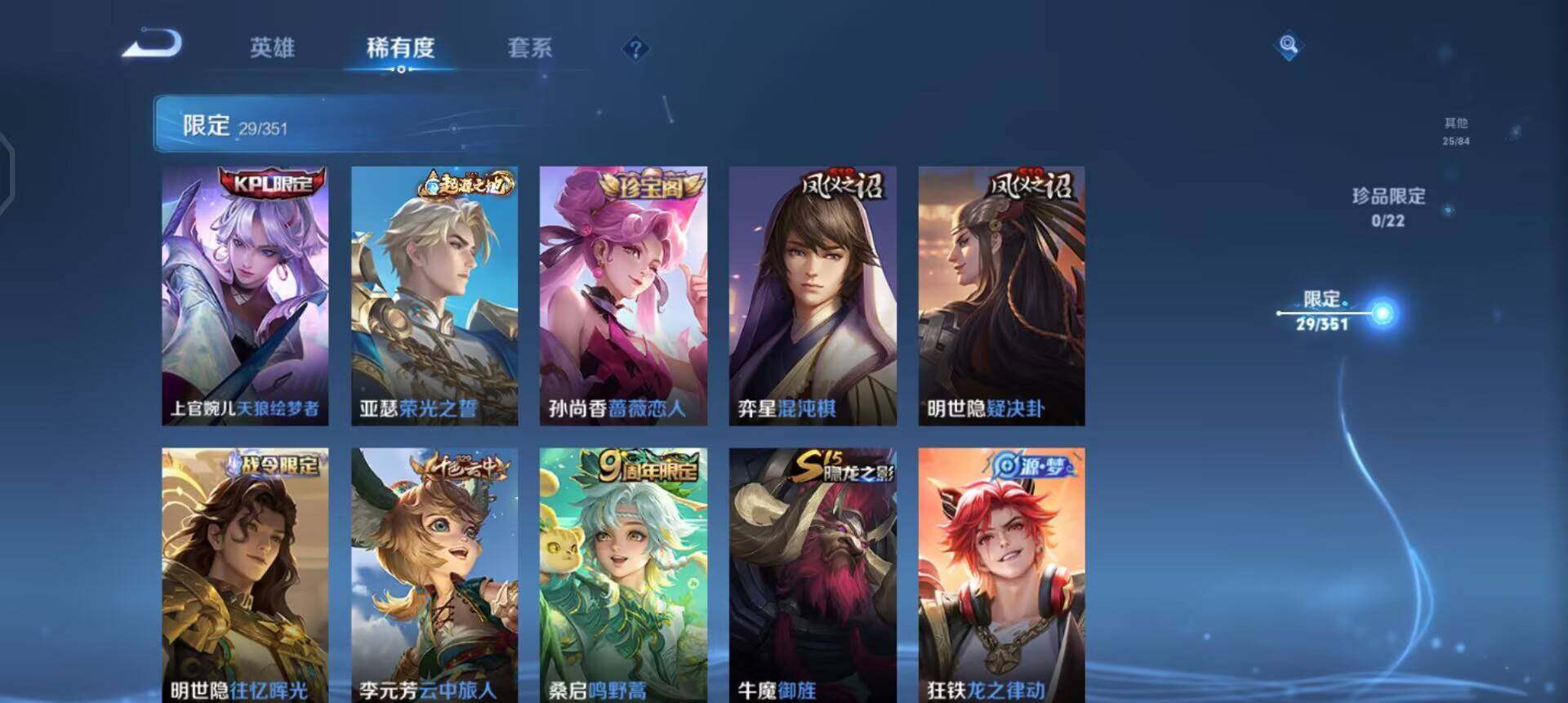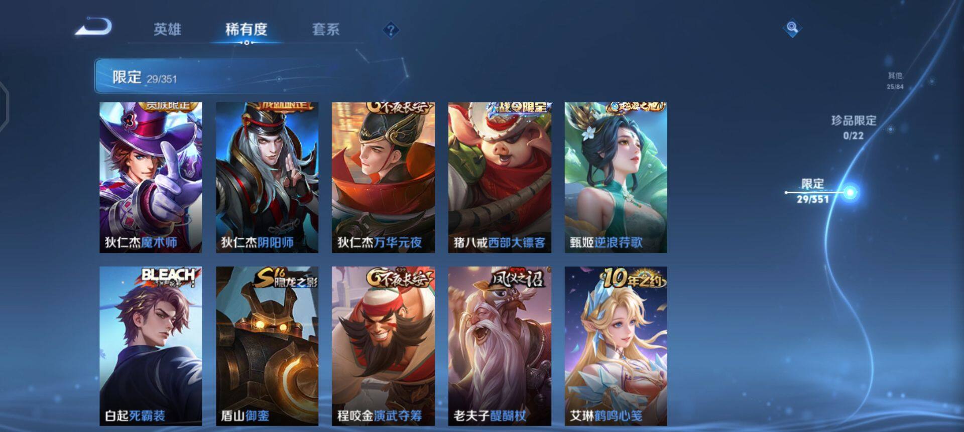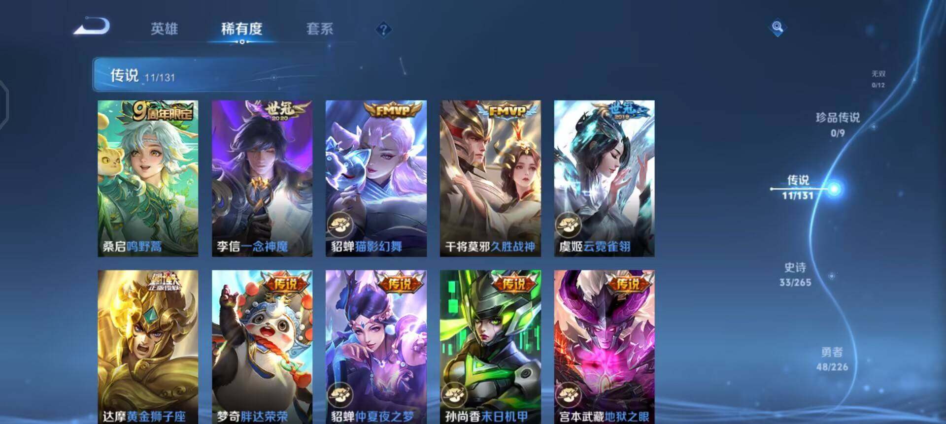 w10042 可立即换绑无需挂单养号 铭文满级 传说11 夺宝168 安卓q-v7-最强王者段位-113英雄-117皮肤-0典藏-0珍品无双-0无双-0珍品传说-11传说-33史诗 【传说皮肤】:桑启鸣野蒿,李信一念神魔,貂蝉猫影幻舞,干将莫邪久胜战神,虞姬云霓雀翎,达摩黄金狮子座,梦奇胖达荣荣,貂蝉仲夏夜之梦,孙尚香末日机甲,宫本武藏地狱之眼,狄仁杰超时空战士 【限定皮肤】:狄仁