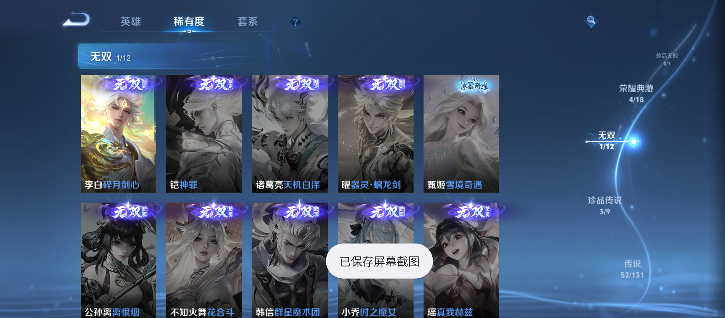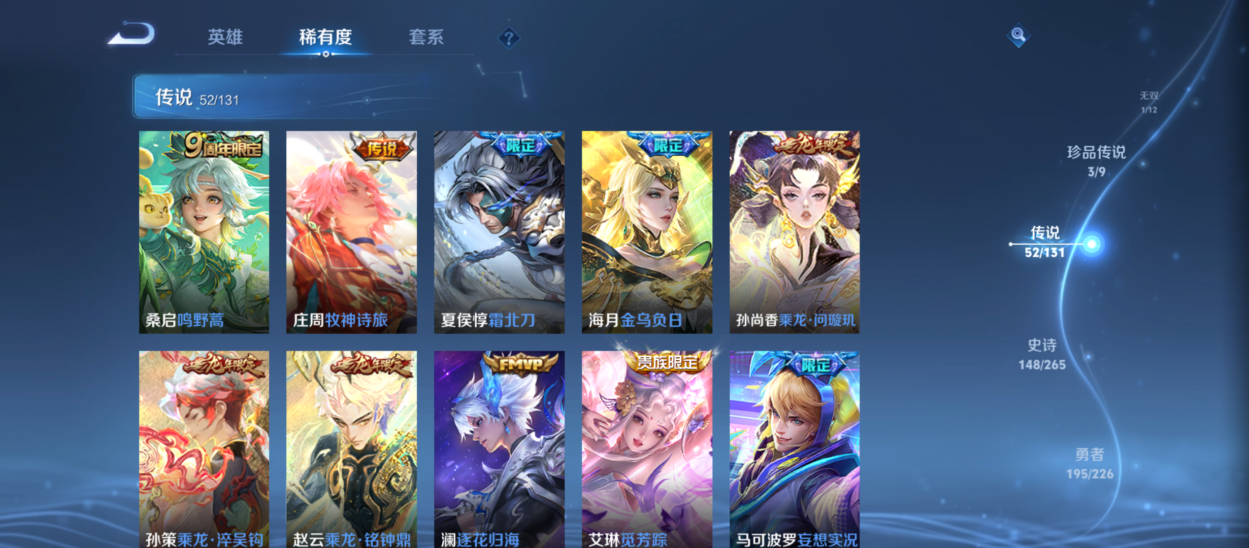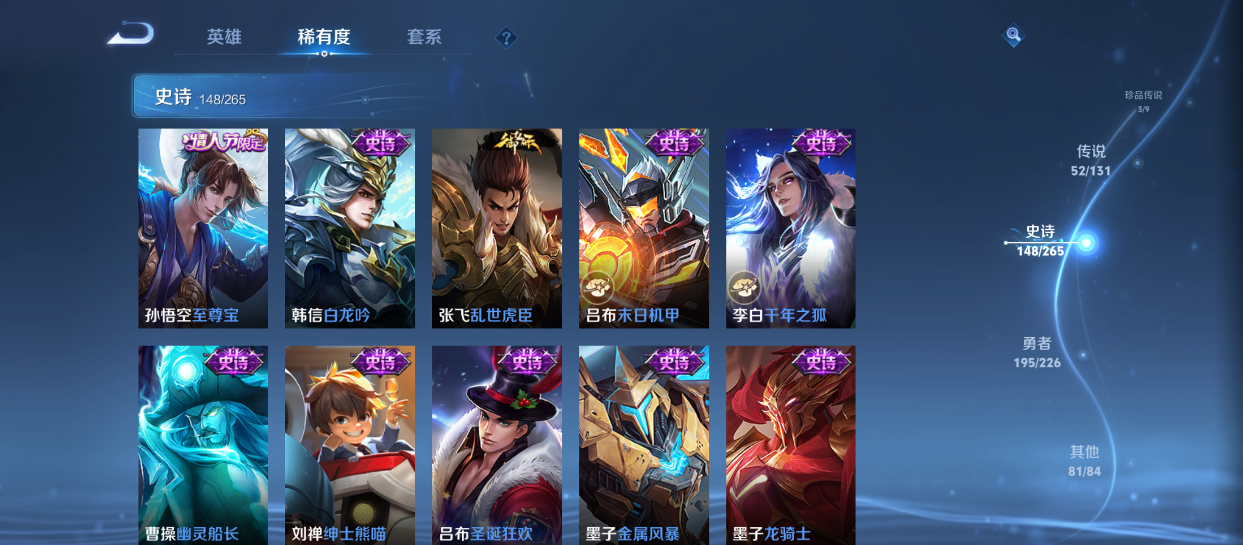 txwz20399 v10 484皮 4典藏(天鹅之梦,九霄神辉,赤影疾锋,鸣剑·曳影)1无双 ( 碎月剑心)3珍品(大耳狗之梦,兔狲·蓬尾,怪盗基德)52传说 (纵目迁山,霜北刀,飞鸢探春,神树通天,觅芳踪,超时空战士,冠军飞将,祈雪灵祝,千劫归真,幻光神呛,愿照·福禄聚,愿照·岁时盈,愿照·众生和,愿照·千秋盛,愿照·山河定,愿照·九州拓,鸣野蒿,妄想实况,画中仙,牧神诗旅,逐花归海,炽翼辉光,怒海麟威,地狱火,金乌负日,李 ,乘龙·铭钟鼎,乘龙·淬吴钩,乘龙·问璇玑,炽阳神光,地狱之眼,黄金白羊座,无双飞将,仲夏夜之梦,无限倾心,末日机甲,启明星使,山海·炽霜斩,诗剑行,黄金射手座,猫影幻舞,绯月行,武圣,一念神魔,时雨天司,零号·赤焰,白虎志,云鹰飞将,时之恋人,久胜战神,黄金狮子座,凤求凰)148史诗(至尊宝)