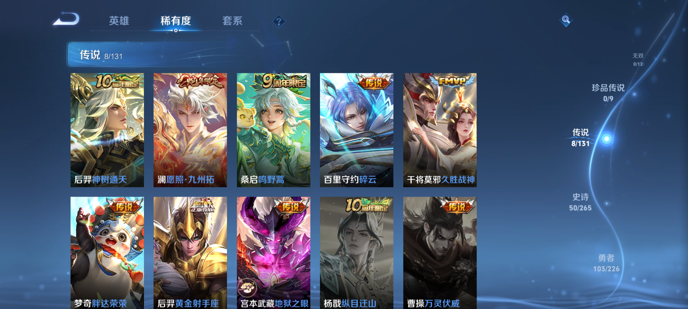 v5 198皮 1 典藏 银白咏叹调 8传说 神树通天,地狱之眼,胖达荣荣,久胜战神,愿照·九州拓,碎云,鸣野蒿,黄金射手座 50史诗 荣光圣徽,魅语,万灵启世,百相守梦,绅士熊喵,王者之锤,石田雨龙,原初追逐者,暗影游猎,功夫厨神,器灵·浮梦炉,节奏热浪,暗隐猎兽者,茶境仙,皇家上将,百相守梦,水晶猎龙者,星界战将,千年之狐,天才门将,心灵战警,乘风破浪,女仆咖啡,顽岩魄,心灵骇客,缤纷独角兽,鬼剑武藏,孙行者,偶像歌手,黎明之约,黄金分割率,修罗,逐浪之夏,琥珀纪元,百解令,特工魅影,冰雪圆舞曲,江河有灵,摇滚巨星,星夜王子,圣诞恋歌,金属风暴,梁祝,高山流水,未来纪元,水果甜心,纤云弄巧,李小龙,鹰眼统帅,魅力维加斯