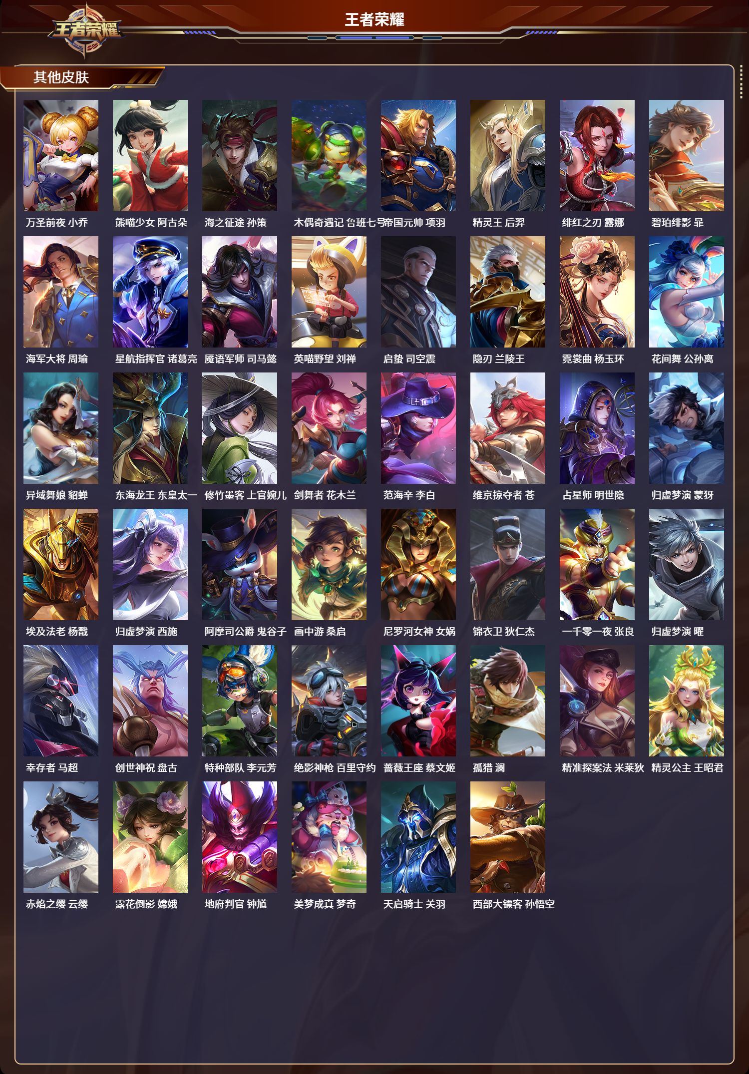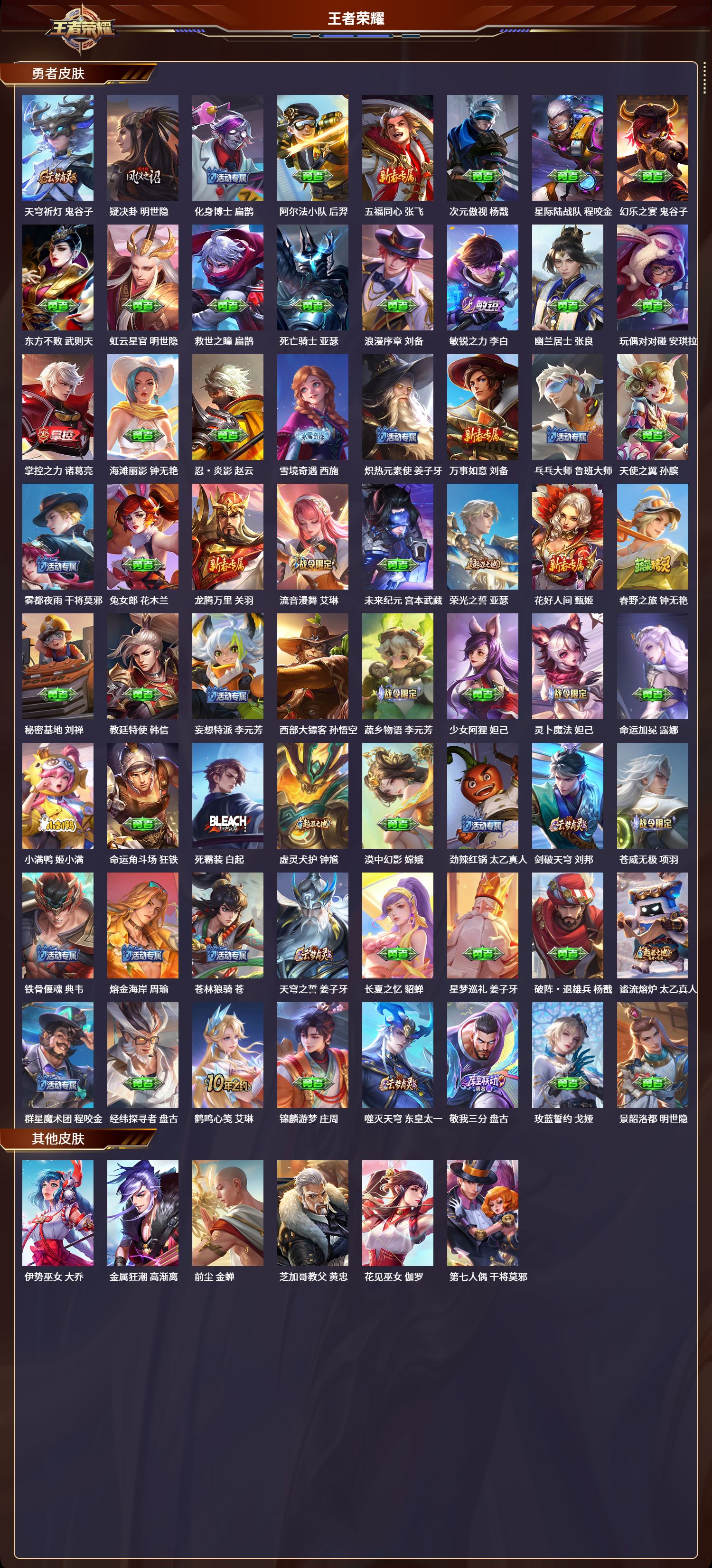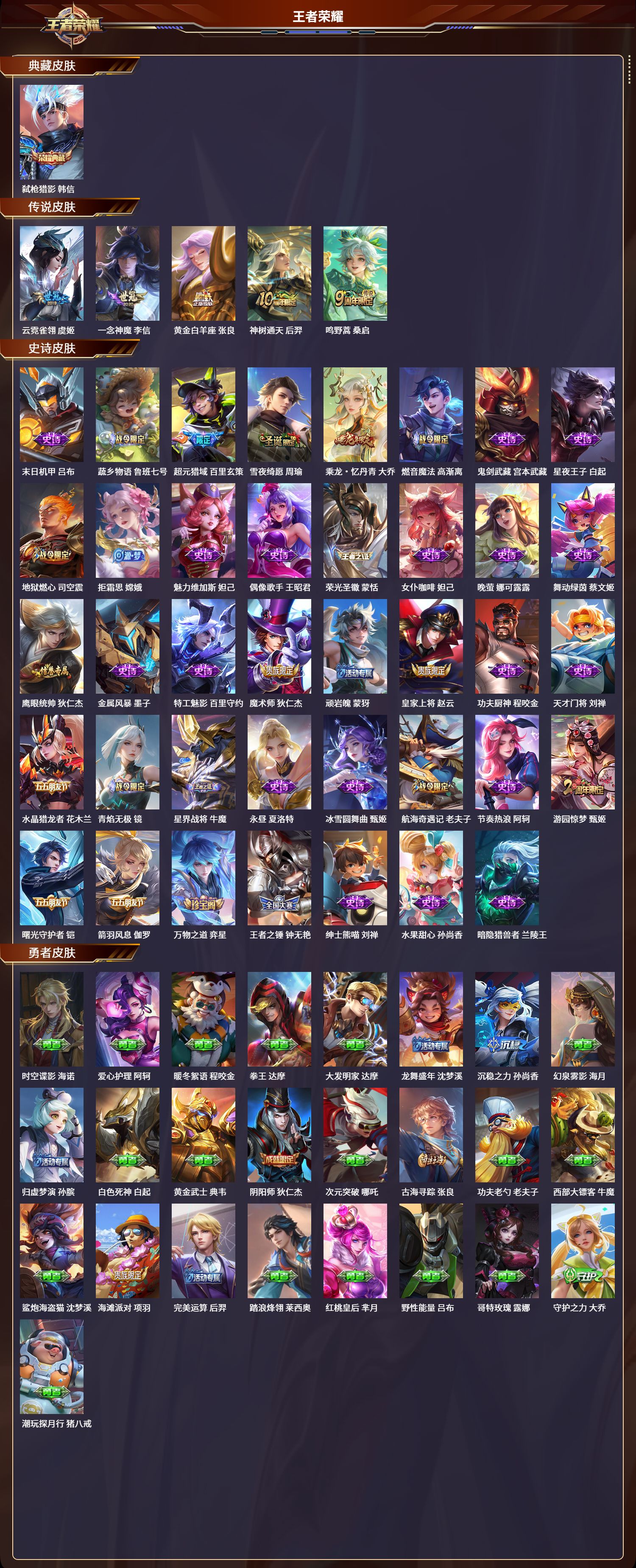 安卓qq/至尊星耀/185皮肤/126英雄/1典藏/0珍品无双/0无双/0珍品传说/5传说/39史诗/8稀有英雄【1 典藏皮肤】弑呛猎影 韩信【5 传说皮肤】云霓雀翎 虞姬一念神魔 李信黄金白羊座 张良神树通天 后羿鸣野蒿 桑启【39 史诗皮肤】末日机甲 吕布蔬乡物语 鲁班七号超元猎域 百里玄策雪夜绮愿 周瑜乘龙·忆丹青 大乔燃音魔法 高渐离鬼剑武藏 宫本武藏星夜王子 白