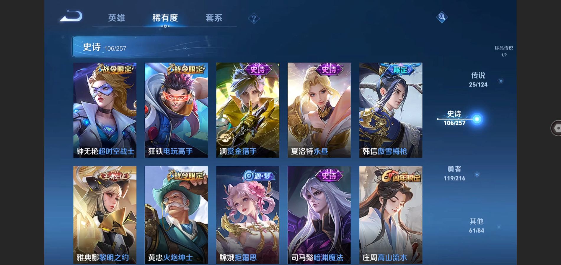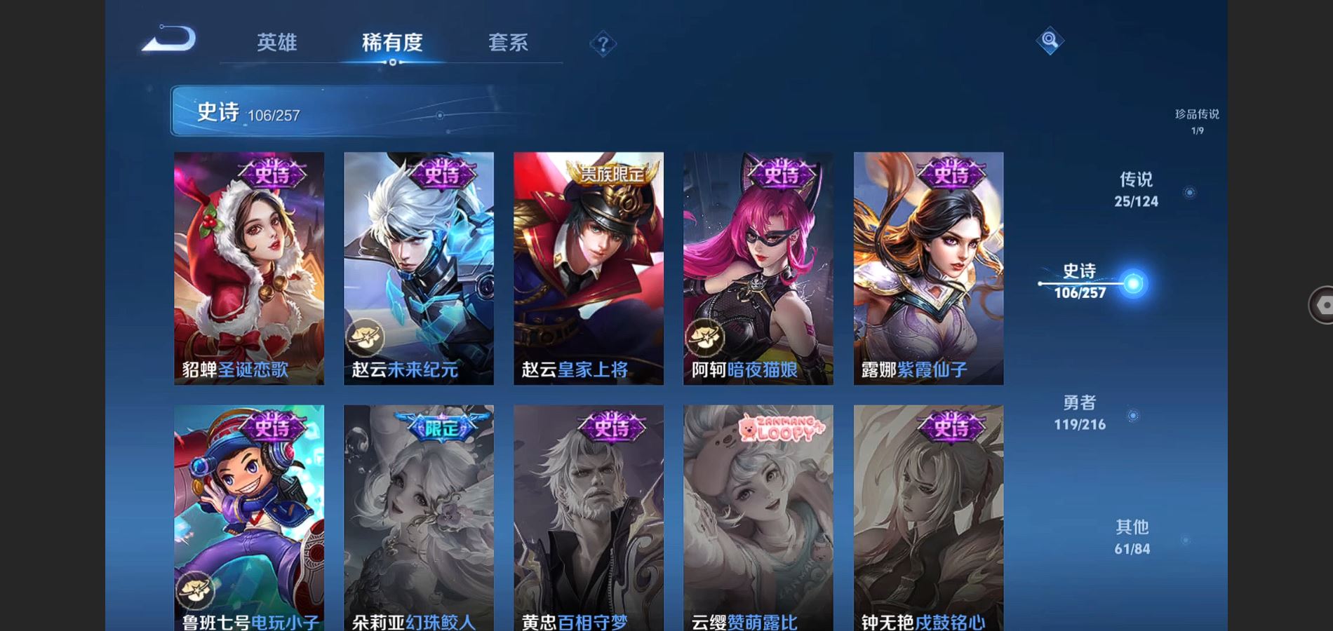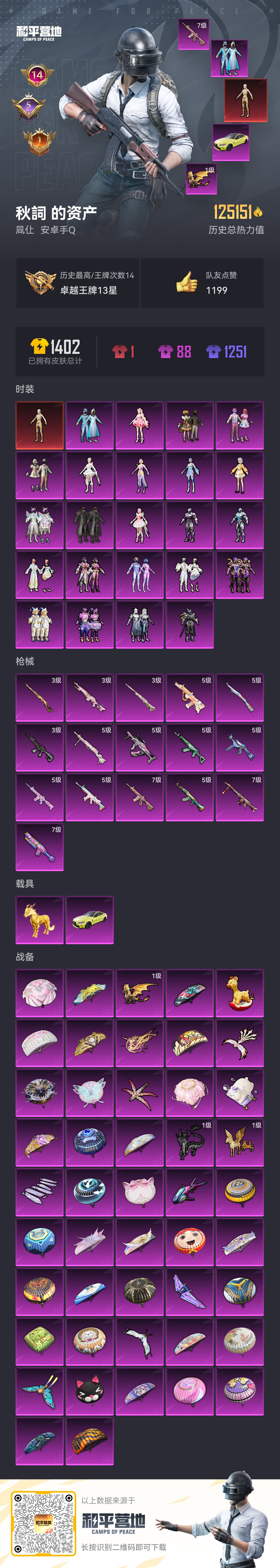 2263032-连体和平极品双字id 14王牌印记 历史卓越王牌13星 283套装 360呛皮 2载具 1神装 23粉装 16特效呛 营地:760426135 王者印记9 打野25段 2星传说 幽冥火 金色仲夏夜 313皮肤-1典藏 1珍品 25传说 1珍品 器灵落星盏1典藏已兑换 九霄神辉 战鼓燎原 马超琥珀纪元 遇见神鼓 星之鸣奏 幻光神呛 祥瑞亨通 愿照千秋盛 愿照众生和
