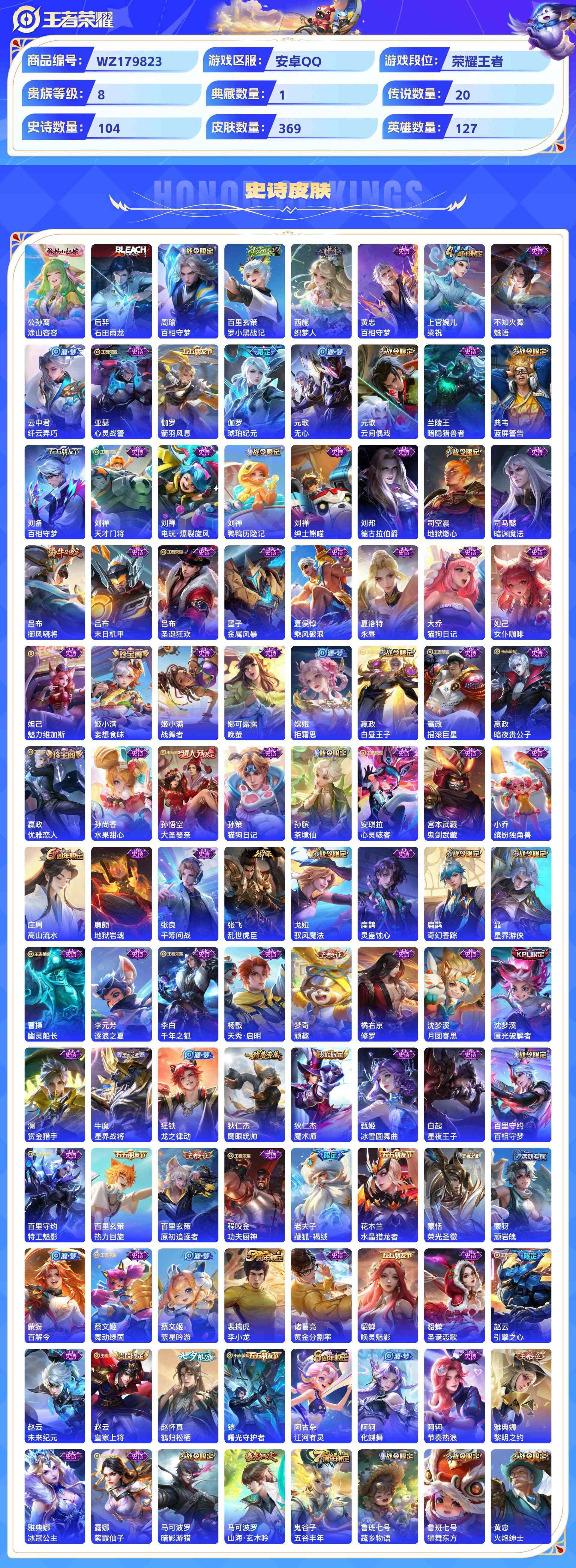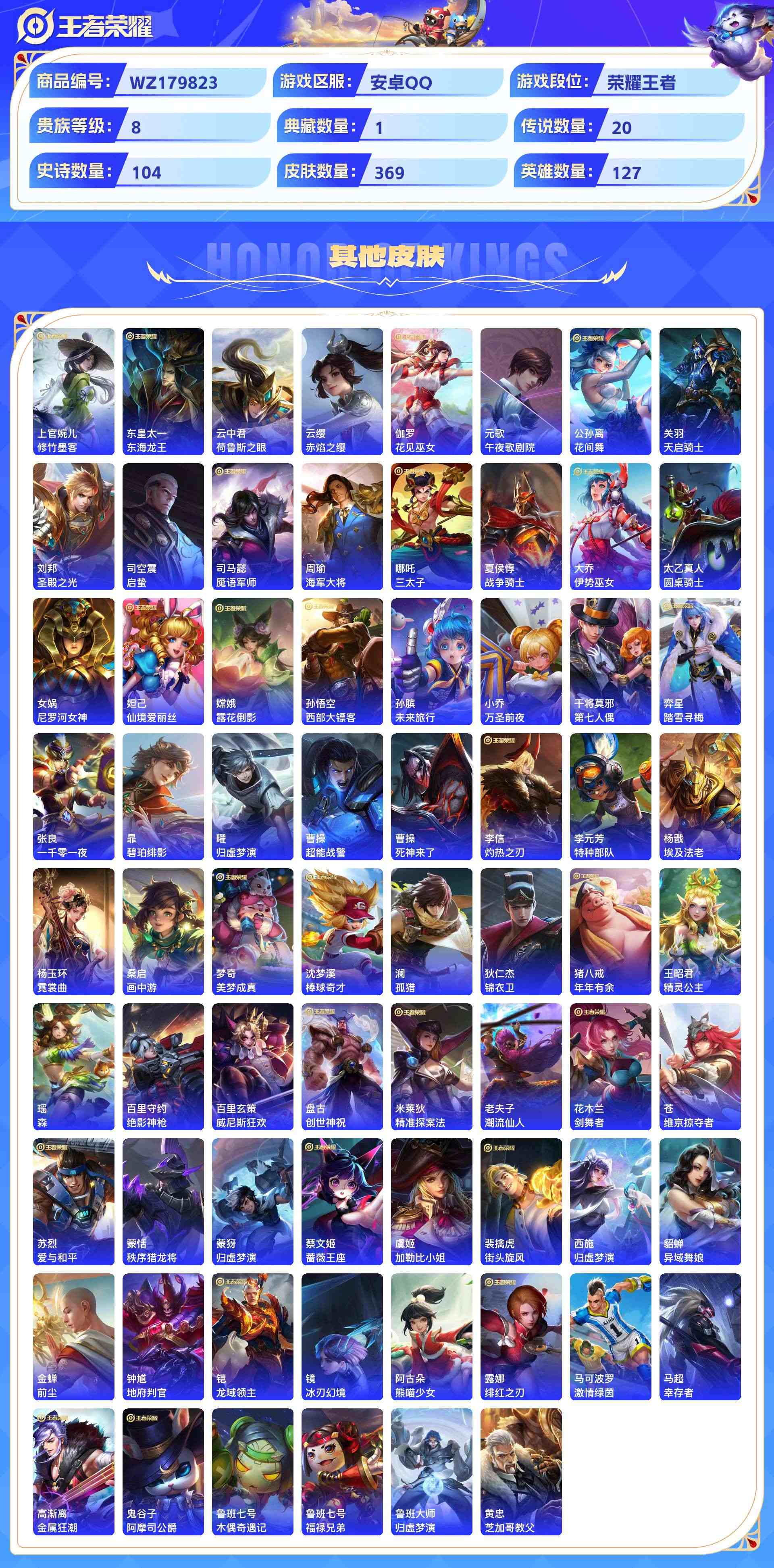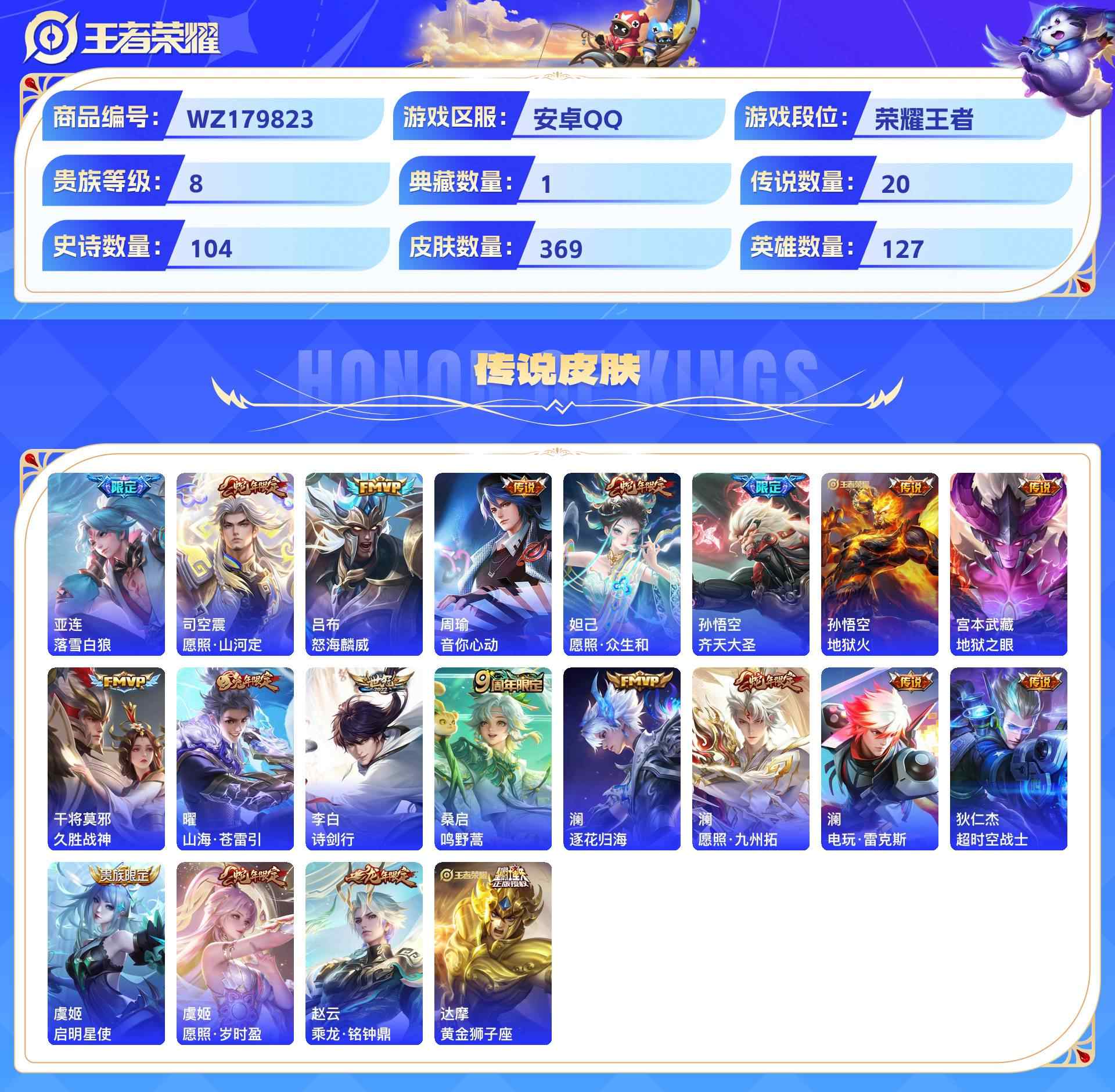 wz179823|脱坑号3星传说9个性按键安卓qq 369皮 贵族8级 1典藏 20传说 104史诗【荣耀典藏】银白咏叹调【传说皮肤】落雪白狼愿照·山河定怒海麟威音你心动愿照·众生和齐天大圣地狱火地狱之眼久胜战神山海·苍雷引