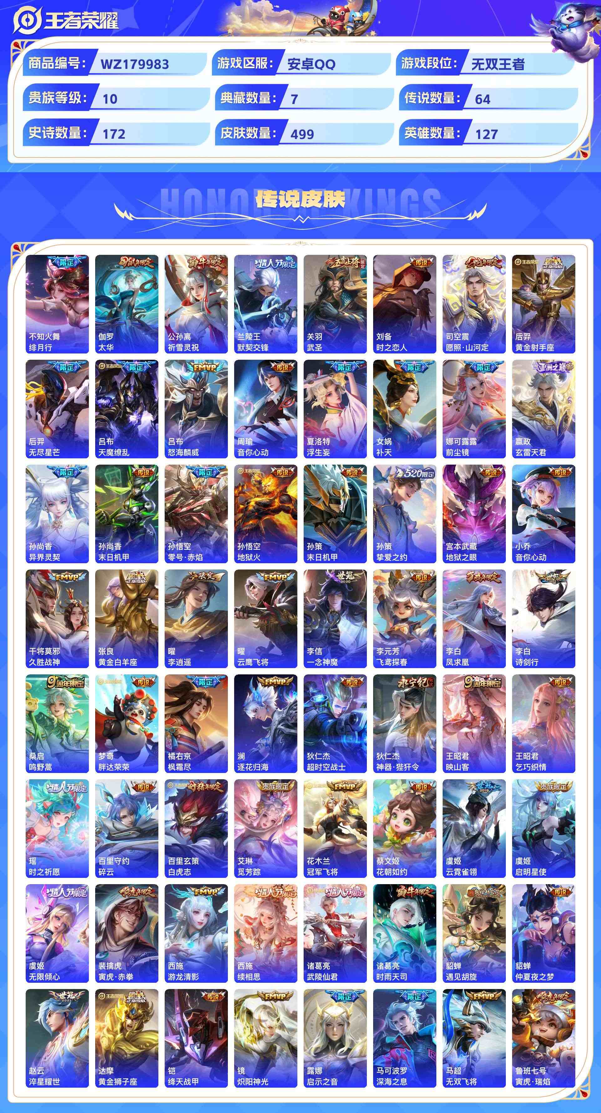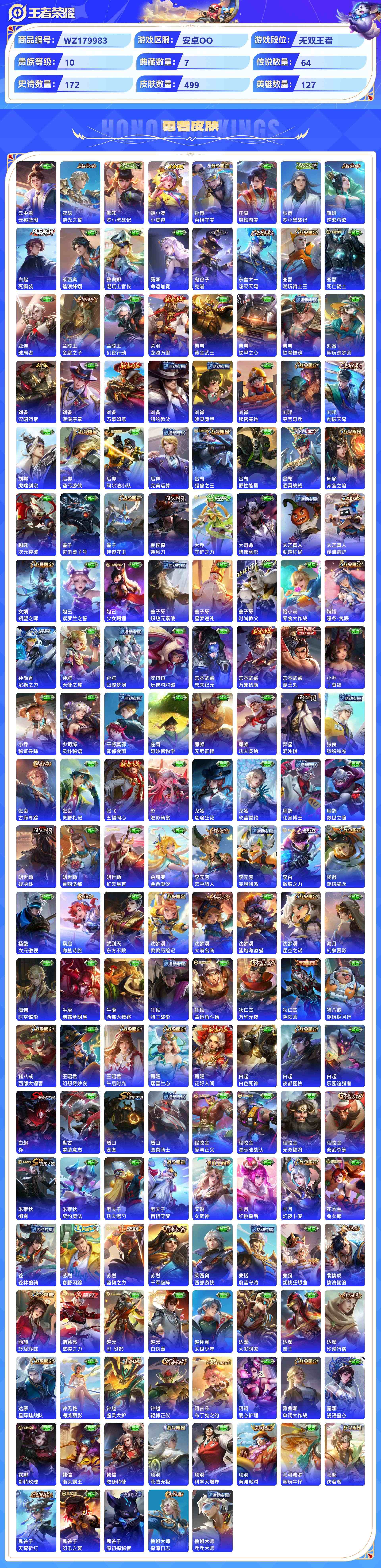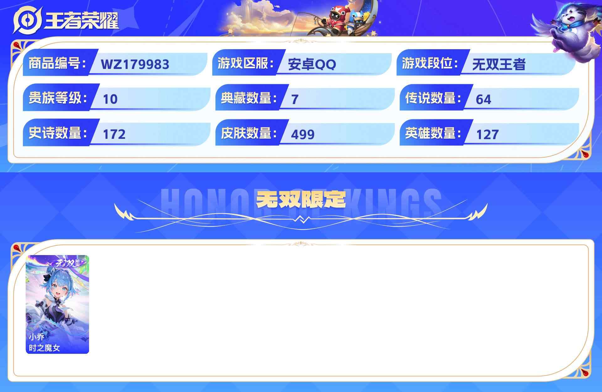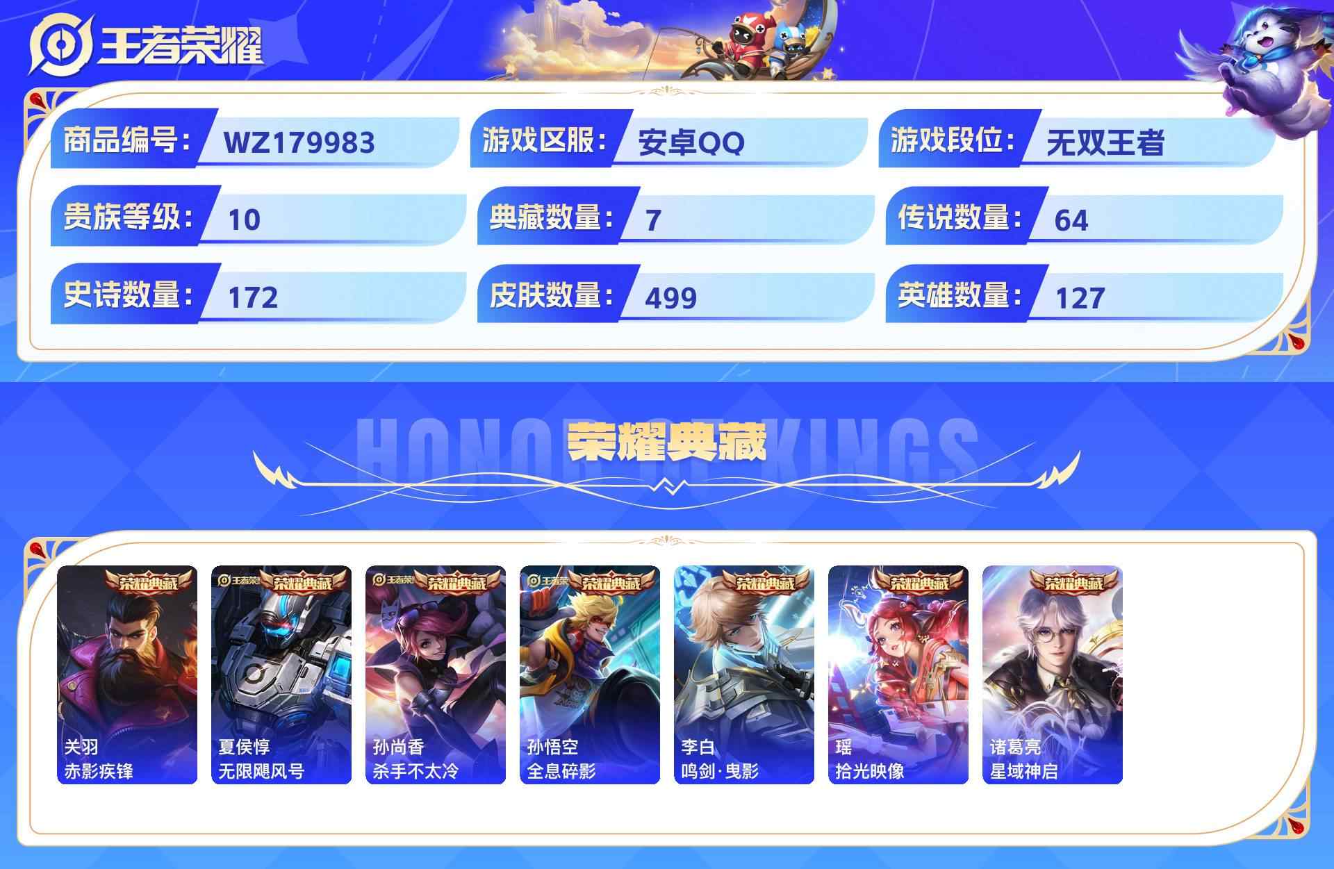 wz179983|极品号【珍品无双】馥梦繁花【荣耀典藏】赤影疾锋无限飓风号杀手不太冷全息碎影鸣剑·曳影拾光映像星域神启【珍品传说】酷洛米之心兔狲·蓬尾大耳狗之梦怪盗基德【无双限定】时之魔女安卓qq 贵族10级 499皮 1珍品无双 7典藏 4珍品传说 1无双 64传说 172史诗5星传说13个性按键3天幕