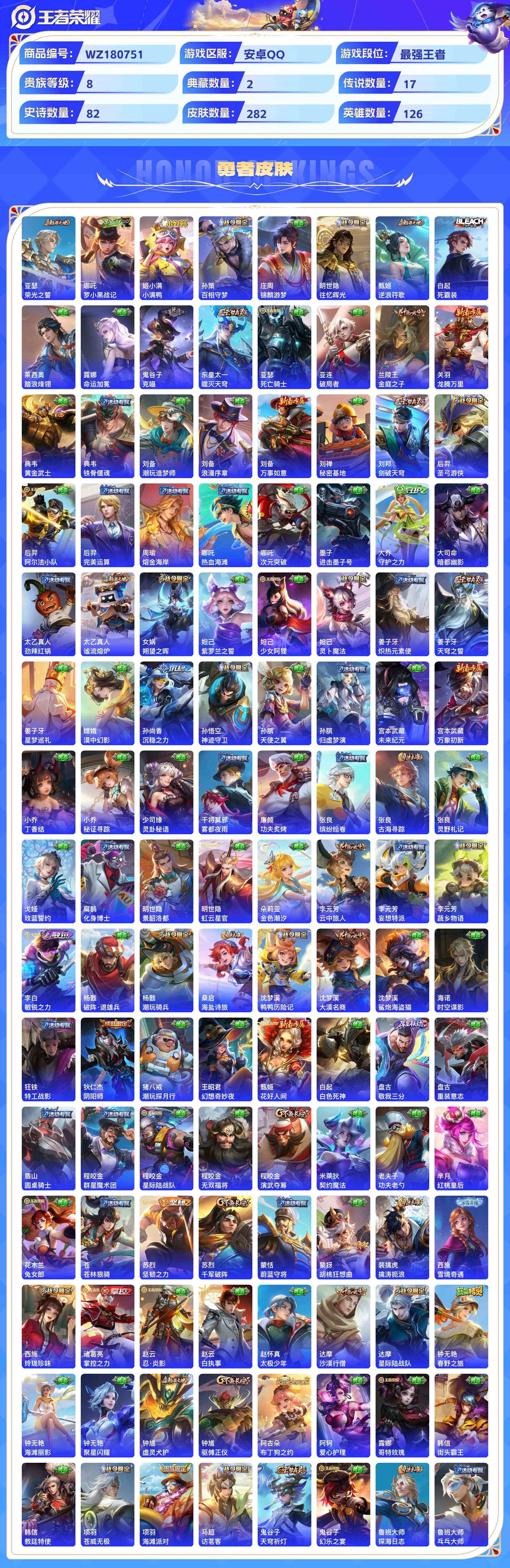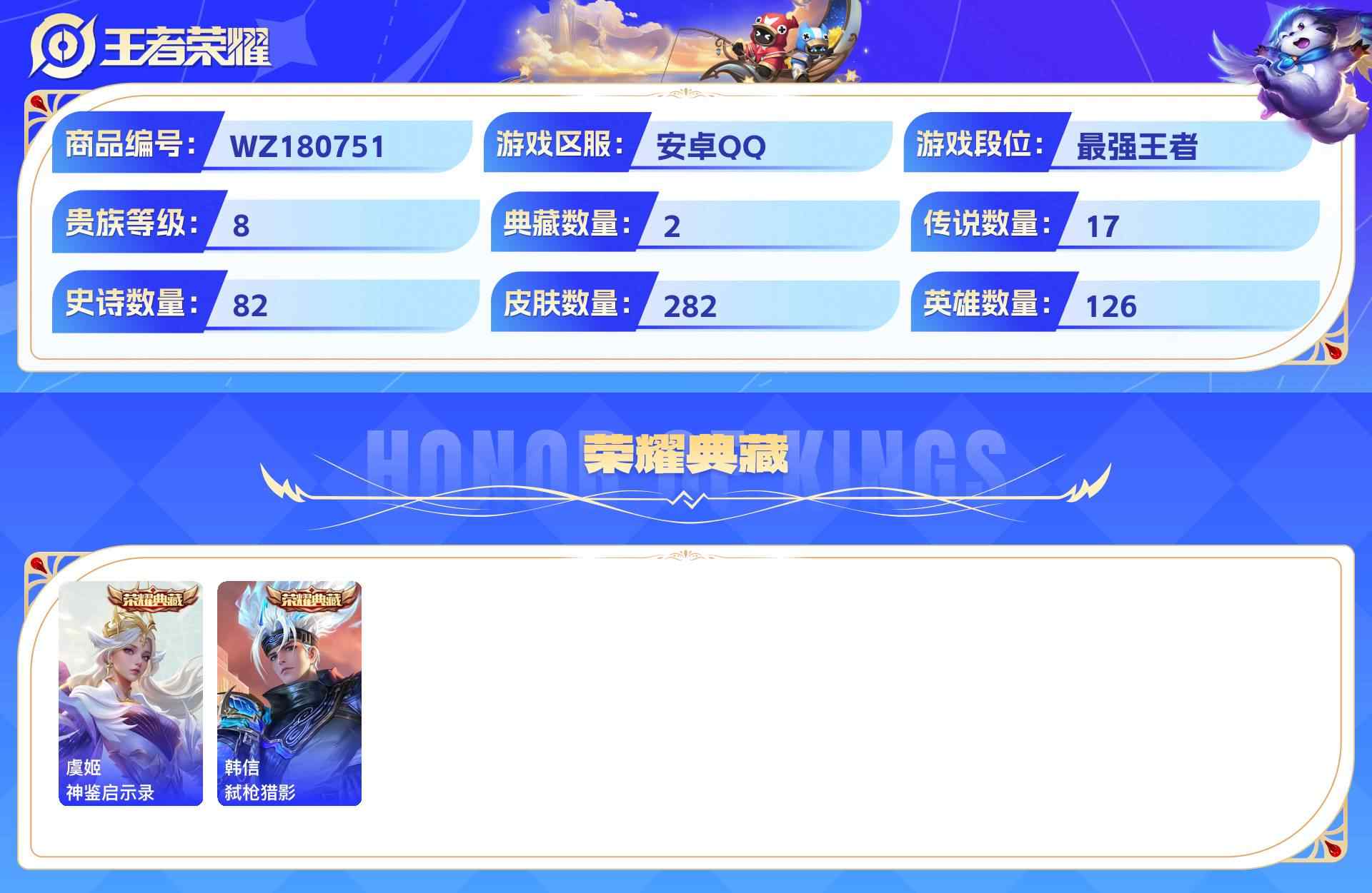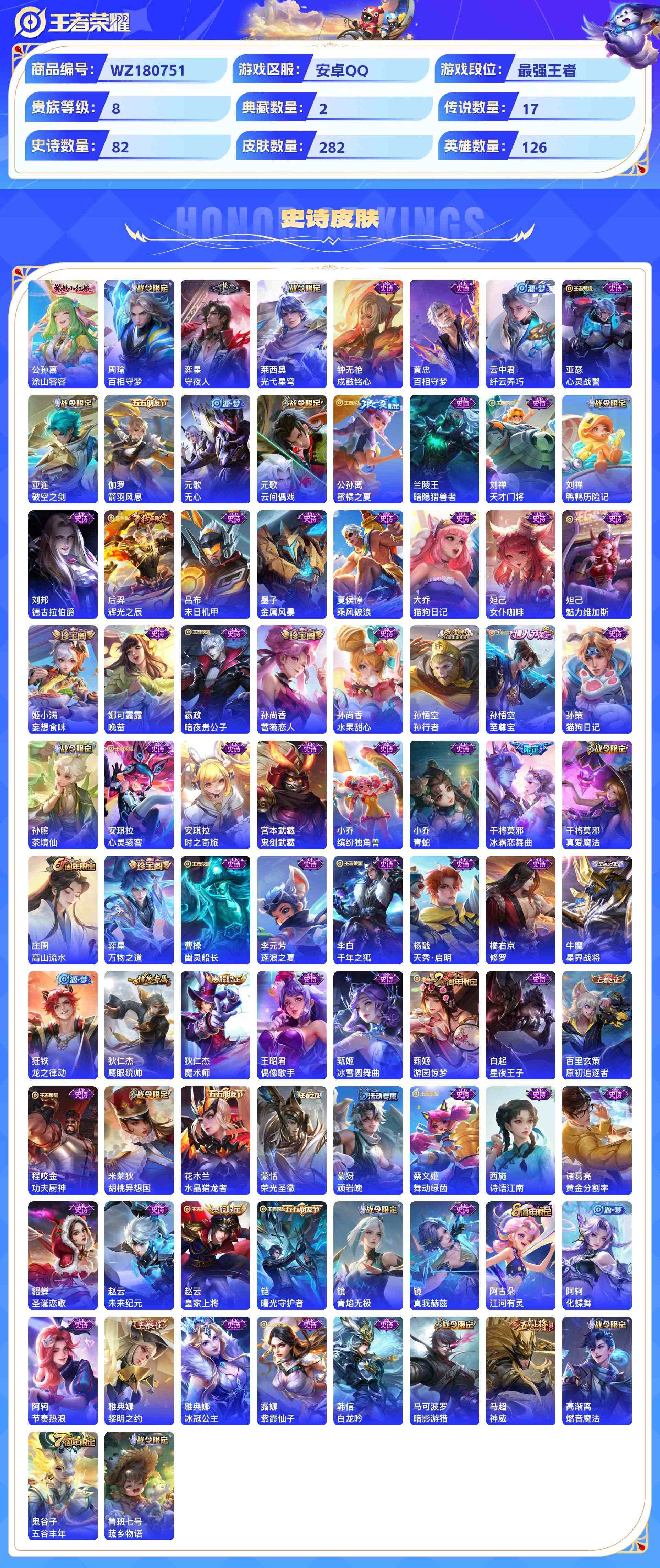 wz180751|极品号可二次安卓qq 贵族8级 282皮 1珍品无双(馥梦繁花) 2典藏(神鉴启示录弑呛猎影) 1珍品传说(酷洛米之心) 2无双(天机白泽碎月剑心) 17传说 82史诗1星传说13个性按键2天幕