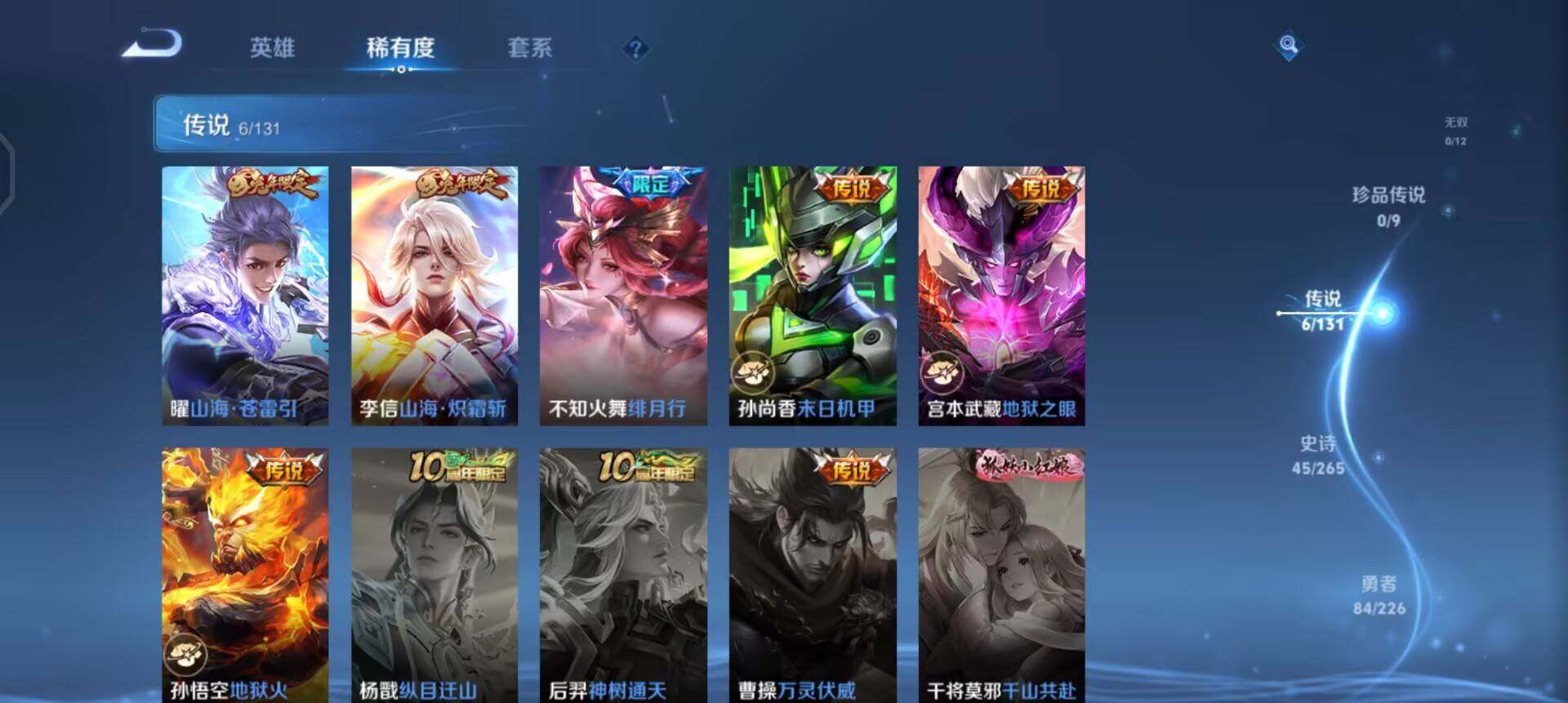w10719,,可立即换绑无需挂单养号,,铭文满级,,,传说6,,,星传说1,,,按键3,,,,夺宝200,,安卓q-v7-至尊星耀iii段位-126英雄-177皮肤-0典藏-0珍品无双-0无双-0珍品传说-6传说-45史诗 【英雄全皮】:鬼谷子全皮 【传说皮肤】:曜山海苍雷引,李信山海炽霜斩,不知火舞绯月行,孙尚香末日机甲,宫本武藏地狱之眼,孙悟空地狱火 【限定皮肤】:姜子牙天穹之誓,狄仁杰