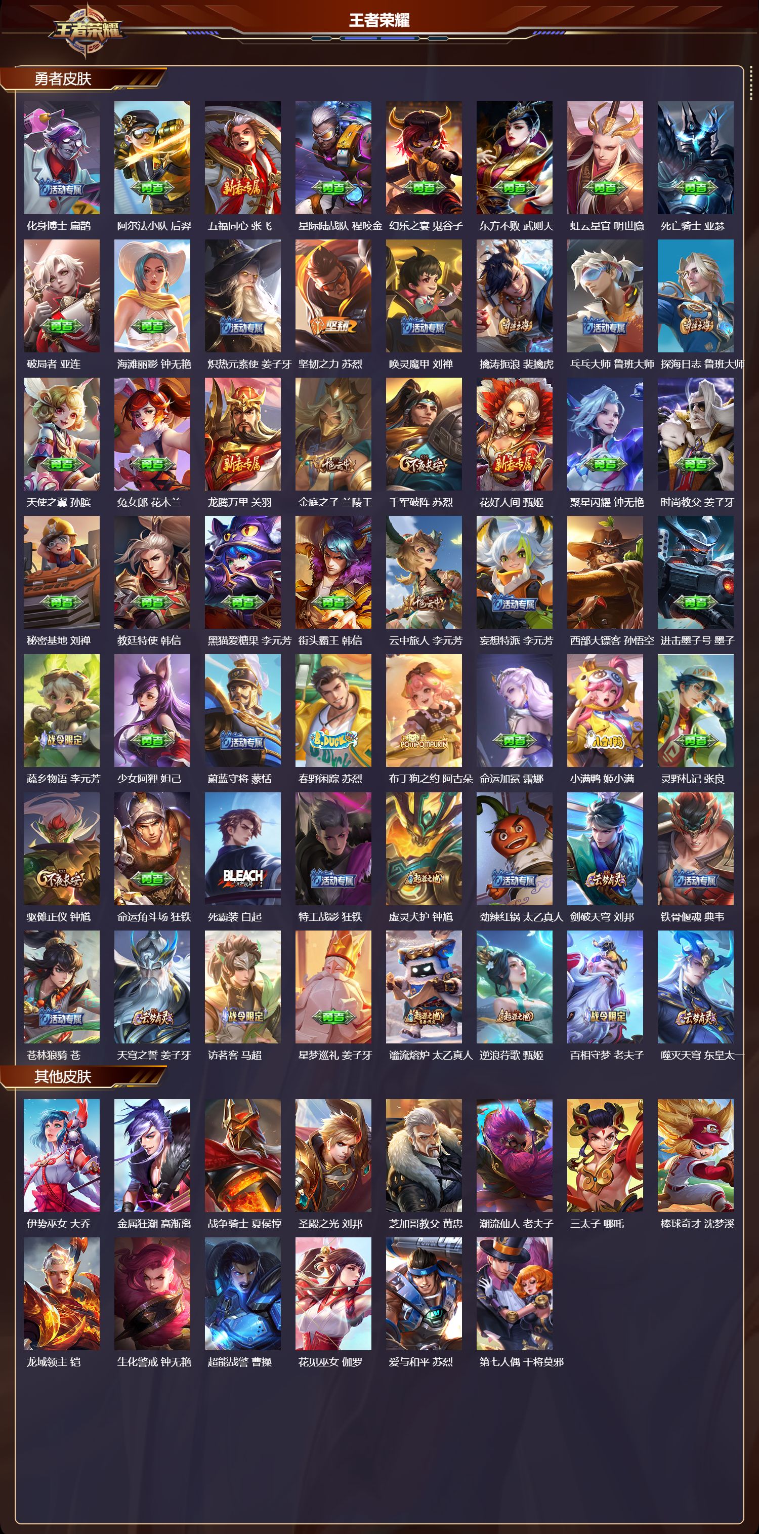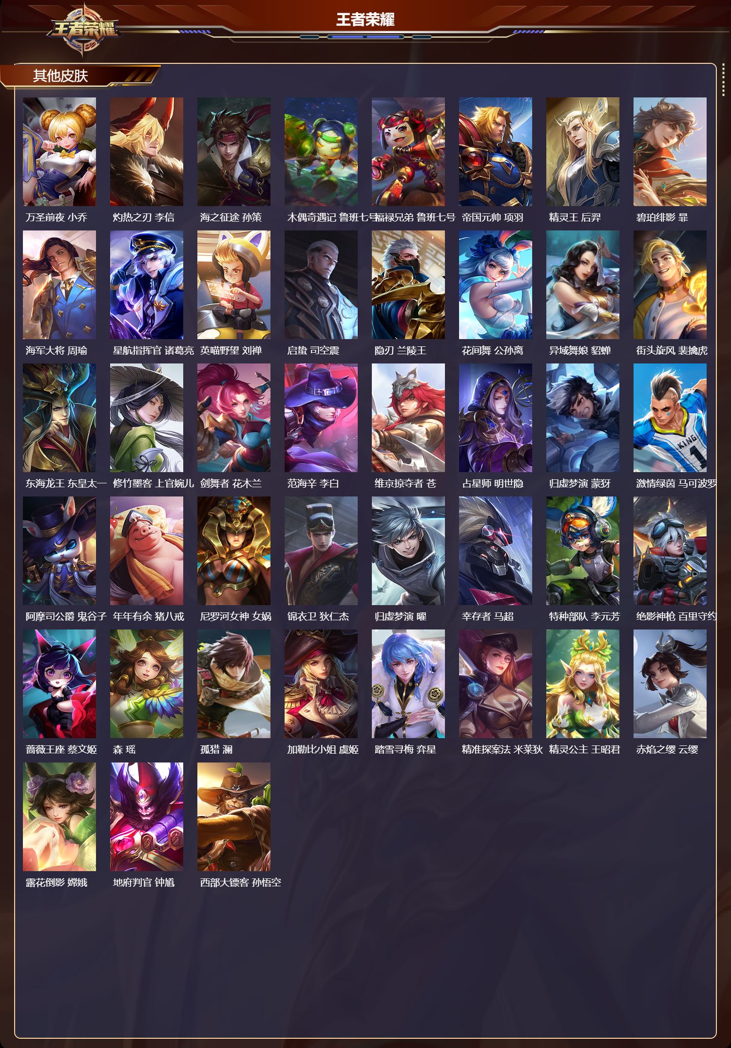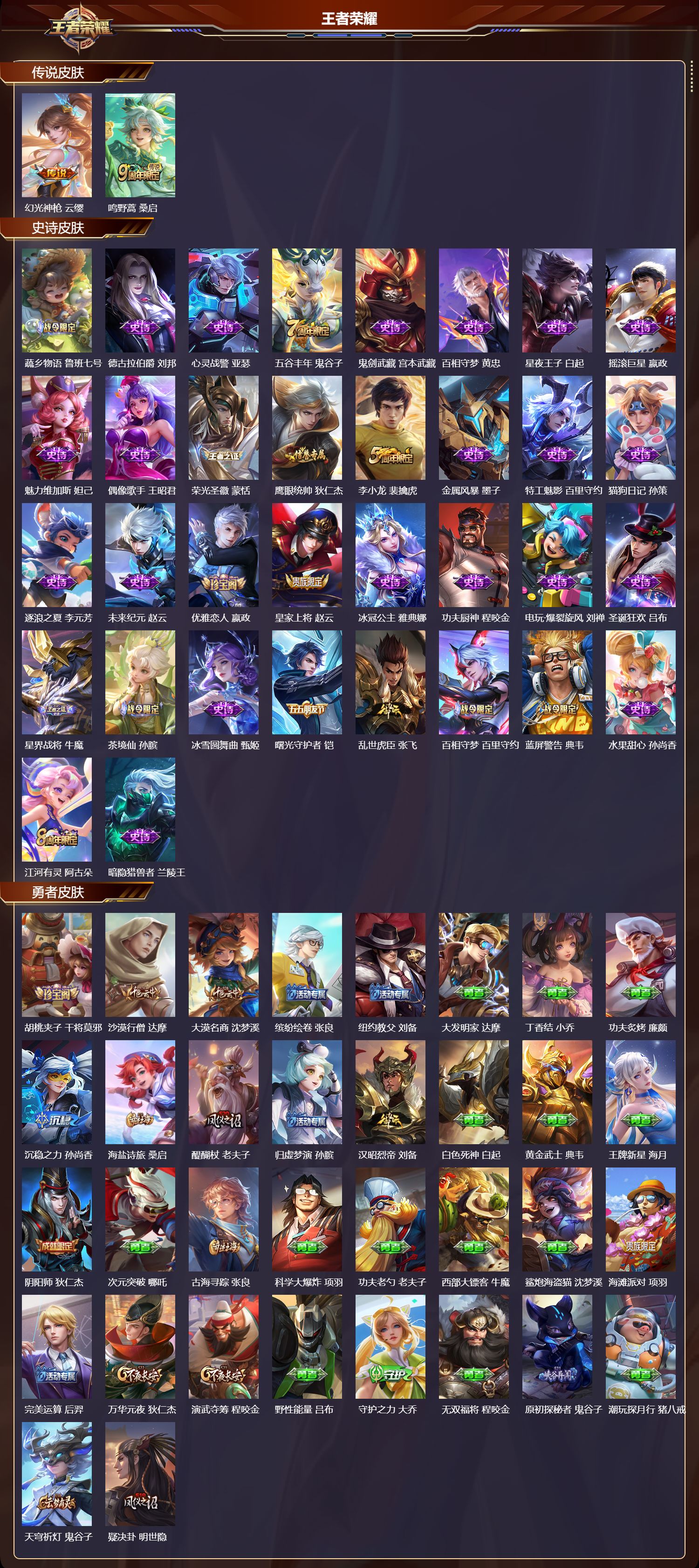 安卓qq/至尊星耀/182皮肤/124英雄/0典藏/0珍品无双/0无双/0珍品传说/2传说/34史诗/7稀有英雄【2 传说皮肤】幻光神呛 云缨鸣野蒿 桑启【34 史诗皮肤】蔬乡物语 鲁班七号德古拉伯爵 刘邦心灵战警 亚瑟五谷丰年 鬼谷子鬼剑武藏 宫本武藏百相守梦 黄忠星夜王子 白起摇滚巨星 嬴政魅力维加斯 妲己偶像歌手 王昭君荣光圣徽 蒙恬鹰眼统帅 狄仁杰李小龙 裴擒虎