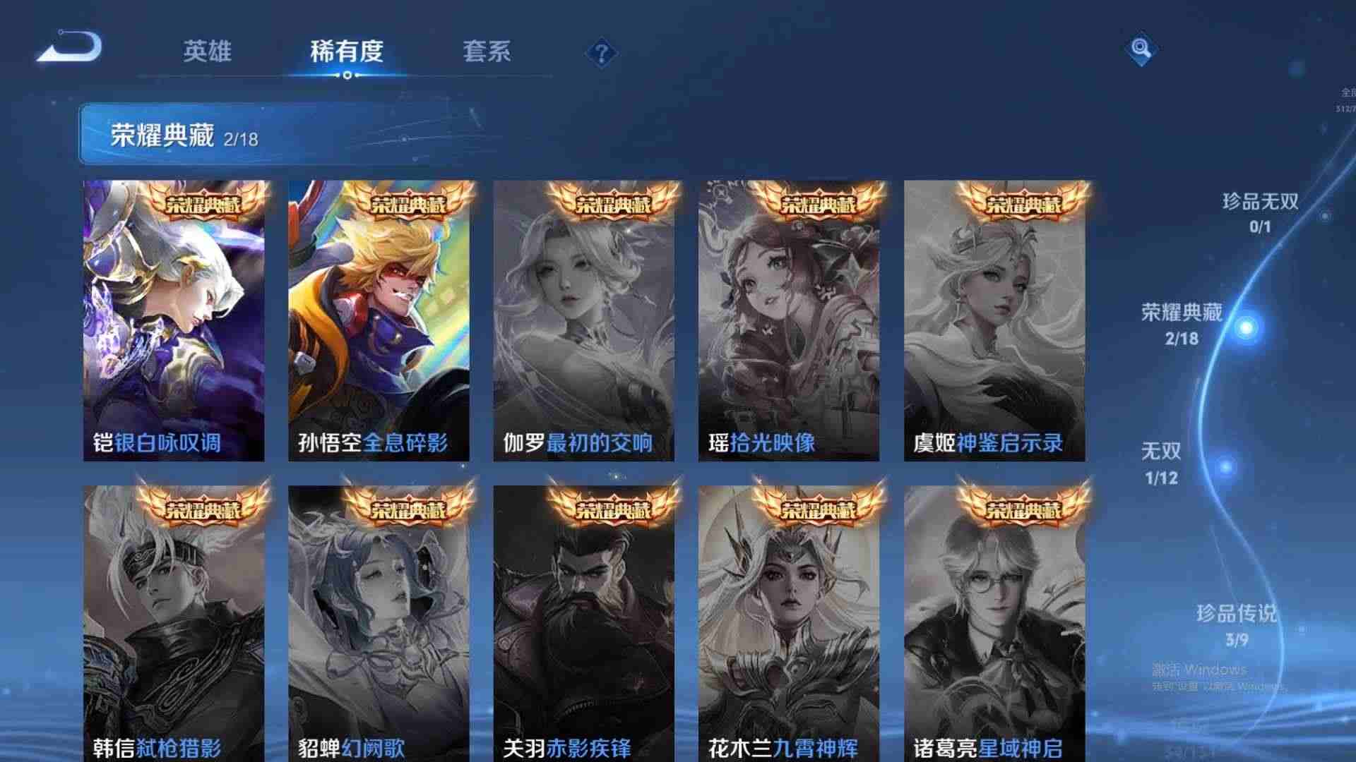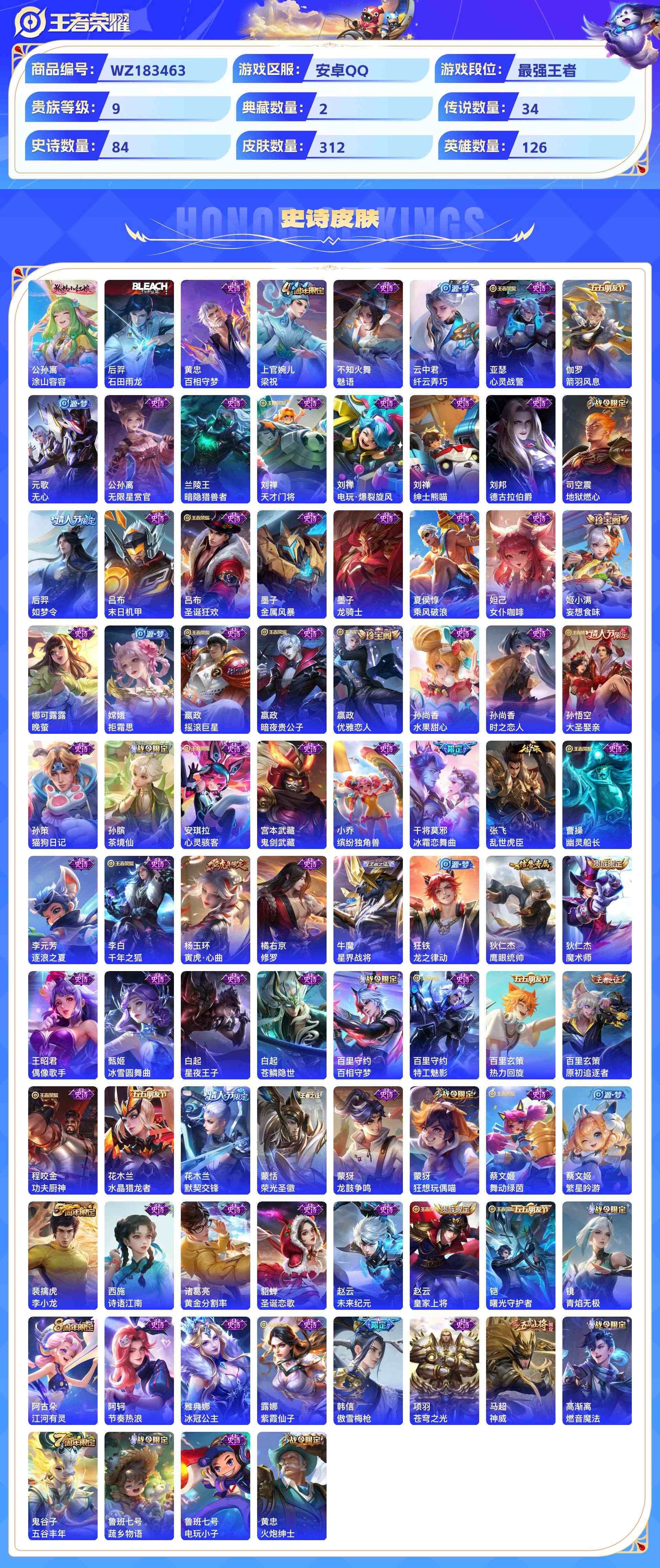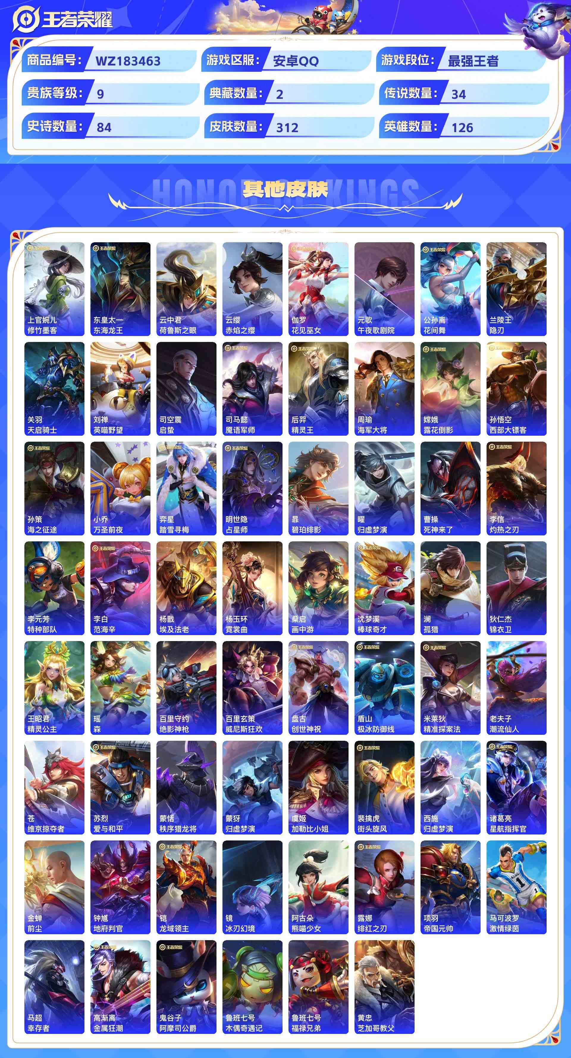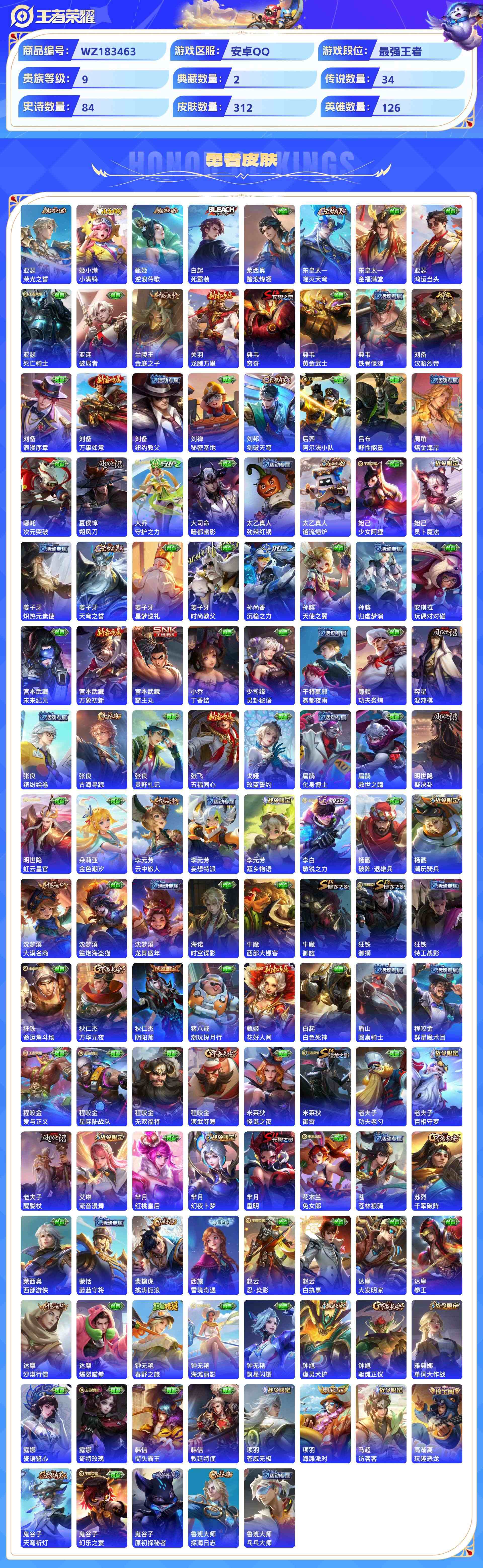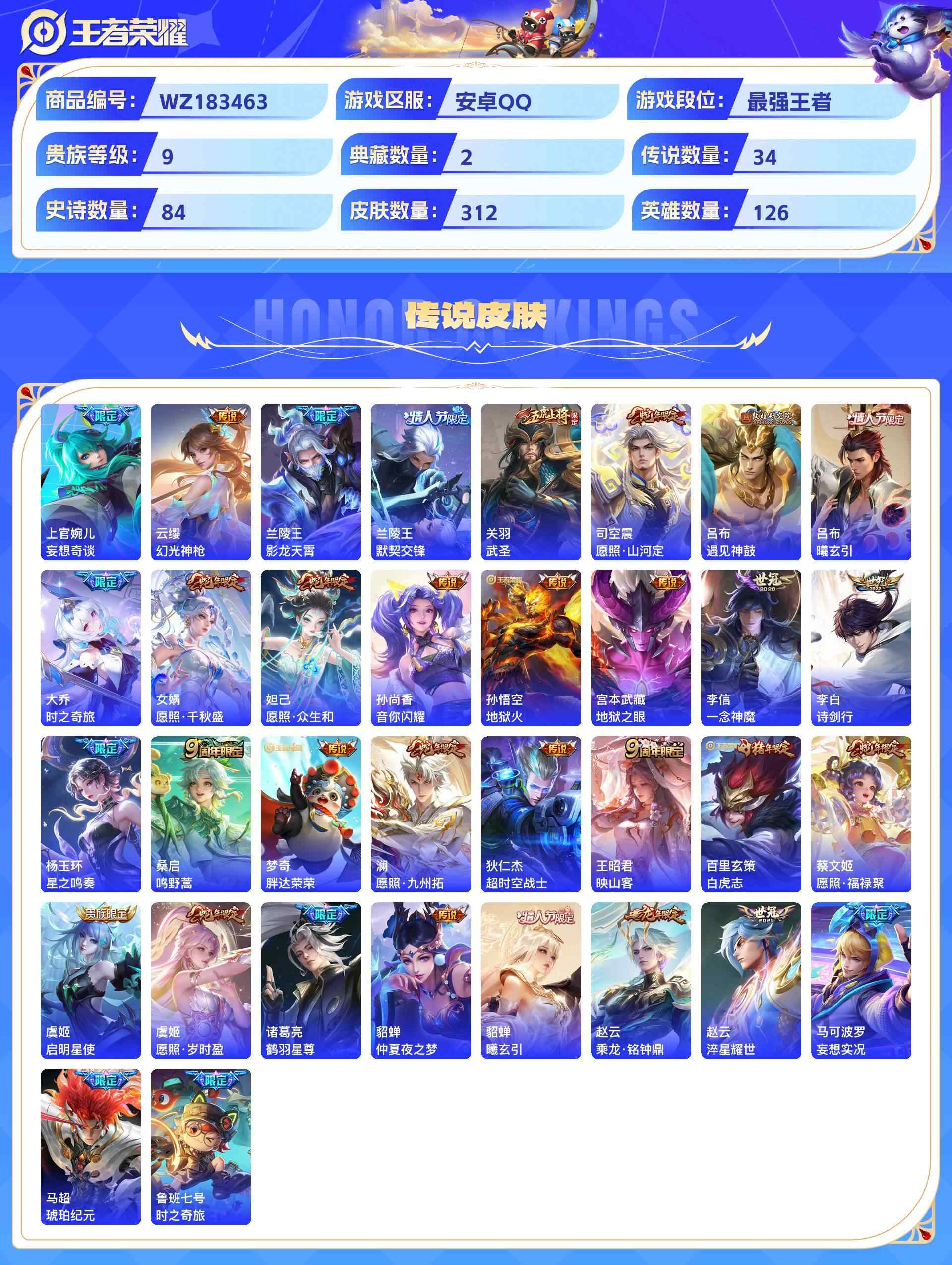 wz183463|极品号安卓qq 贵族9级 312皮 2典藏(全息碎影银白咏叹调) 3珍品传说 (时之奇旅怪盗基德江户川柯南)1无双(雪境奇遇) 34传说 84史诗1星传说12个性按键1天幕