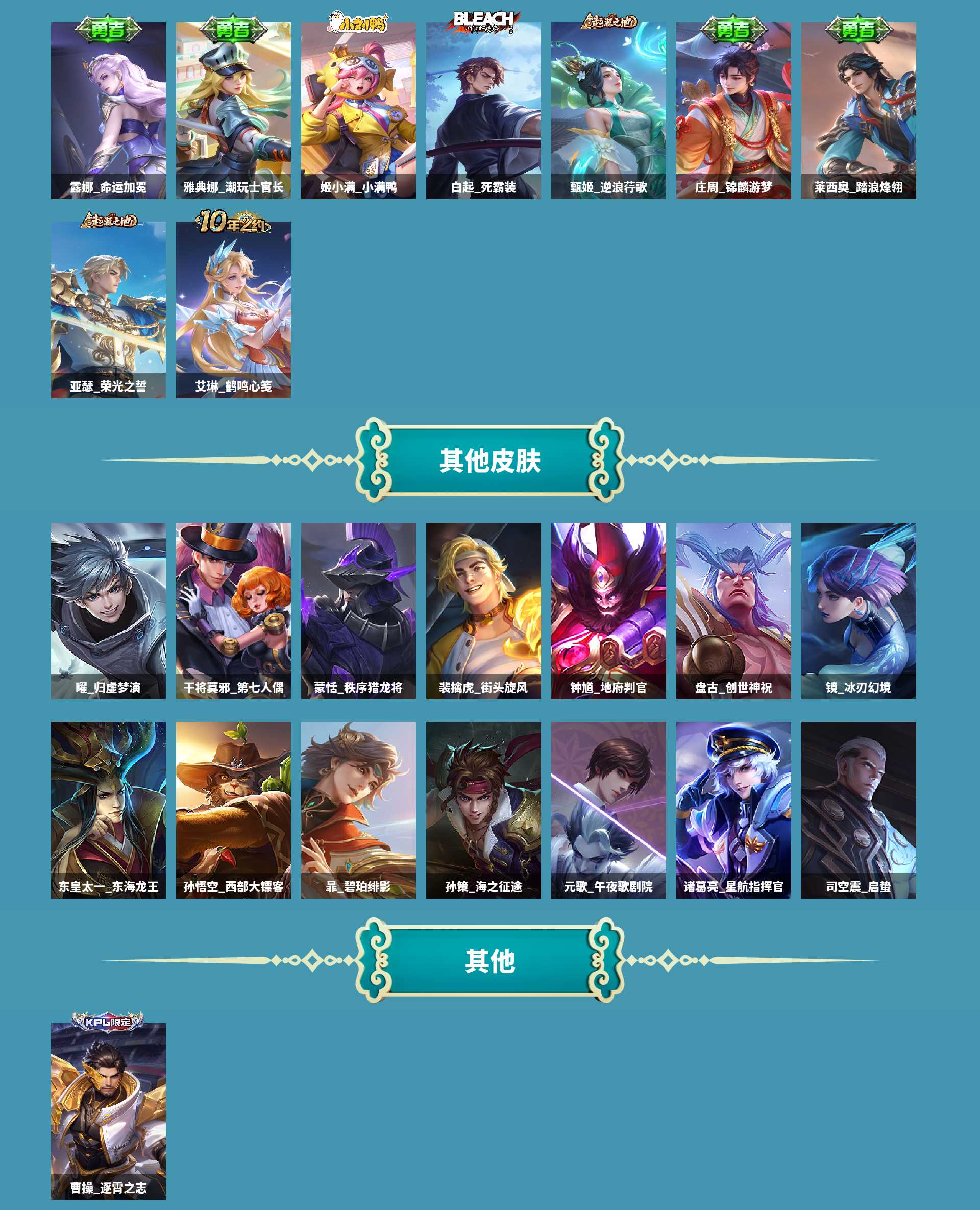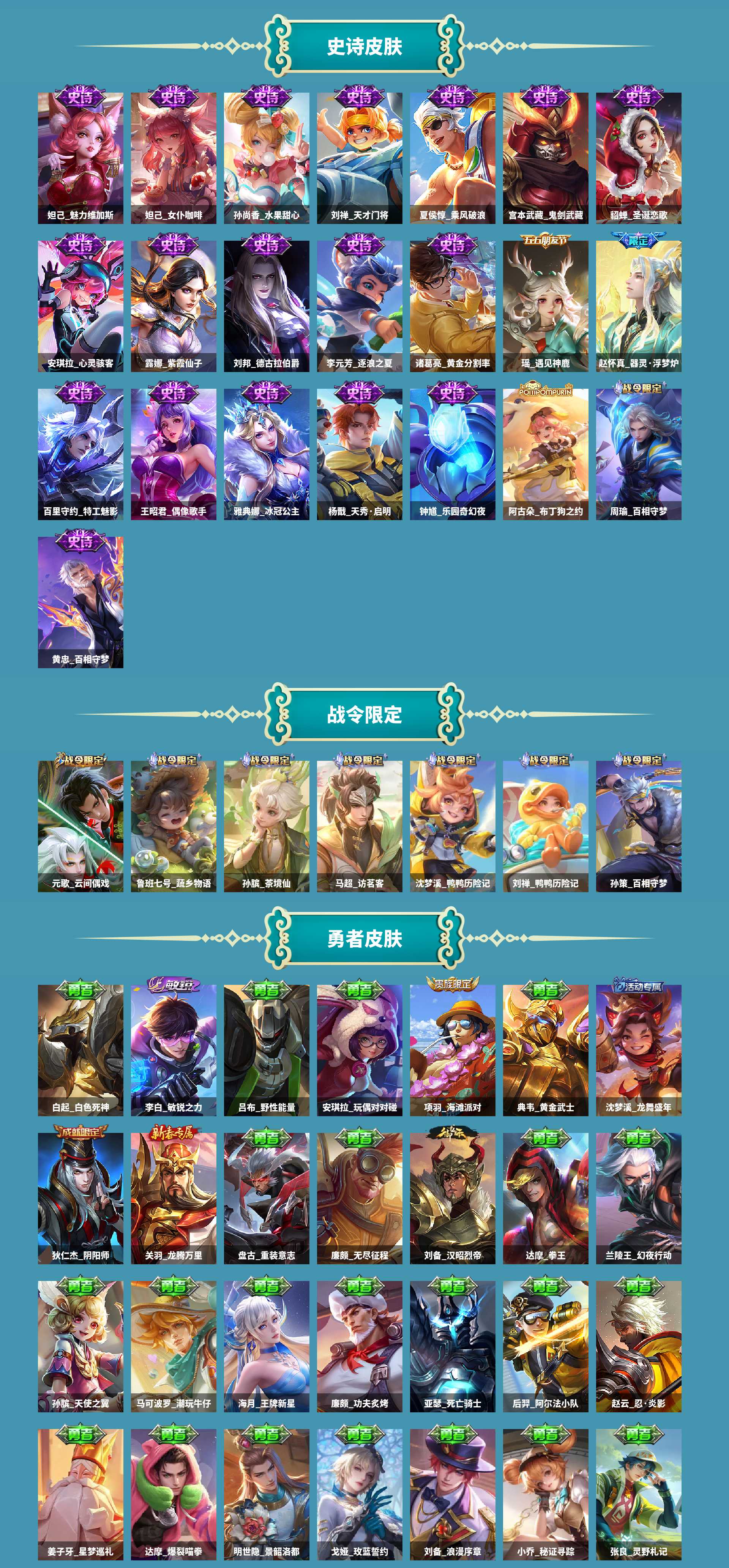 al632219 【特价珍品传说:安琪拉酷洛米之心,张飞兔狲蓬尾传说皮肤:后裔神树通天,后羿黄金射手座,虞姬云霓雀翎,孙尚香末日机甲,公孙离祈雪灵祝,澜愿照九州拓 赛季限定:亚瑟荣光之誓,甄姬逆浪荇歌,钟馗虚灵犬护,太乙真人谧流熔炉】 皮肤数99 皮肤价值65628 无双皮肤数0 传说皮肤数6 珍品传说皮数2 史诗皮肤数32 英雄数94 营地id1618685598 贵族等级【文本】贵族6级 【贵族6级】 【可排位】 【是】 珍品传说2 年限皮肤2 限定皮肤24 赛季限定4 史诗皮肤32 战令限定8 勇者皮肤42 其他皮肤14 珍品传说:安琪拉酷洛米之心,张飞兔狲蓬尾; 年限皮肤:公孙离祈雪灵祝,澜愿照九州拓; 限定皮肤:沈梦溪龙舞盛年,元歌云间偶戏,鲁班七号蔬乡物语,白起死霸装,姬小满小满鸭,安琪拉酷洛米之心,老夫子_藏狐·褐绒,张飞兔狲蓬尾,狄仁杰魔术师,狄仁杰阴阳师,狂铁龙之律动,苏烈春野闲踪,狄仁杰鹰眼统帅,钟馗虚灵犬护,马超访茗客,孙膑茶境仙,阿轲化蝶舞,太乙真人谧流熔炉,公孙离祈雪灵祝,赵云皇家上将,貂蝉逐梦之音,项羽海滩派对,赵怀真器灵浮梦炉,澜愿照九州拓; 赛季限定:亚瑟荣光之誓,甄姬逆浪荇歌,钟馗虚灵犬护,太乙真人谧流熔炉; 史诗皮肤:雅典娜冰冠公主,刘禅天才门将,黄忠百相守梦,元歌云间偶戏,貂蝉圣诞恋歌,周瑜百相守梦,鲁班七号蔬乡物语,李元芳逐浪之夏,刘邦德古拉伯爵,夏侯惇乘风破浪,妲己女仆咖啡,安琪拉心灵骇客,瑶遇见神鹿,阿古朵_布丁狗之约,钟馗乐园奇幻夜,宫本武藏鬼剑武藏,孙尚香水果甜心,狄仁杰魔术师,刘禅鸭鸭历险记,王昭君偶像歌手,狂铁龙之律动,狄仁杰鹰眼统帅,百里守约特工魅影,孙膑茶境仙,阿轲化蝶舞,诸葛亮黄金分割率,露娜紫霞仙子,妲己魅力维加斯,杨戬天秀启明,赵云皇家上将,貂蝉逐梦之音,赵怀真器灵浮梦炉; 战令限定:元歌云间偶戏,周瑜百相守梦,孙策百相守梦,鲁班七号蔬乡物语,刘禅鸭鸭历险记,沈梦溪鸭鸭历险记,马超访茗客,孙膑茶境仙; 勇者皮肤:兰陵王幻夜行动,沈梦溪龙舞盛年,亚瑟荣光之誓,白起白色死神,艾琳鹤鸣心笺,李白敏锐之力,莱西奥踏浪烽翎,盘古重装意志,海月王牌新星,孙膑天使之翼,庄周锦麟游梦,甄姬逆浪荇歌,孙策百相守梦,廉颇功夫炙烤,白起死霸装,姬小满小满鸭,雅典娜潮玩士官长,露娜命运加冕,刘备汉昭烈帝,吕布野性能量,达摩拳王,沈梦溪鸭鸭历险记,安琪拉玩偶对对碰,狄仁杰阴阳师,张良灵野札记,小乔秘证寻踪,马可波罗潮玩牛仔,钟馗虚灵犬护,刘备浪漫序章,廉颇无尽征程,戈娅玫蓝誓约,典韦黄金武士,马超访茗客,明世隐景韶洛都,姜子牙星梦巡礼,太乙真人谧流熔炉,赵云忍炎影,项羽海滩派对,达摩爆裂喵拳,亚瑟死亡骑士,后羿阿尔法小队,关羽龙腾万里; 其他皮肤:东皇太一东海龙王,裴擒虎街头旋风,蒙恬秩序猎龙将,元歌午夜歌剧院,孙策海之征途,曜归虚梦演,盘古创世神祝,干将莫邪第七人偶,暃碧珀绯影,镜冰刃幻境,诸葛亮星航指挥官,司空震启蛰,钟馗地府判官,孙悟空西部大镖客;