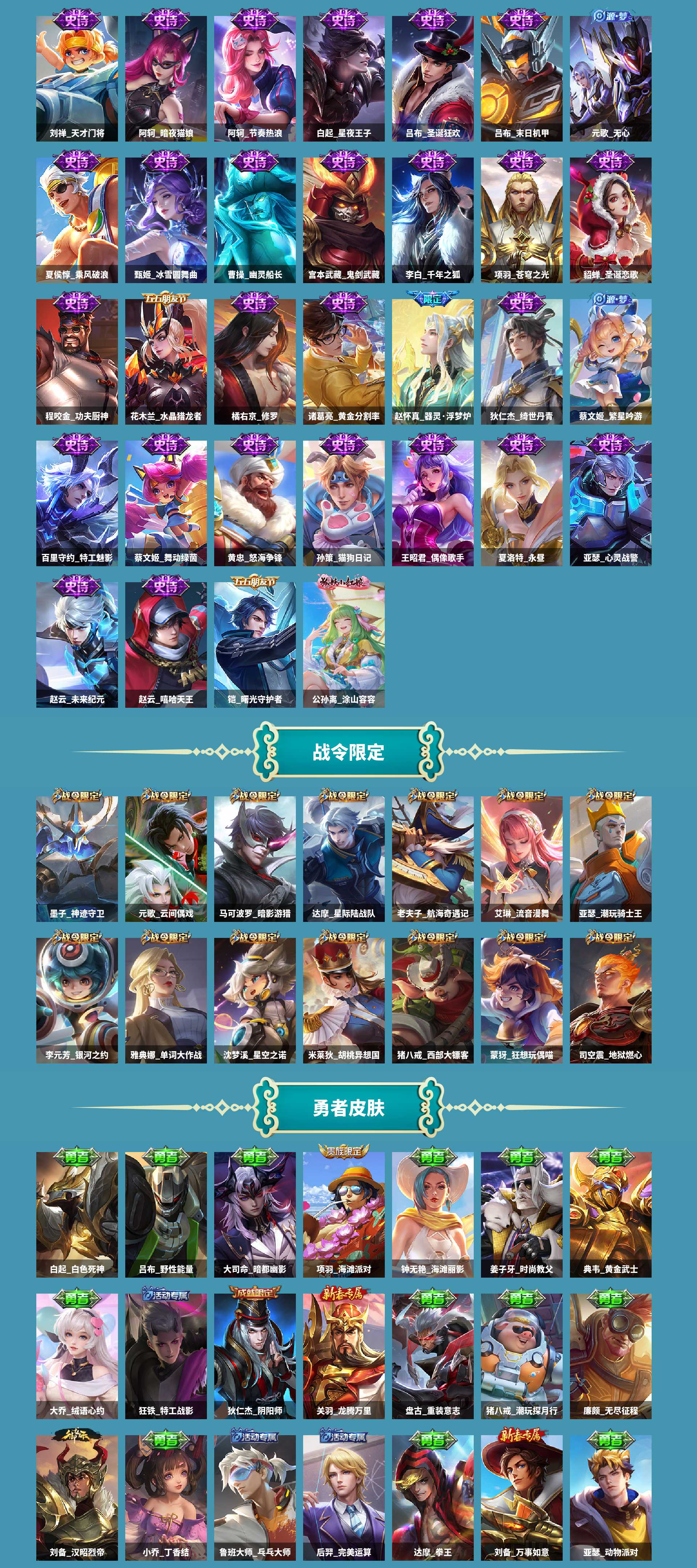 al632212 【特价荣耀典藏:李白鸣剑曳影珍品传说:鲁班七号江户川柯南传说皮肤:宫本武藏地狱之眼,李信山海炽霜斩,吕布怒海麟威,百里守约碎云,后羿黄金射手座,诸葛亮时雨天司,孙悟空零号赤焰,干将莫邪久胜战神,百里玄策白虎志,曜云鹰飞将,李信一念神魔,铠曙光守护者,李白凤求凰,夏洛特浮生妄,周瑜音你心动,澜逐花归海,镜炽阳神光,虞姬启明星使】 皮肤数242 皮肤价值185578 无双皮肤数0 传说皮肤数17 珍品传说皮数1 史诗皮肤数71 英雄数126 营地id2115339189 贵族等级【文本】贵族8级 【贵族8级】 【可排位】 【是】 荣耀典藏1 珍品传说1 内测皮肤2 年限皮肤9 限定皮肤80 赛季限定29 史诗皮肤71 战令限定14 勇者皮肤110 其他皮肤41 荣耀典藏:李白鸣剑曳影; 珍品传说:鲁班七号江户川柯南; 内测皮肤:嬴政优雅恋人,姬小满妄想食味; 年限皮肤:李信山海炽霜斩,苏烈玄武志,吕布御风骁将,诸葛亮时雨天司,百里玄策白虎志,马超神威,典韦岱宗,李白凤求凰,黄忠烈魂; 限定皮肤:张良罗小黑战记,白起死霸装,钟馗虚灵犬护,裴擒虎擒涛扼浪,梦奇顽趣,李信山海炽霜斩,桑启海盐诗旅,元歌无心,太乙真人华丽摇滚,鬼谷子五谷丰年,李元芳云中旅人,苏烈玄武志,沈梦溪大漠名商,兰陵王金庭之子,达摩沙漠行僧,雅典娜黎明之约,苏烈千军破阵,老夫子航海奇遇记,墨子神迹守卫,嬴政优雅恋人,韩信逐梦之影,钟馗驱傩正仪,米莱狄胡桃异想国,达摩星际陆战队,关羽冰锋战神,程咬金演武夺筹,东皇太一逐梦之光,元歌云间偶戏,亚瑟潮玩骑士王,吕布御风骁将,诸葛亮时雨天司,狄仁杰万华元夜,孙悟空零号赤焰,云中君纤云弄巧,百里玄策原初追逐者,雅典娜单词大作战,蒙犽狂想玩偶喵,裴擒虎李小龙,百里玄策白虎志,鬼谷子原初探秘者,蔡文姬繁星吟游,马可波罗暗影游猎,猪八戒西部大镖客,老夫子醍醐杖,马超神威,狄仁杰魔术师,孙悟空至尊宝,明世隐疑决卦,李元芳银河之约,沈梦溪星空之诺,狄仁杰阴阳师,赵云皇家上将,典韦岱宗,弈星混沌棋,项羽海滩派对,李白凤求凰,狄仁杰鹰眼统帅,夏侯惇朔风刀,盾山御銮,牛魔御旌,蒙犽百解令,赵怀真器灵浮梦炉,阿轲化蝶舞,安琪拉魔法小厨娘,鬼谷子天穹祈灯,东皇太一噬灭天穹,司空震地狱燃心,李白谪仙醉月,夏洛特浮生妄,张良古海寻踪,姜子牙天穹之誓,黄忠烈魂,阿古朵江河有灵,姬小满妄想食味,鲁班七号江户川柯南,吕布逐霄战戟,太乙真人谧流熔炉,刘邦剑破天穹,艾琳流音漫舞,虞姬启明星使; 赛季限定:亚瑟荣光之誓,甄姬逆浪荇歌,钟馗虚灵犬护,裴擒虎擒涛扼浪,梦奇顽趣,桑启海盐诗旅,李元芳云中旅人,沈梦溪大漠名商,兰陵王金庭之子,达摩沙漠行僧,雅典娜黎明之约,苏烈千军破阵,钟馗驱傩正仪,程咬金演武夺筹,狄仁杰万华元夜,百里玄策原初追逐者,鬼谷子原初探秘者,老夫子醍醐杖,明世隐疑决卦,弈星混沌棋,夏侯惇朔风刀,盾山御銮,牛魔御旌,鬼谷子天穹祈灯,东皇太一噬灭天穹,张良古海寻踪,姜子牙天穹之誓,太乙真人谧流熔炉,刘邦剑破天穹; 史诗皮肤:公孙离涂山容容,梦奇顽趣,鲁班七号电玩小子,元歌无心,赵云嘻哈天王,白起星夜王子,鬼谷子五谷丰年,阿轲暗夜猫娘,赵云未来纪元,夏洛特永昼,苏烈玄武志,夏侯惇乘风破浪,雅典娜黎明之约,吕布圣诞狂欢,老夫子航海奇遇记,嬴政优雅恋人,韩信逐梦之影,墨子龙骑士,米莱狄胡桃异想国,关羽冰锋战神,廉颇地狱岩魂,东皇太一逐梦之光,元歌云间偶戏,吕布御风骁将,王昭君偶像歌手,曹操幽灵船长,墨子金属风暴,云中君纤云弄巧,甄姬冰雪圆舞曲,百里玄策原初追逐