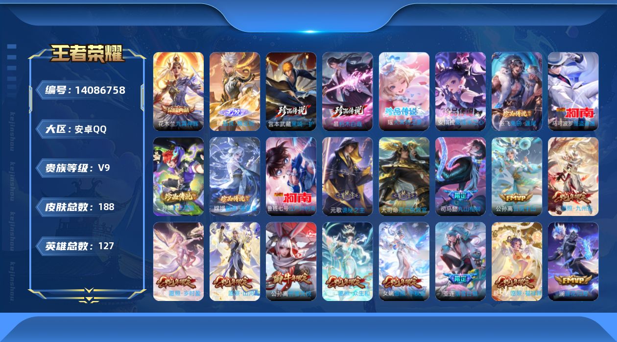 [14086758]贵族9-全皮英雄5-棉花糖聚会天幕、kuromi时间天幕-改名卡5-水晶0-总皮188-典藏1-传说37-无双1-珍品无双0-珍品传说9 安卓手q491区 营地id1657429528绝世王者【珍品传说皮肤】:黑崎一护朽木白哉酷洛米之心大耳狗之梦兔狲·蓬尾器灵·落星盏时之奇旅江户川柯南怪盗基德【无双皮肤】:器灵·螭龙剑【荣耀典藏】:九霄神辉【优质限定皮肤】:至