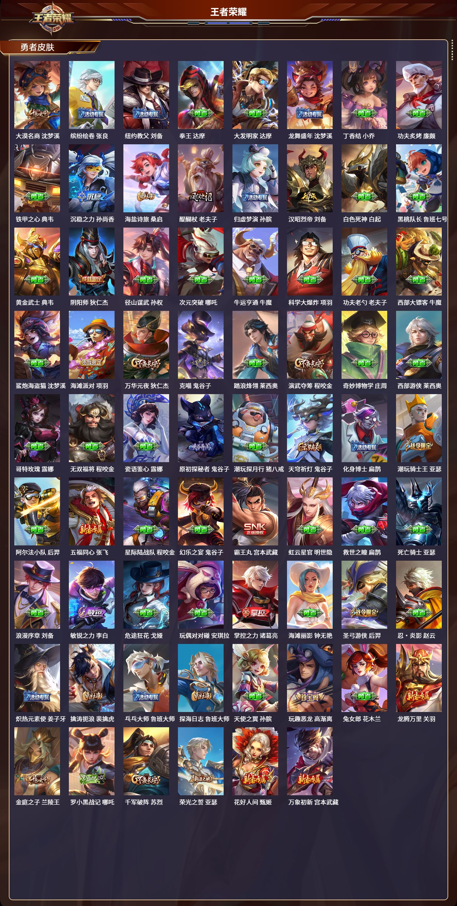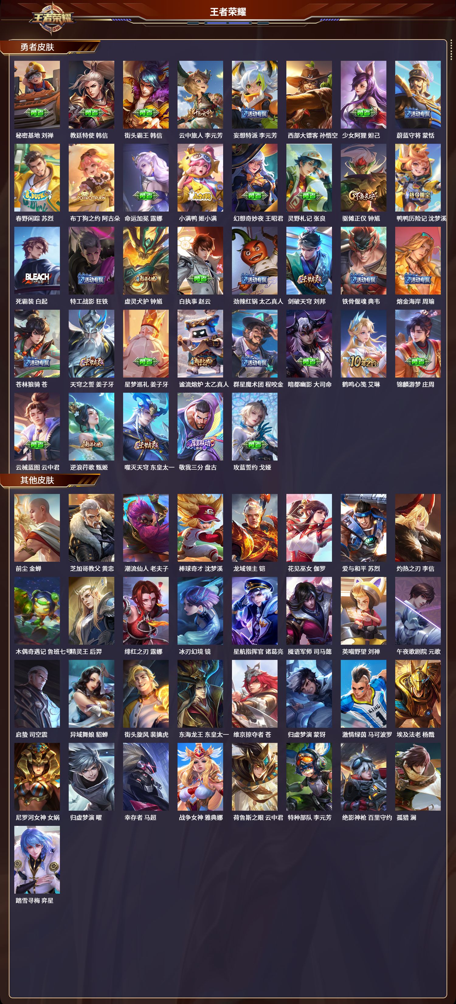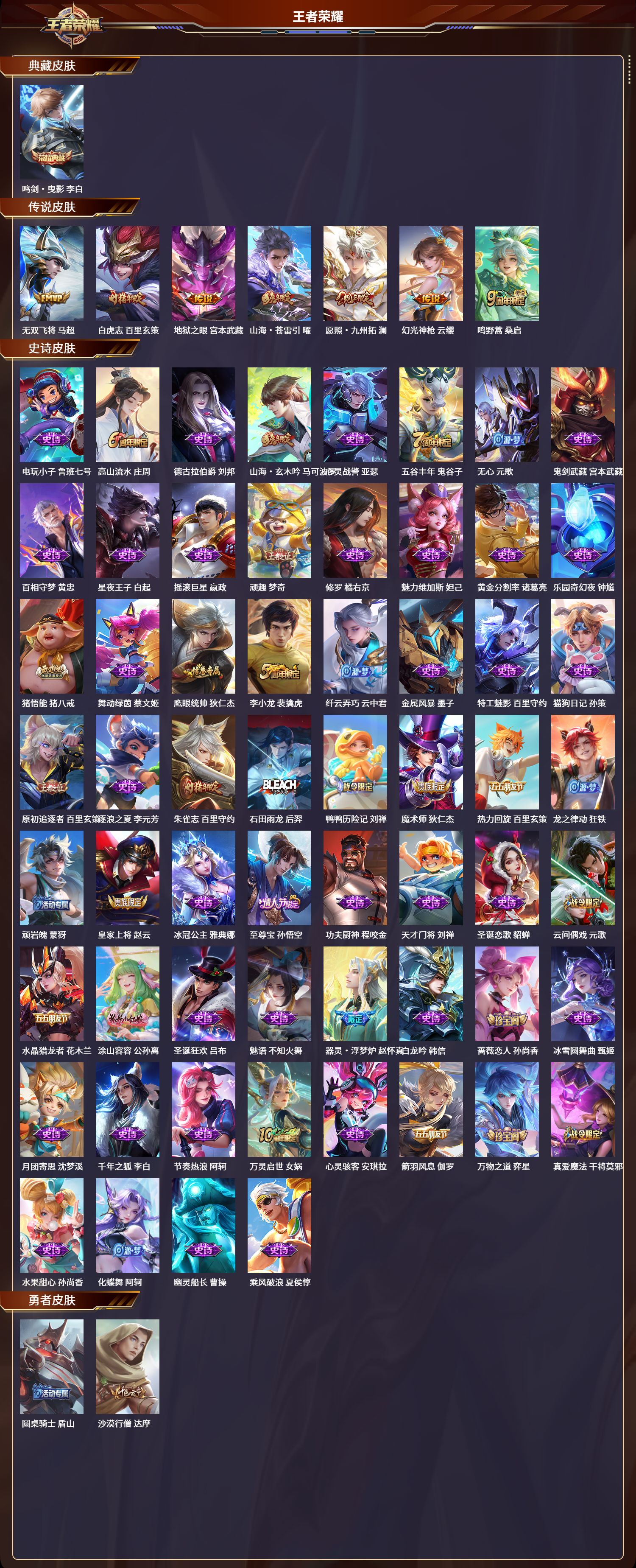 苹果qq/非凡王者/213皮肤/127英雄/1典藏/0珍品无双/0无双/0珍品传说/7传说/60史诗/9稀有英雄【1 典藏皮肤】鸣剑·曳影 李白【7 传说皮肤】无双飞将 马超白虎志 百里玄策地狱之眼 宫本武藏山海·苍雷引 曜愿照·九州拓 澜幻光神呛 云缨鸣野蒿 桑启【60 史诗皮肤】电玩小子 鲁班七号高山流水 庄周德古拉伯爵 刘邦山海·玄木吟 马可波罗心