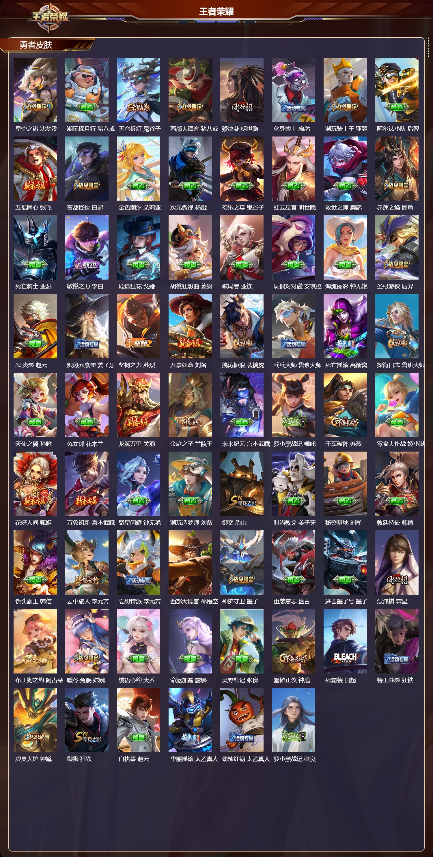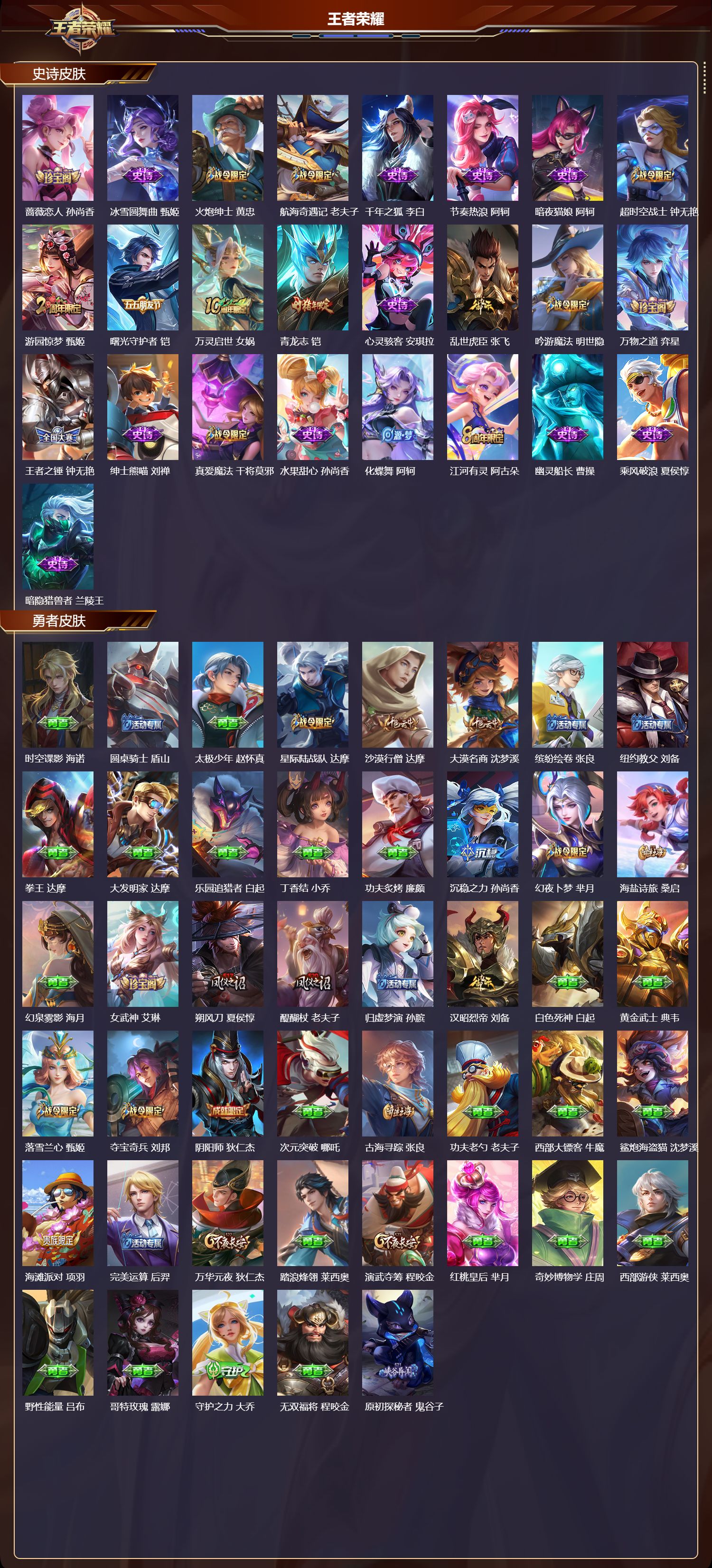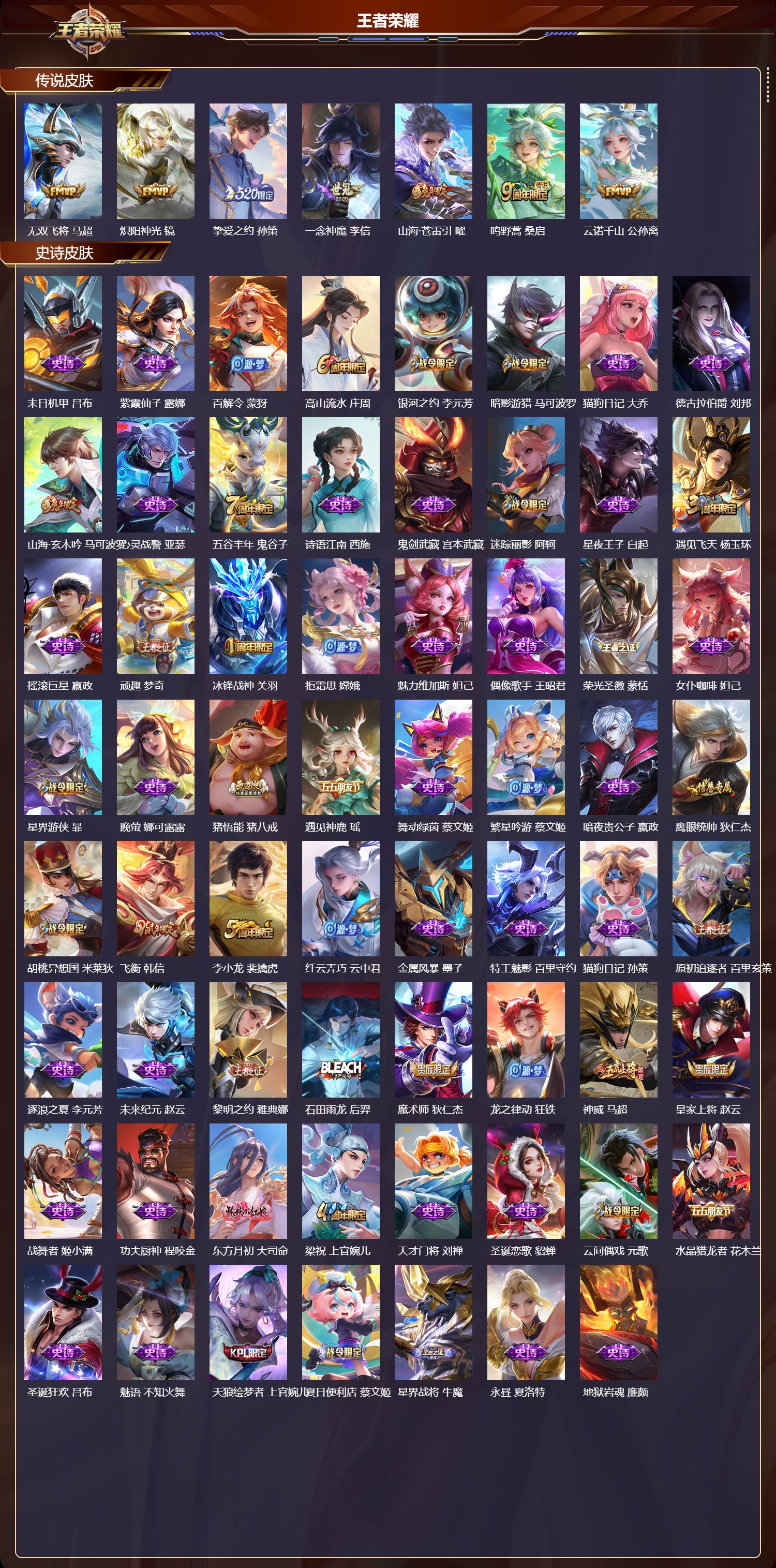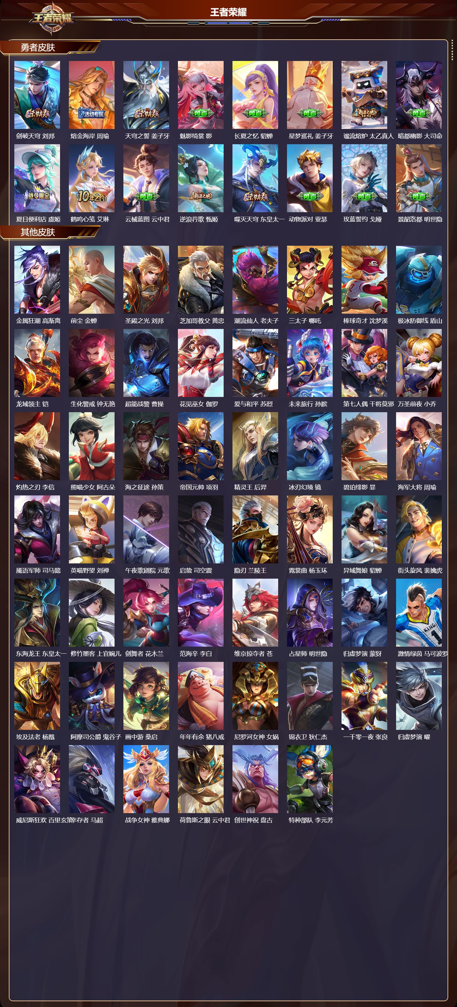 安卓qq/非凡王者/290皮肤/126英雄/0典藏/0珍品无双/0无双/0珍品传说/7传说/88史诗/8稀有英雄【7 传说皮肤】无双飞将 马超炽阳神光 镜挚爱之约 孙策一念神魔 李信山海·苍雷引 曜鸣野蒿 桑启云诺千山 公孙离【88 史诗皮肤】末日机甲 吕布紫霞仙子 露娜百解令 蒙犽高山流水 庄周银河之约 李元芳暗影游猎 马可波罗猫狗日记 大乔德古拉