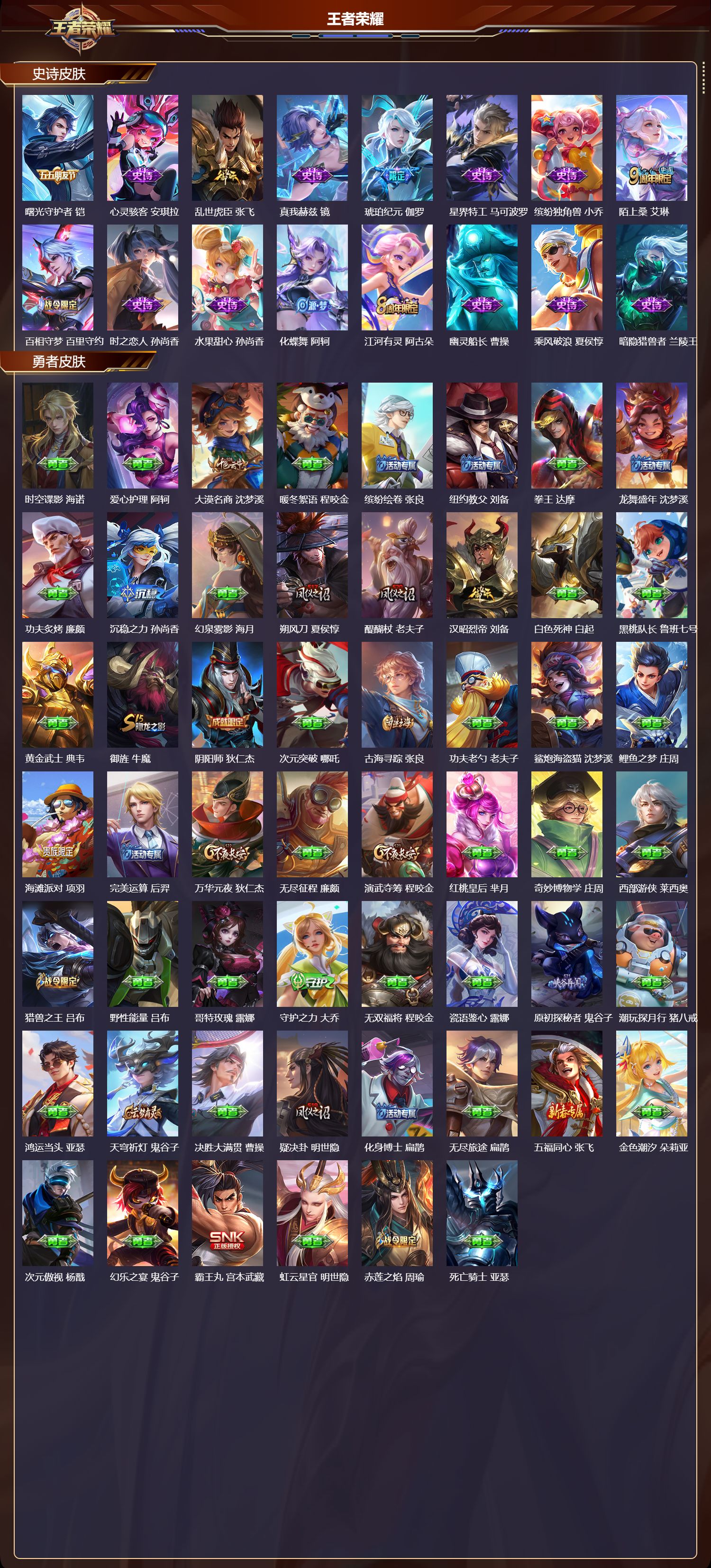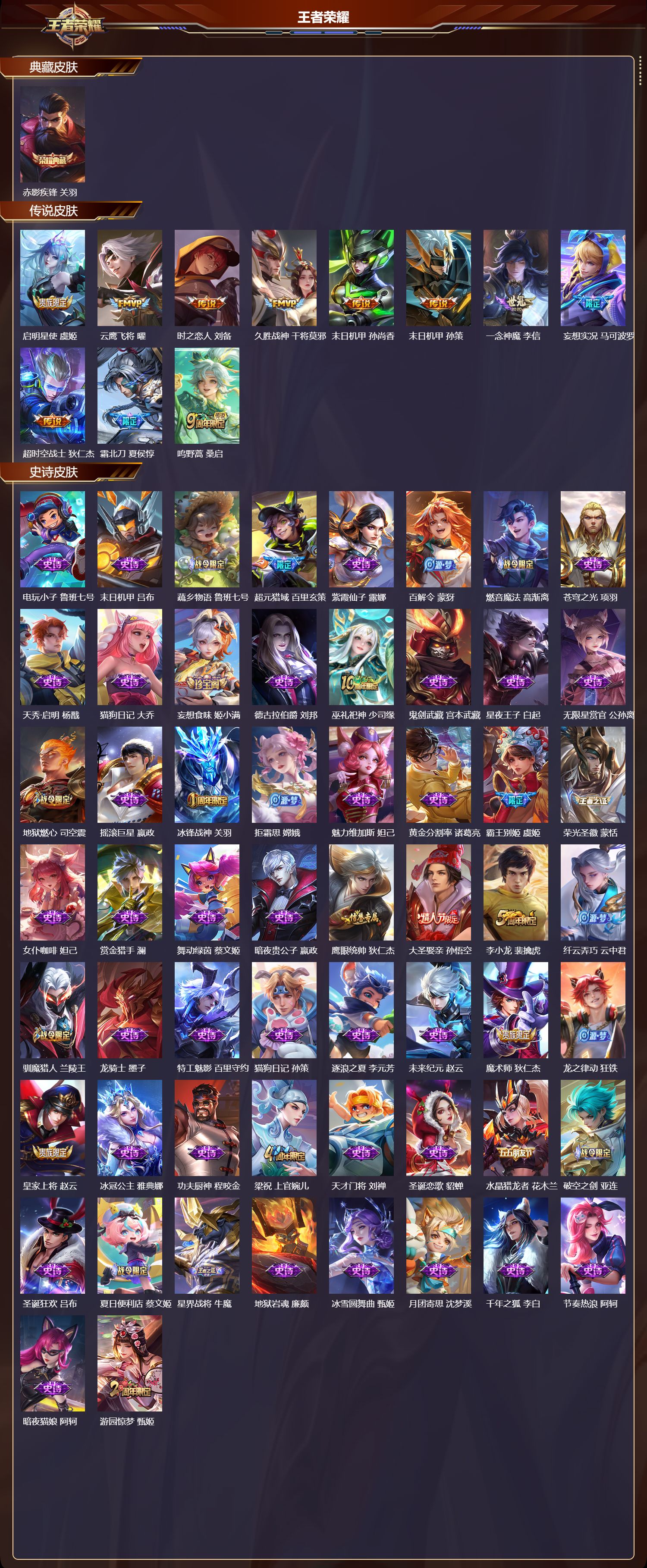 苹果qq/非凡王者/268皮肤/127英雄/1典藏/0珍品无双/0无双/0珍品传说/11传说/74史诗/9稀有英雄【1 典藏皮肤】赤影疾锋 关羽【11 传说皮肤】启明星使 虞姬云鹰飞将 曜时之恋人 刘备久胜战神 干将莫邪末日机甲 孙尚香末日机甲 孙策一念神魔 李信妄想实况 马可波罗超时空战士 狄仁杰霜北刀 夏侯惇鸣野蒿 桑启【74 史诗皮肤】电玩小子 鲁
