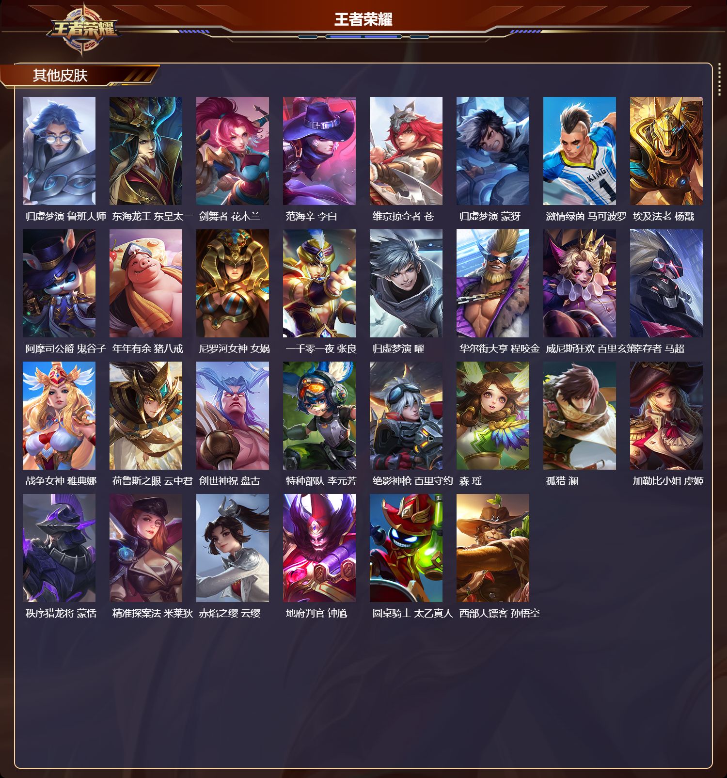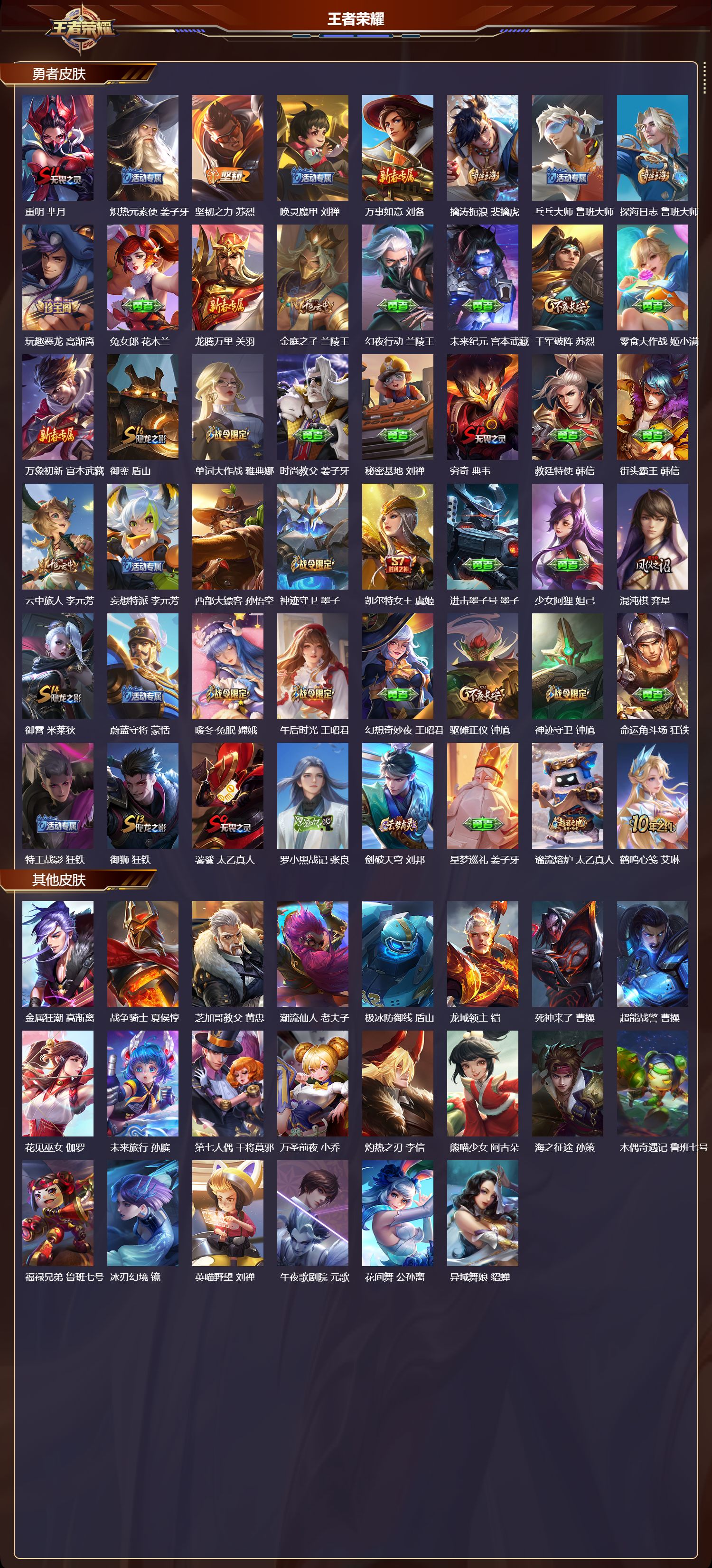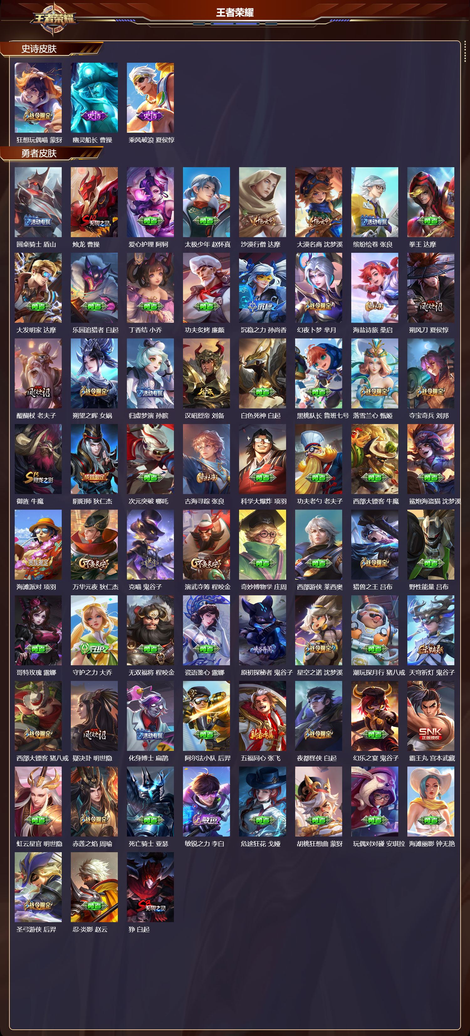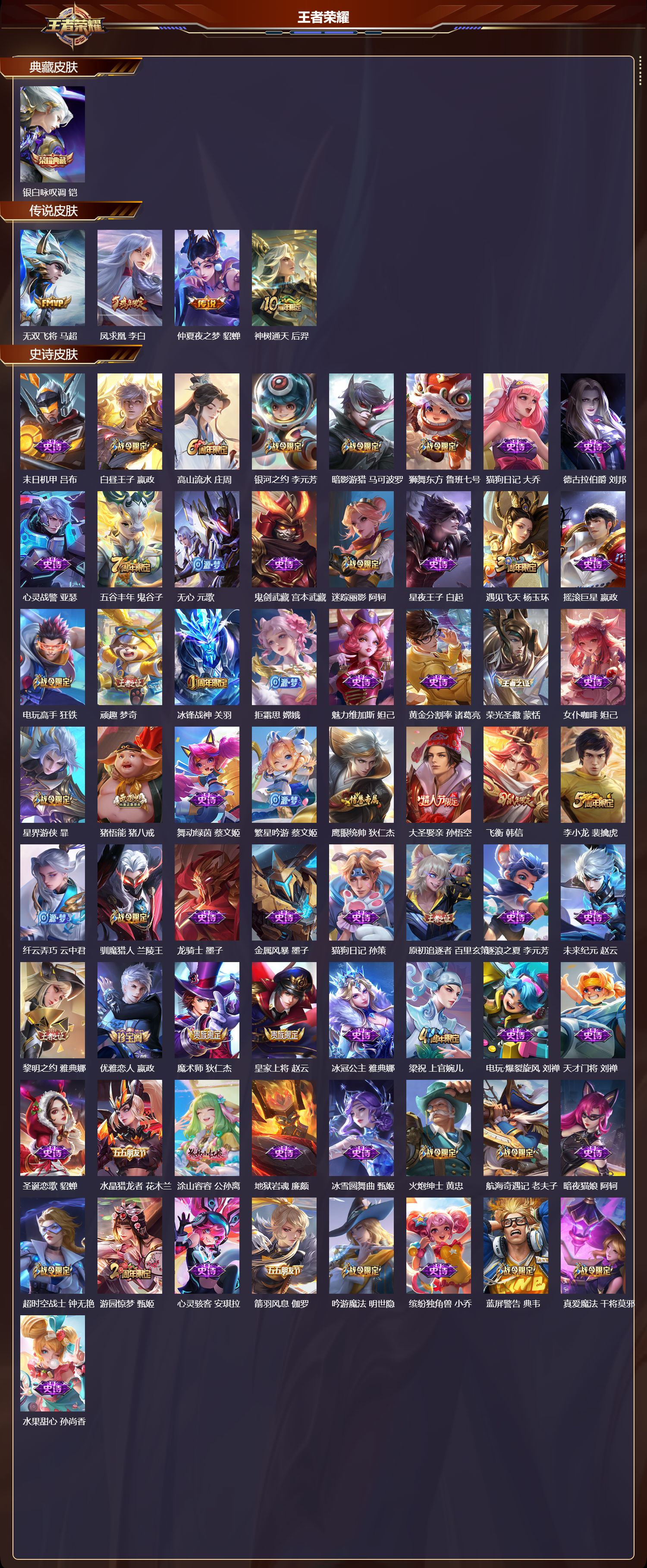 安卓qq/永恒钻石/239皮肤/126英雄/1典藏/0珍品无双/0无双/0珍品传说/4传说/68史诗/8稀有英雄【1 典藏皮肤】银白咏叹调 铠【4 传说皮肤】无双飞将 马超凤求凰 李白仲夏夜之梦 貂蝉神树通天 后羿【68 史诗皮肤】末日机甲 吕布白昼王子 嬴政高山流水 庄周银河之约 李元芳暗影游猎 马可波罗狮舞东方 鲁班七号猫狗日记 大乔德古拉伯爵 刘邦