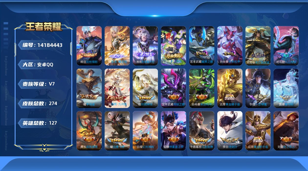 [14184443]【终身售后 找回包赔】安卓手q389区274皮1珍品传说1典藏30传说2无双 营地id1832811693包人脸v7最强王者 【珍品传说皮肤】:时之奇旅【无双皮肤】:群星魔术团器灵·螭龙剑【荣耀典藏】:弑呛猎影【星传说】:幽冥之眼未来机甲,【优质限定皮肤】:至尊宝【传说皮肤】:燃星之曲千山共赴死亡执政官九山相柳炽阳神光战鼓燎原霜月吟幻光神呛愿照·九州拓诗剑行启明星使音你心动时之恋人云霓雀翎胖达荣荣仲夏夜之梦猫影幻舞久胜战神黄金射手座飞鸢探春地狱之眼超时空战士音你心动末日机甲一念神魔云鹰飞将绛天战甲黄金狮子座地狱火李 【特殊英雄】:嬴政敖隐,【史诗皮肤】:遇见飞天冰冠公主地狱岩魂节奏热浪织梦人至尊宝东方月初涂山容容百相守梦百相守梦永昼赞萌露比戍鼓铭心乱世虎臣功夫厨神龙之律动圣诞恋歌箭羽风息化蝶舞瑰影绮梦紫霞仙子猫狗日记茶境仙傲雪梅呛山海·玄木吟妄想食味心灵骇客心灵战警李小龙乘风破浪群星魔术团蓝屏警告暗渊魔法千年之狐缤纷独角兽冰雪圆舞曲蔬乡物语女仆咖啡白昼王子燃音魔法无限星赏官纤云弄巧拒霜思末日机甲地狱燃心江河有灵匿光侦查者乒乒小将云间偶戏驭风魔法未来纪元电玩·爆裂旋风奇幻香踪星夜王子猫狗日记无心水果甜心暗隐猎兽者五谷丰年电玩高手鹰眼统帅鬼剑武藏金属风暴诗语江南特工魅影龙骑士白龙吟逐浪之夏曙 星元:49星传说:2按键:26签名:3贵族:8点卷:7皮肤碎片:223荣耀积分:41英雄碎片:1169星传说:孙尚香未来机甲宫本武藏幽冥之眼