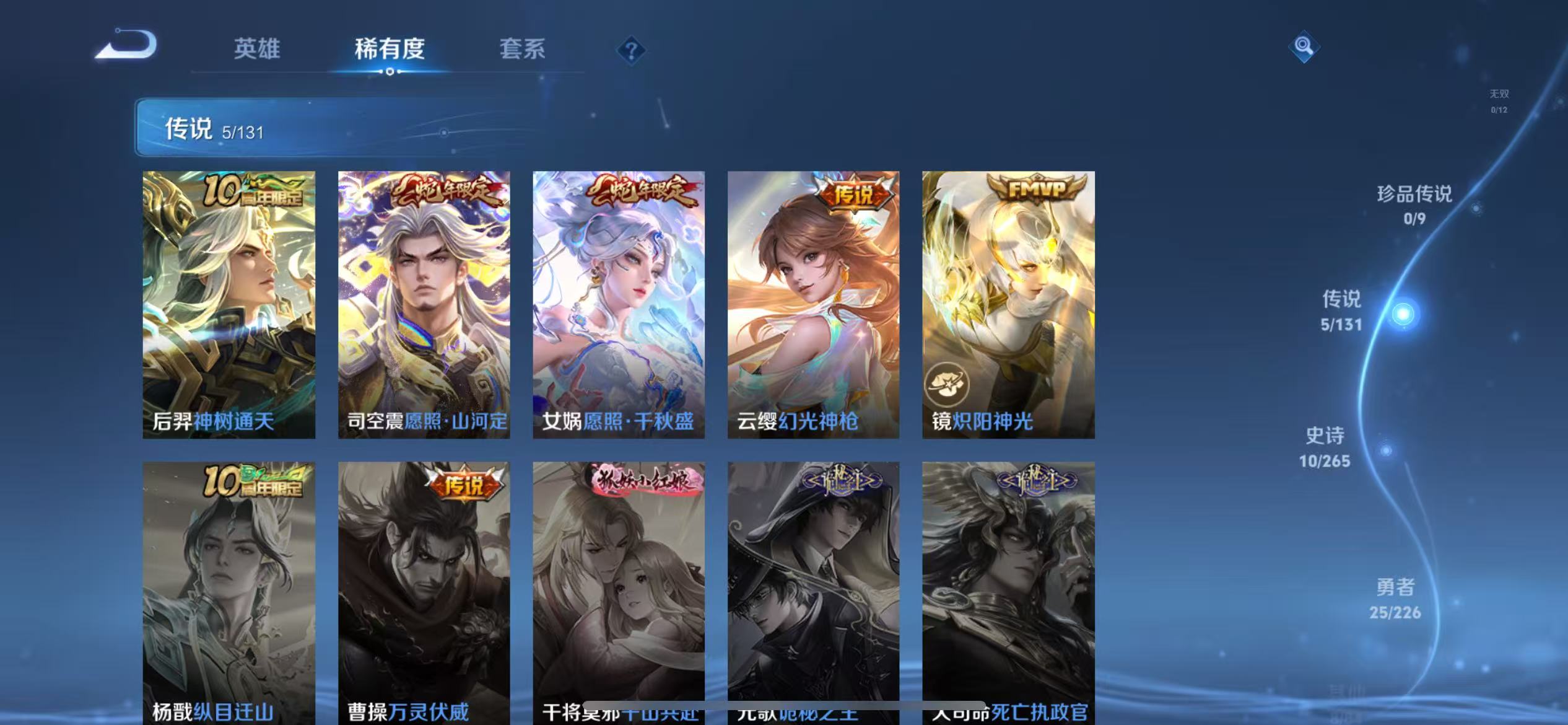 【王者荣耀】【lywz20580】珍品无双0 典藏0 无双0 珍品传说0 传说5 史诗10 英雄71 皮肤48 贵族5级 传说皮肤:炽阳神光|幻光神呛|愿照·山河定|愿照·千秋盛|神树通天__稀有限定:山海·玄木吟|海滩派对|皇家上将|降魔|万华元夜|缤纷独角兽|鬼剑武藏|节奏热浪|魅力维加斯|水果甜心|舞动绿茵|心灵骇客|逆浪荇歌|荣光之誓|鹤鸣心笺__优质皮肤:尼罗河女神|午夜歌剧院|露花倒影|冰刃幻境|威尼斯狂欢|福禄兄弟|霓裳曲|兔女郎|死亡骑士|玩偶对对碰|宫本武藏-未来纪元|忍·炎影|街头霸王|危途狂花|拳王|爆裂喵拳|掌控之力|铁骨偃魂|龙舞盛年|万事如意|曜-归虚梦演|完美运算|花好人间|潮玩骑士王|苍林狼骑|踏浪烽翎|落日弦歌|逐霄之志__贵族等级:贵族5级__王者段位:非凡王者【传说皮肤】5 神树通天,炽阳神光,愿照·千秋盛,愿照·山河定,幻光神呛山海·玄木吟