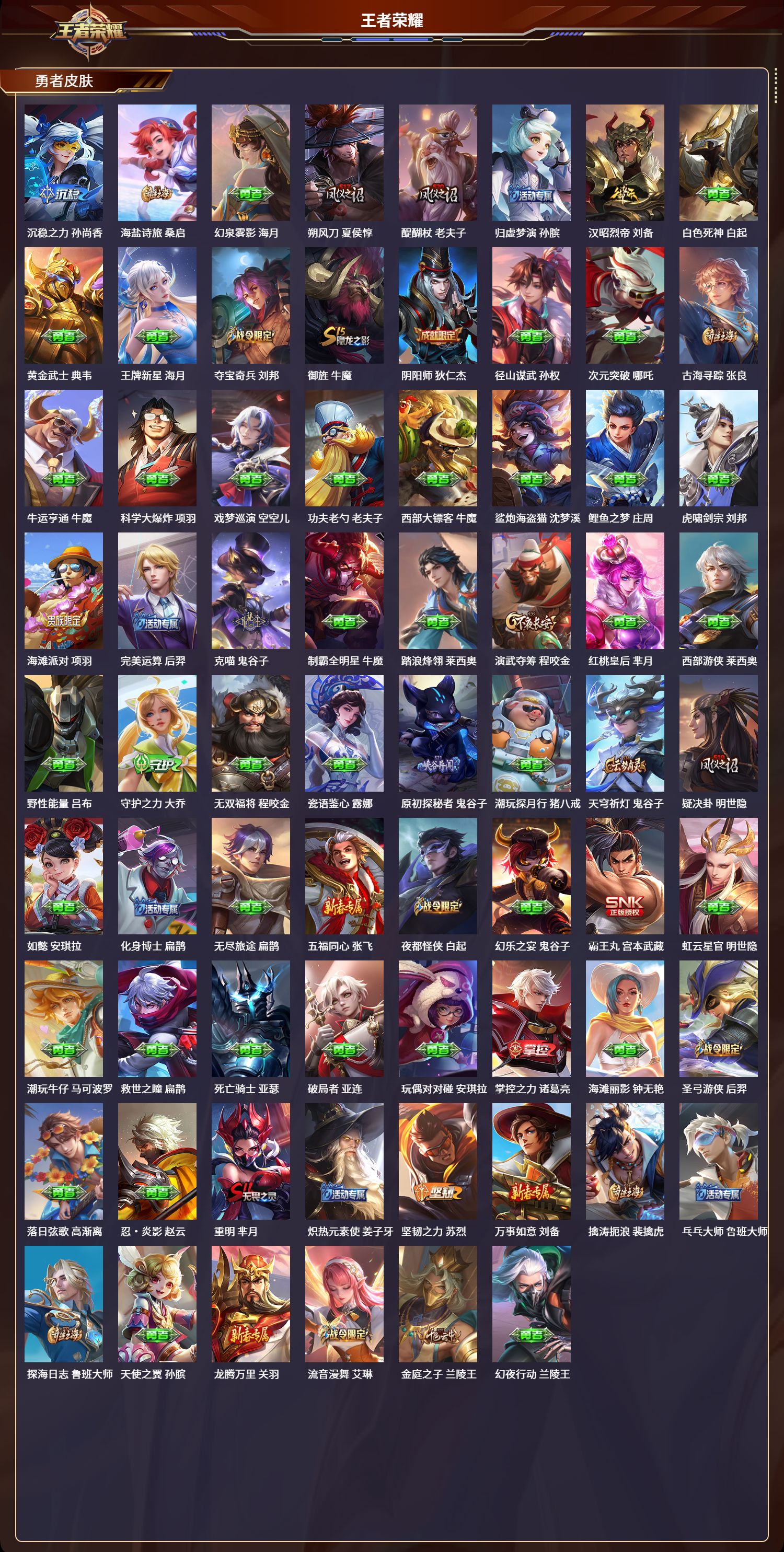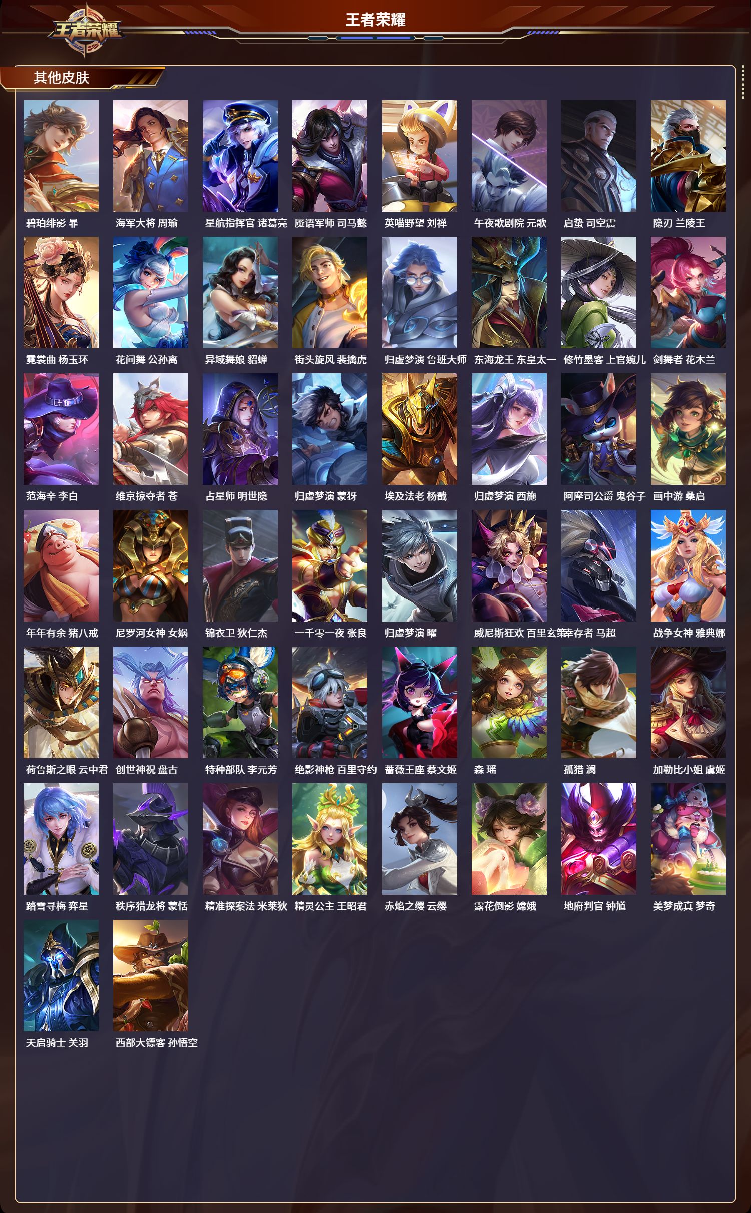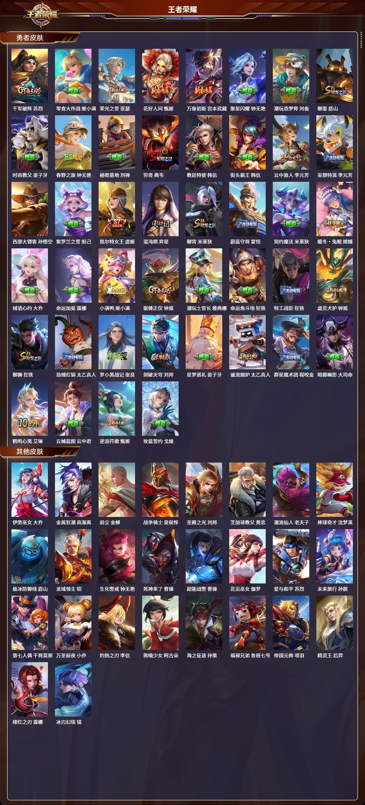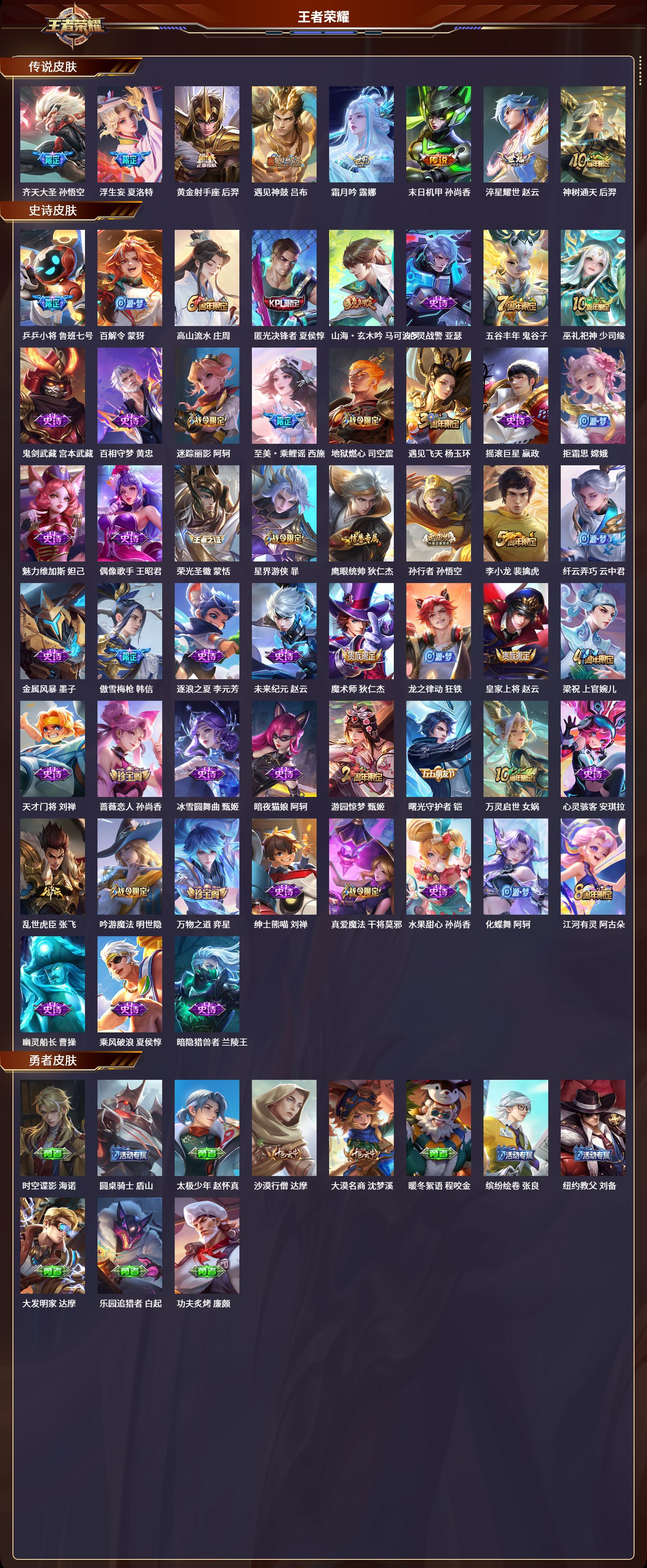 苹果qq/至圣王者/260皮肤/126英雄/0典藏/0珍品无双/0无双/0珍品传说/8传说/51史诗/8稀有英雄【8 传说皮肤】齐天大圣 孙悟空浮生妄 夏洛特黄金射手座 后羿遇见神鼓 吕布霜月吟 露娜末日机甲 孙尚香淬星耀世 赵云神树通天 后羿【51 史诗皮肤】乒乒小将 鲁班七号百解令 蒙犽高山流水 庄周匿光决锋者 夏侯惇山海·玄木吟 马可波罗心灵战警 亚瑟五谷丰年 鬼