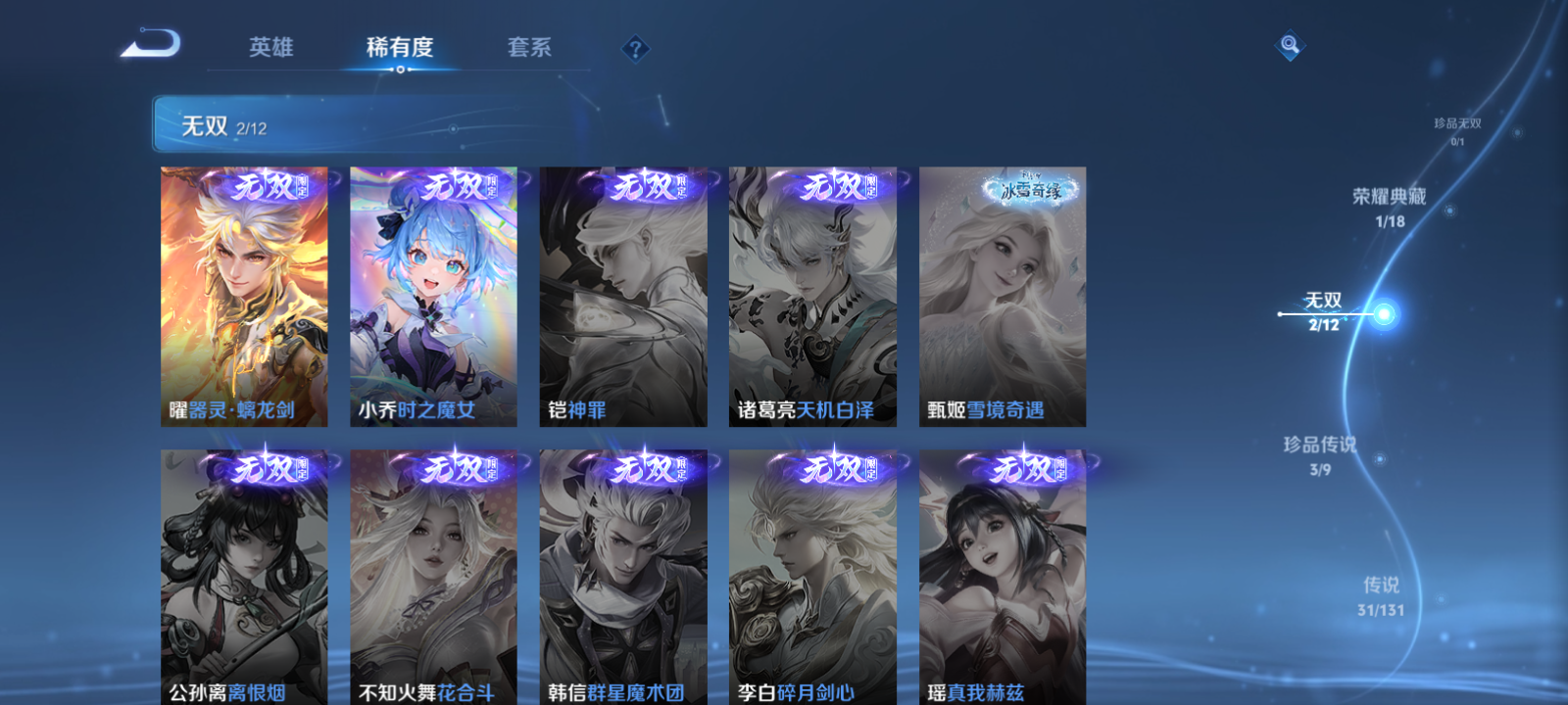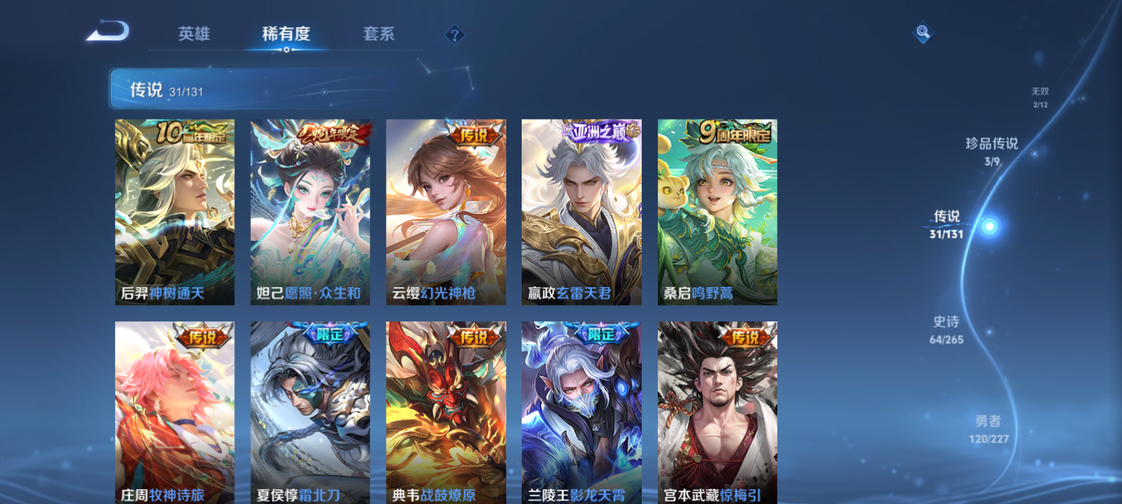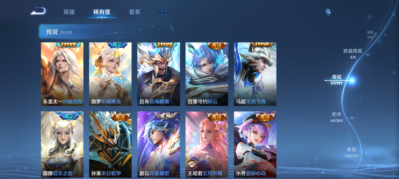 【王者荣耀】【lywz22054】珍品无双0 典藏1 无双2 珍品传说3 传说31 史诗64 英雄127 皮肤263 贵族4级 荣耀典藏:弑呛猎影__无双皮肤:时之魔女|器灵·螭龙剑__珍品传说:孙策-时之奇旅|器灵·落星盏|兔狲·蓬尾__传说皮肤:鸣野蒿|无双飞将|启示之音|绛天战甲|启明星使|地狱之眼|孙策-末日机甲|仲夏夜之梦|云霓雀翎|久胜战神|狄仁杰-超时空战士|刘备-时之恋人|一念神魔|飞鸢探春|乞巧织情|淬星耀世|炽翼辉光|孙尚香-末日机甲|惊梅引|怒海麟威|碎云|小乔-音你心动|影龙天霄|战鼓燎原|灼幽烈阳|牧神诗旅|玄雷天君|幻光神呛|愿照·众生和|神树通天__稀有限定:至尊宝|引擎之心|李小龙|百解令|百木心呛|大漠名商|电玩高手|高山流水|古海寻踪|海滩派对|海盐诗旅|幻夜卜梦|皇家上将|混沌棋|火炮绅士|剑破天穹|江河有灵|金庭之子|炼金王|迷踪丽影|魔术师|女武神|千军破阵|擒涛扼浪|驱傩正仪|燃音魔法|荣光圣徽|沙漠行僧|朔风刀|探海日志|醍醐杖|天狼狩猎者|天穹祈灯|万华元夜|妄想食味|无心|五谷丰年|午后时光|演武夺筹|妖精王|夜都怪侠|疑决卦|阴阳师|吟游魔法|御銮|原初追逐者|暗夜贵公子|暗夜猫娘|暗隐猎兽者|缤纷独角兽|冰冠公主|冰雪圆舞曲|苍穹之光|乘风破浪|地狱岩魂|电玩小子|功夫厨神|鬼剑武藏|黄金分割率|箭羽风息|节奏热浪|金属风暴|龙骑士|吕布-末日机甲|魅力维加斯|魅语|女仆咖啡|偶像歌手|绅士熊喵|圣诞狂欢|圣诞恋歌|水果甜心|天才门将|晚萤|星夜王子|鹰眼统帅|永昼|幽灵船长|钟无艳-超时空战士|逐浪之夏|噬灭天穹|战舞者|霜北刀|顽岩魄|天穹之誓|修罗|心灵战警|千年之狐|舞动绿茵|特工魅影|心灵骇客|星界战将|谧流熔炉|狰|原初探秘者|云中旅人|灵卜魔法|夺宝奇兵|圣弓游侠|落雪兰心|布丁狗之约|虚灵犬护|逆浪荇歌|黄忠-百相守梦|鹤鸣心笺__优质皮肤:尼罗河女神|创世神祝|年年有余|埃及法老|木偶奇遇记|熊喵少女|未来旅行|激情绿茵|锦衣卫|冰刃幻境|超能战警|维京掠夺者|踏雪寻梅|伊势巫女|威尼斯狂欢|街头旋风|地府判官|荷鲁斯之眼|赤焰之缨|福禄兄弟|隐刃|前尘|特种部队|三太子|范海辛|星航指挥官|龙域领主|占星师|花间舞|极冰防御线|花见巫女|东海龙王|蔷薇王座|灼热之刃|精准探案法|帝国元帅|阿摩司公爵|万圣前夜|破阵·退雄兵|功夫炙烤|潮玩探月行|秘密基地|次元突破|鲨炮海盗猫|丁香结|虹云星官|守护之力|坚韧之力|幻乐之宴|功夫老勺|海滩丽影|阿尔法小队|兔女郎|死亡骑士|黄金武士|少女阿狸|天使之翼|宫本武藏-未来纪元|东方不败|红桃皇后|忍·炎影|街头霸王|教廷特使|漠中幻影|时空谍影|破局者|潮玩造梦师|契约魔法|拳王|时尚教父|救世之瞳|白色死神|程咬金-星际陆战队|大发明家|哥特玫瑰|西施-雪境奇遇|星梦巡礼|景韶洛都|浪漫序章|缤纷绘卷|掌控之力|雾都夜雨|铁骨偃魂|纽约教父|龙腾万里|霸王丸|敏锐之力|牛魔-西部大镖客|热血海滩|龙舞盛年|汉昭烈帝|乓乓大师|五福同心|盾山-圆桌骑士|蒙犽-归虚梦演|万事如意|唤灵魔甲|太乙真人-圆桌骑士|沉稳之力|完美运算|化身博士|花好人间|熔金海岸|春野之旅|万象初新|苍林狼骑|蔚蓝守将|劲辣红锅|妄想特派|春野闲踪|灵野札记|玫蓝誓约|命运加冕|小满鸭|死霸装|无双福将|锦麟游梦|踏浪烽翎|云械蓝图|哪吒-罗小黑战记__贵族等级:贵族4级__王者段位:至尊星耀捡漏无双曜 珍品孙策 嫦娥张飞典藏韩信等超多热门皮肤限定