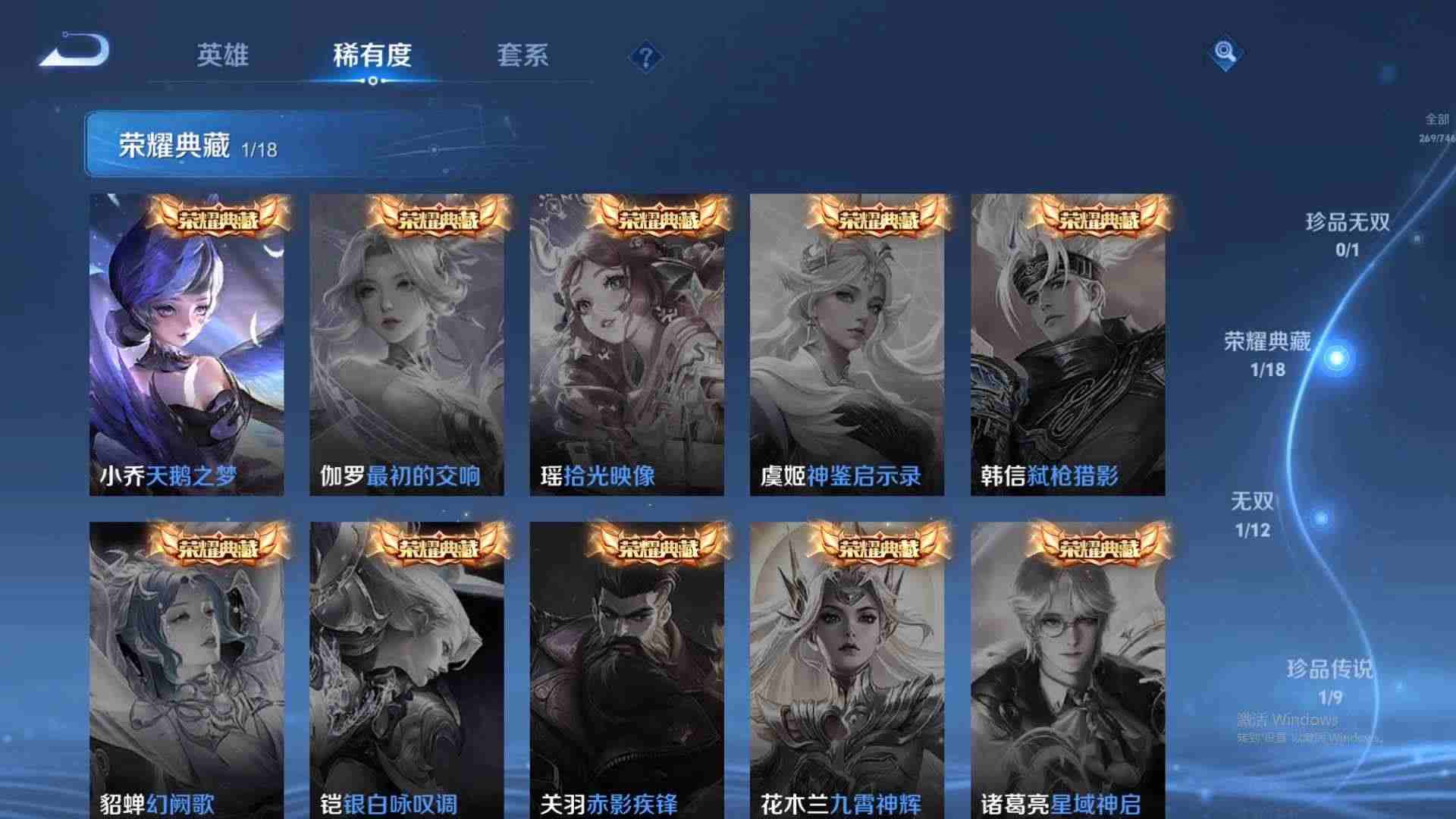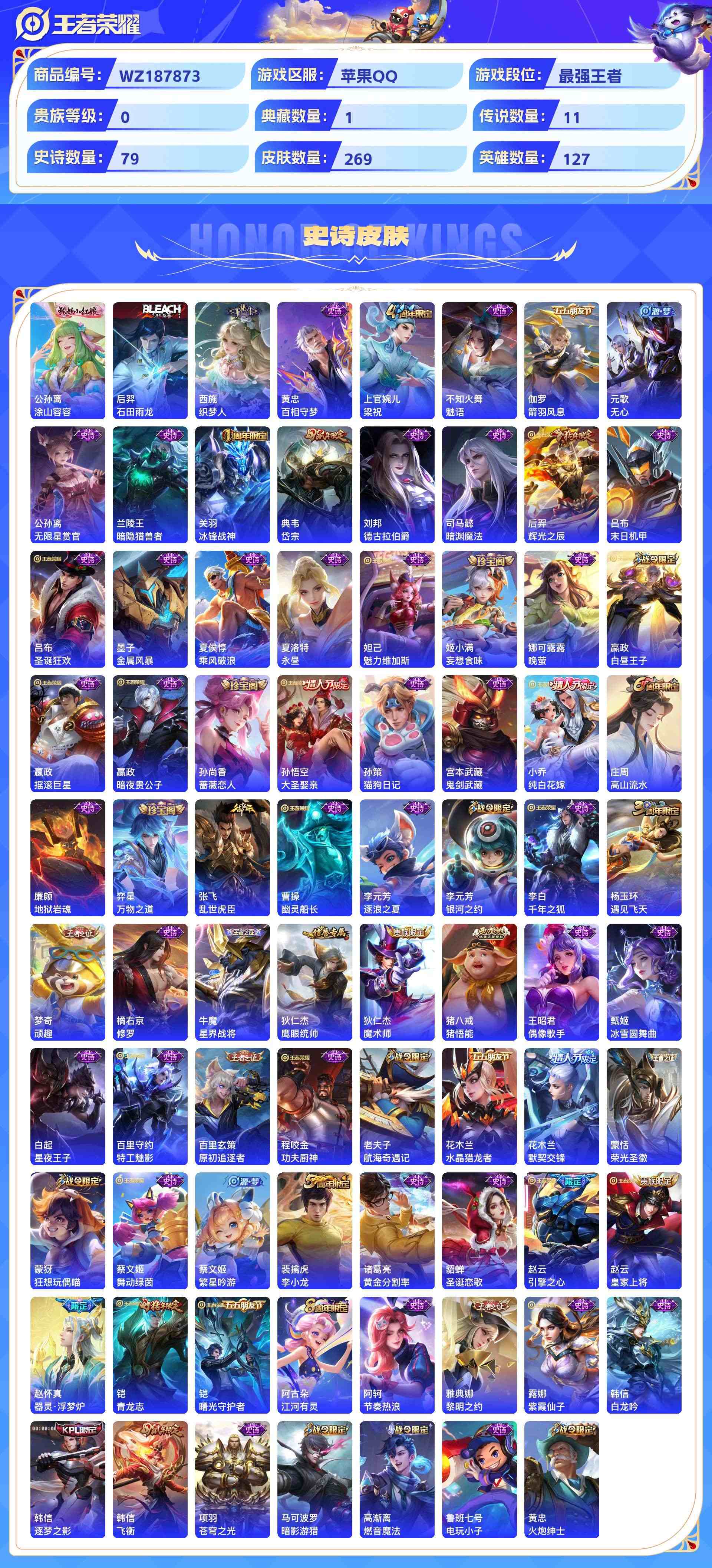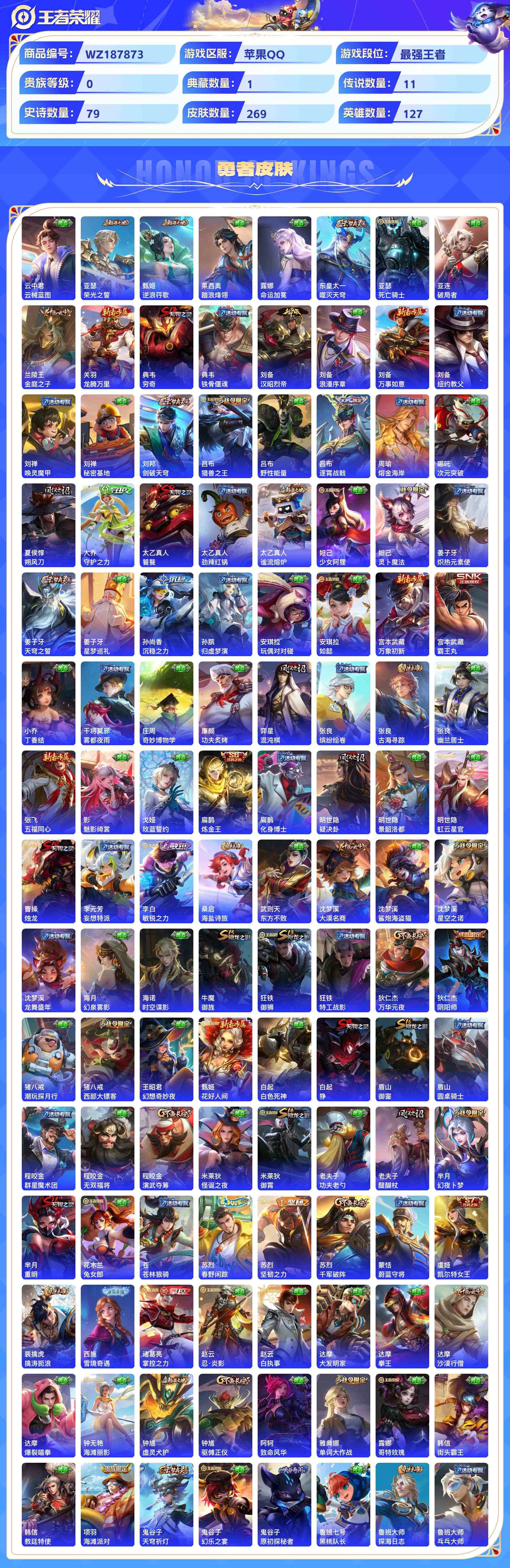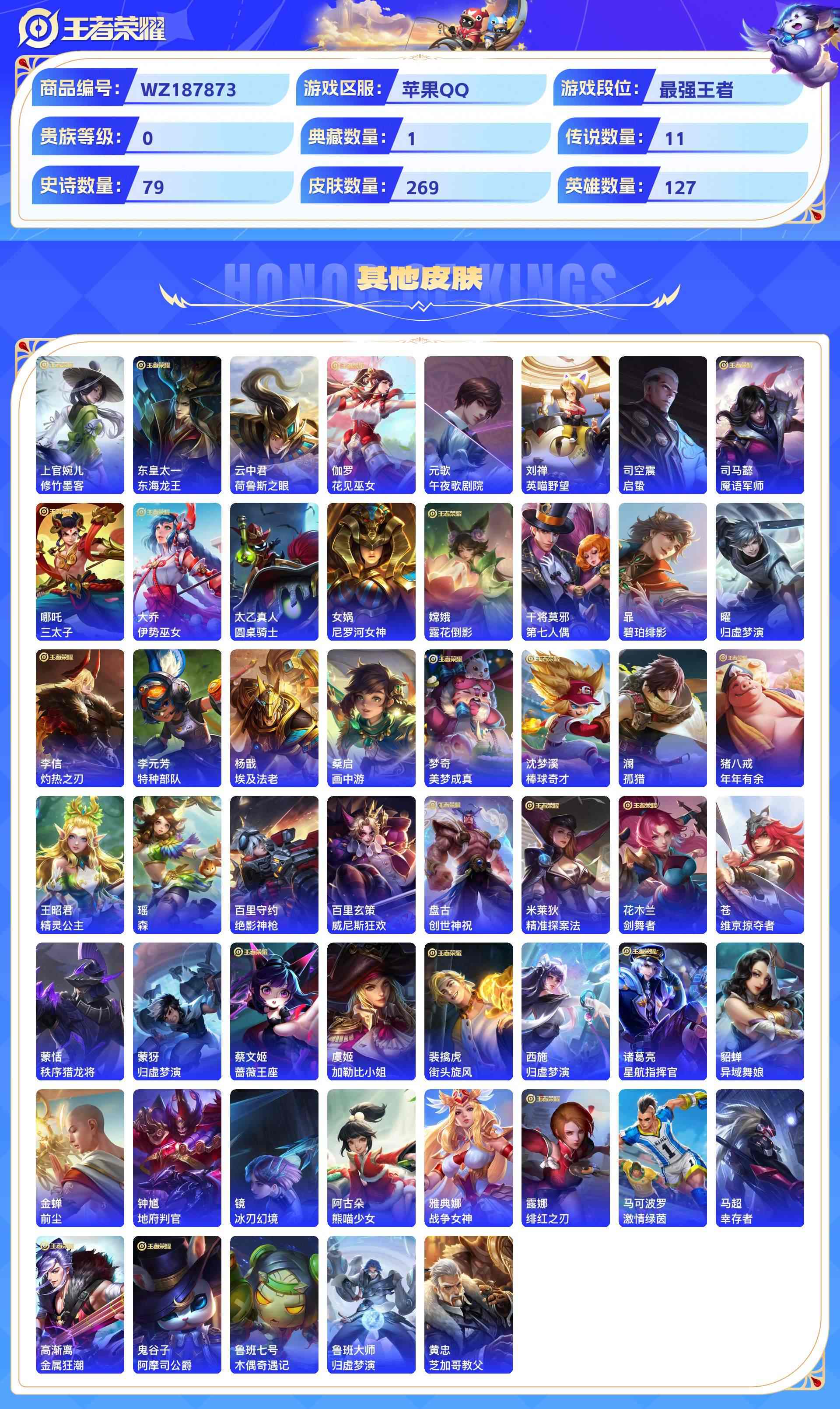wz187873|精品号苹果qq 贵族8 269皮 1典藏(天鹅之梦) 1珍品传说(怪盗基德) 1无双(真我赫兹) 11传说(幻光神呛愿照·山河定久胜战神山海·炽霜斩鸣野蒿愿照·九州拓超时空战士映山客启明星使寅虎·赤拳时雨天司) 79史诗5个性按键1天幕