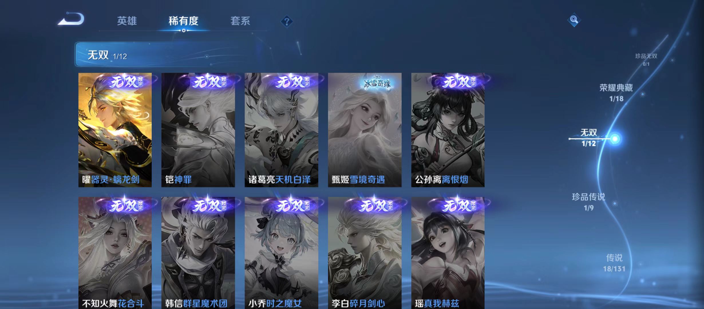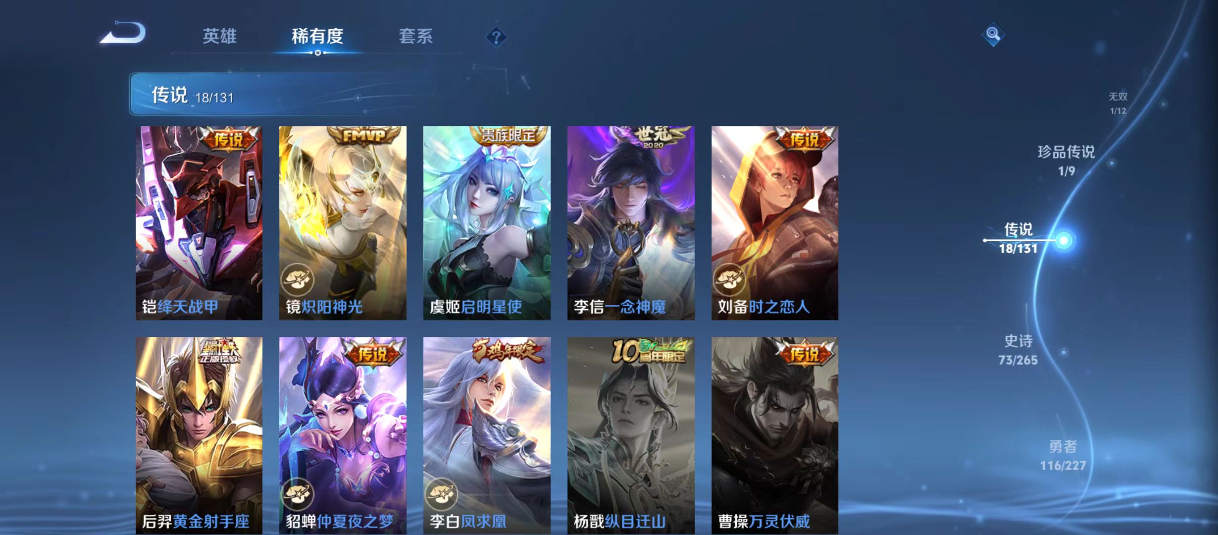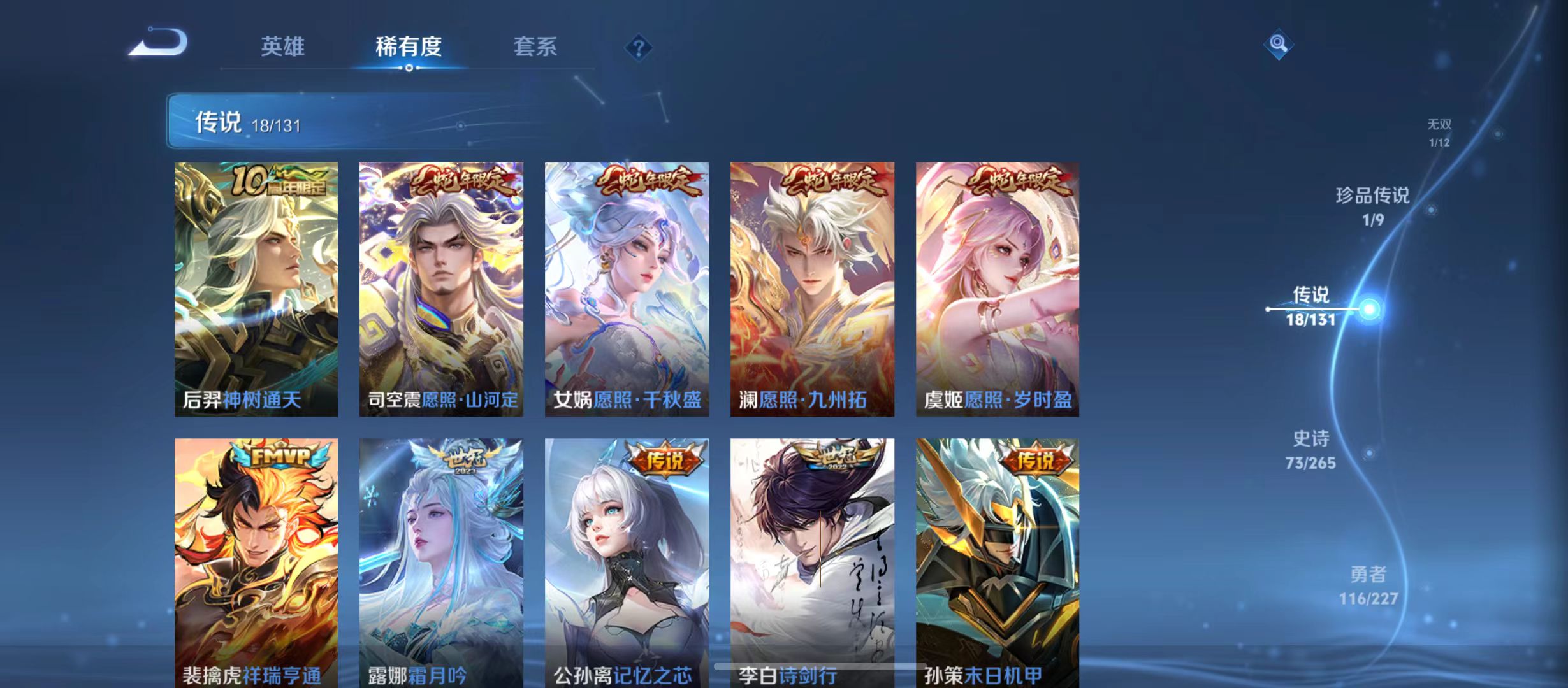 txwz23097-v8-257皮肤 1典藏鸣剑·曳影 1无双器灵·螭龙剑 1珍品黑崎一护 18传说神树通天,启明星使,末日机甲,愿照·山河定,祥瑞亨通,霜月吟,时之恋人,仲夏夜之梦,黄金射手座,绛天战甲,一念神魔,炽阳神光,愿照·千秋盛,愿照·岁时盈,愿照·九州拓,记忆之芯,诗剑行,凤求凰 73史诗