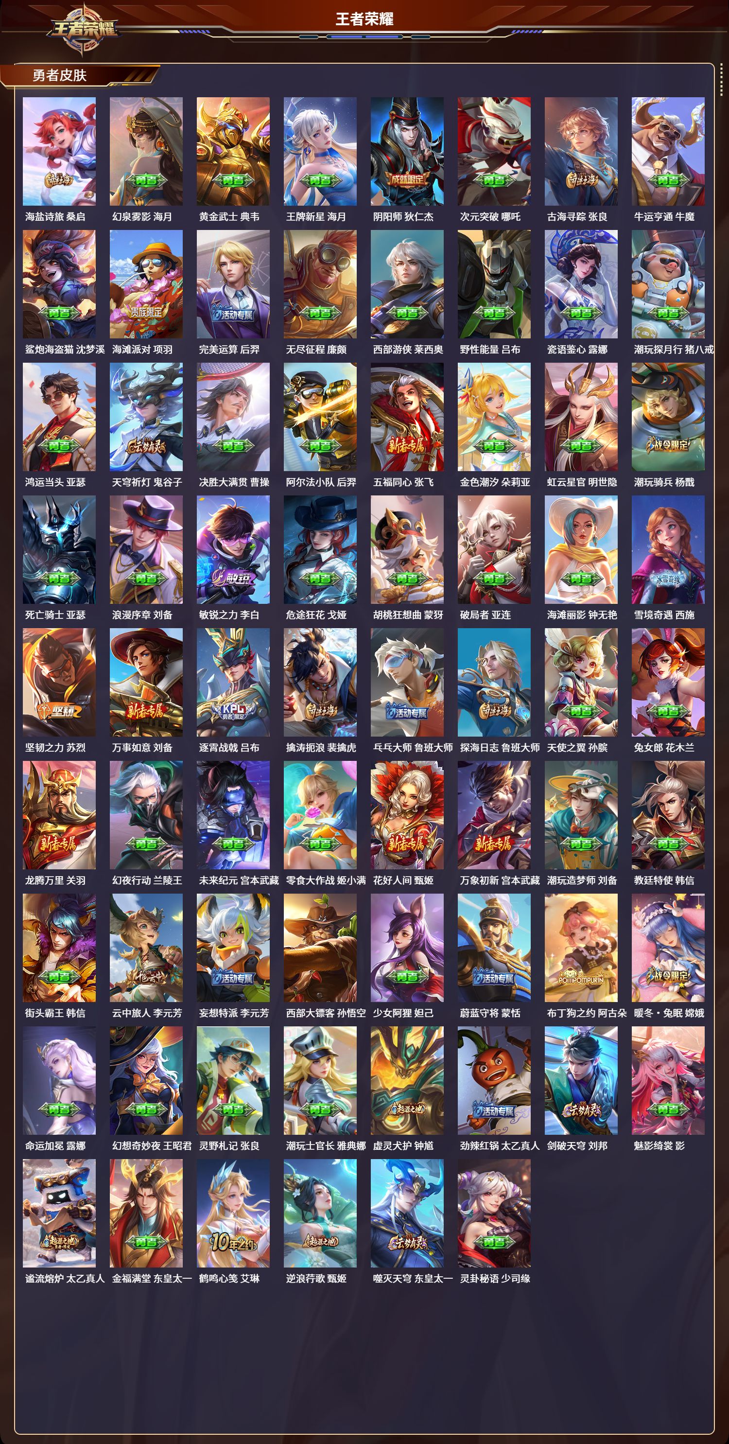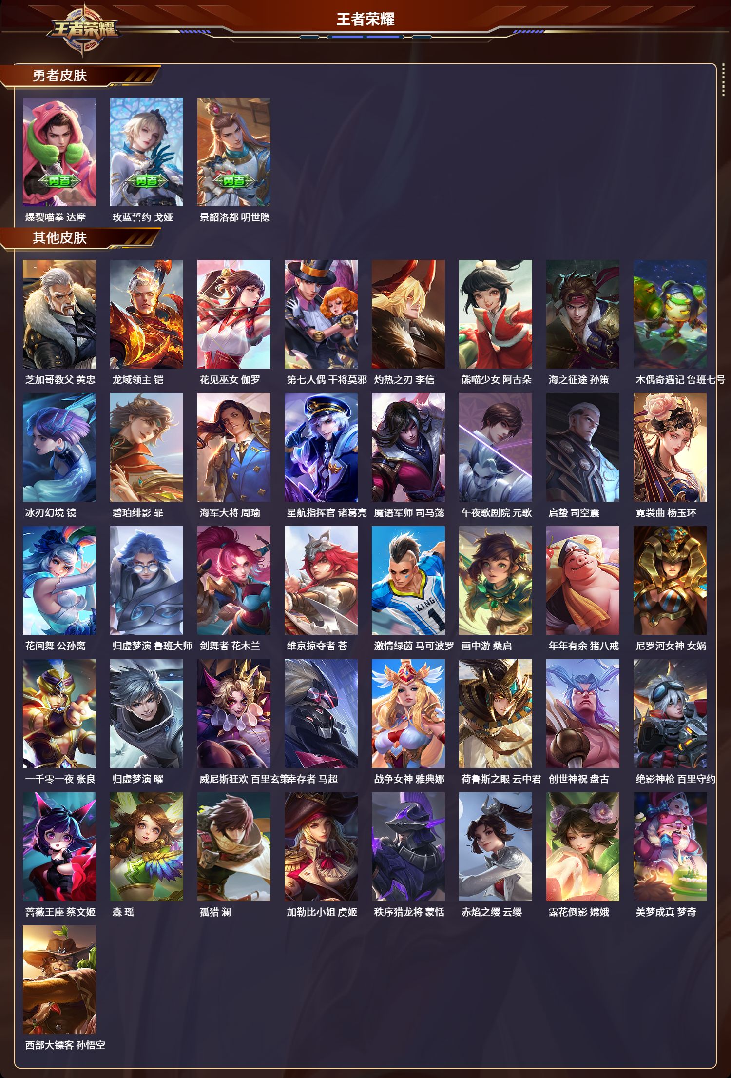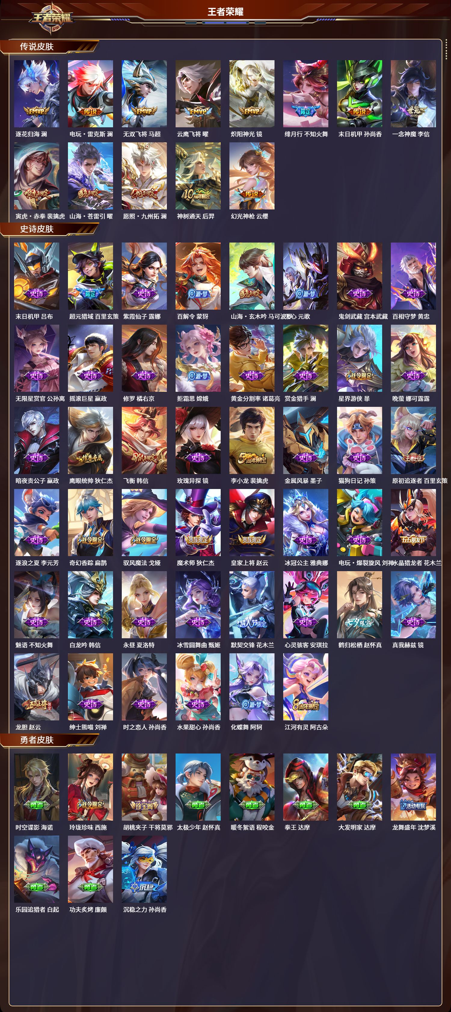 苹果qq/永恒钻石/183皮肤/121英雄/0典藏/0珍品无双/0无双/0珍品传说/13传说/46史诗/6稀有英雄【13 传说皮肤】逐花归海 澜电玩·雷克斯 澜无双飞将 马超云鹰飞将 曜炽阳神光 镜绯月行 不知火舞末日机甲 孙尚香一念神魔 李信寅虎·赤拳 裴擒虎山海·苍雷引 曜愿照·九州拓 澜神树通天 后羿幻光神呛 云缨【46 史诗皮肤】末日机甲 吕布超元猎域 百里玄策