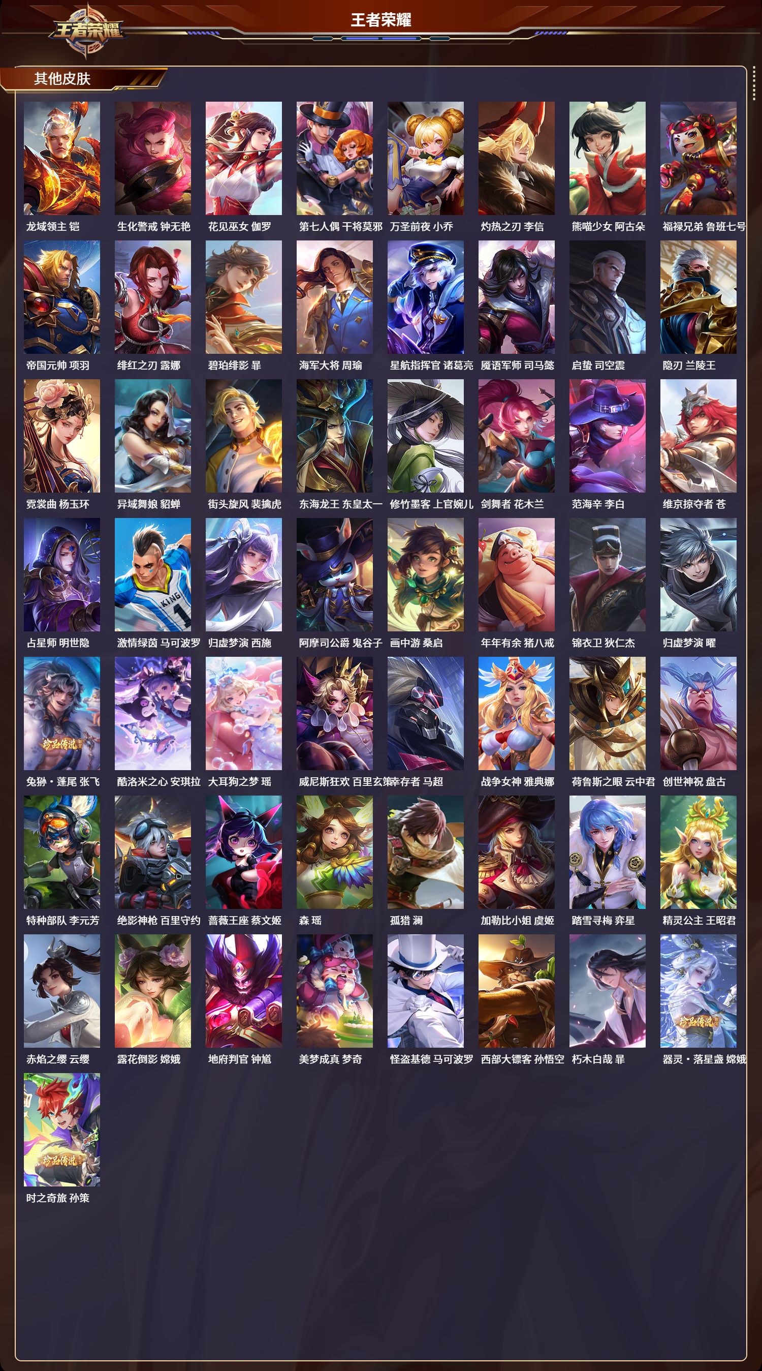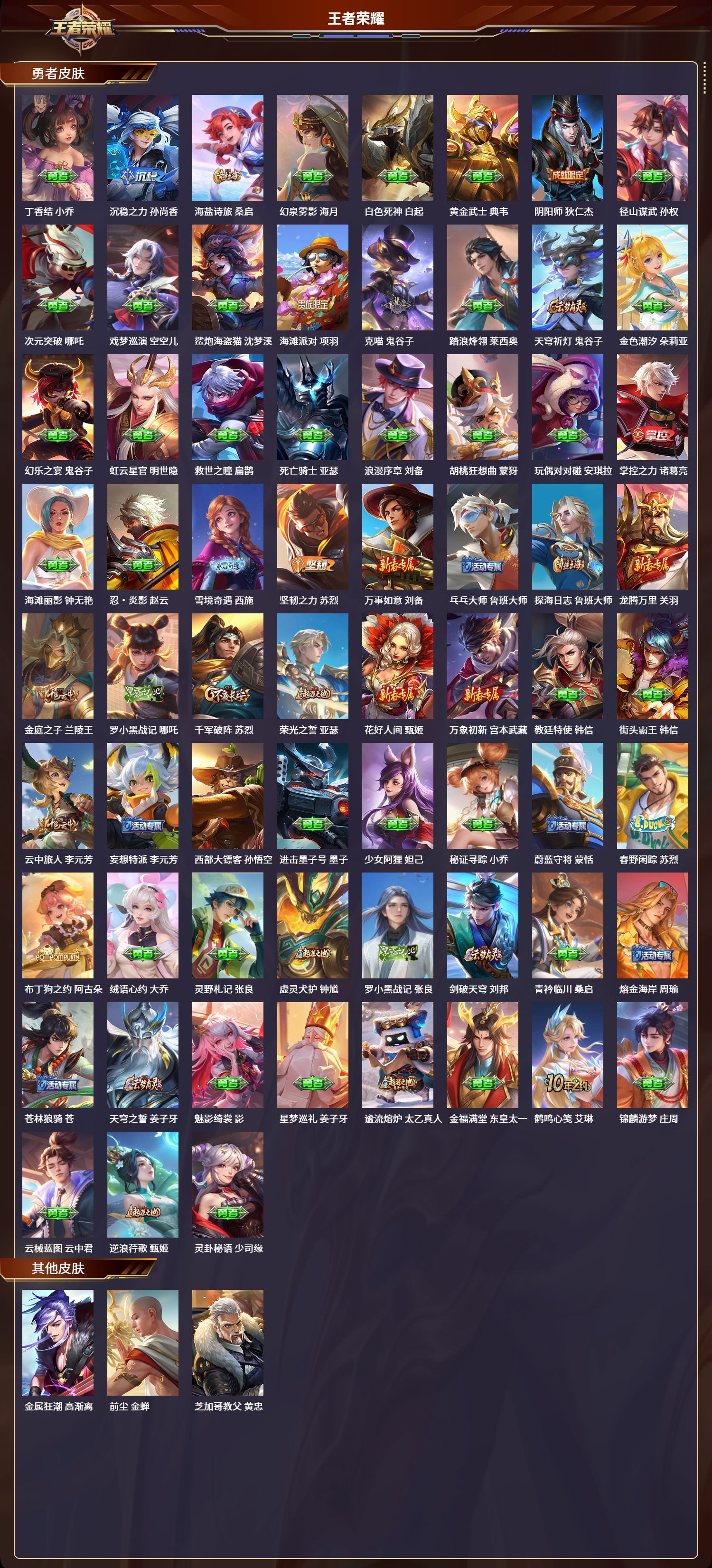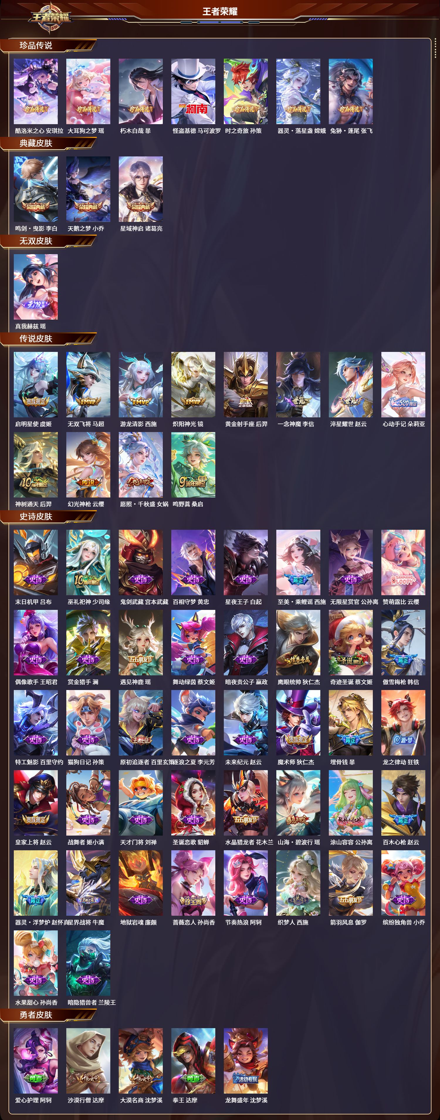安卓qq/荣耀王者/190皮肤/125英雄/3典藏/0珍品无双/1无双/7珍品传说/12传说/42史诗/9稀有英雄【7 珍品传说】酷洛米之心 安琪拉大耳狗之梦 瑶朽木白哉 暃怪盗基德 马可波罗时之奇旅 孙策器灵·落星盏 嫦娥兔狲·蓬尾 张飞【3 典藏皮肤】鸣剑·曳影 李白天鹅之梦 小乔星域神启 诸葛亮【1 无双皮肤】真我赫兹 瑶【12 传说皮肤】启明星使 虞姬无双飞将 马超