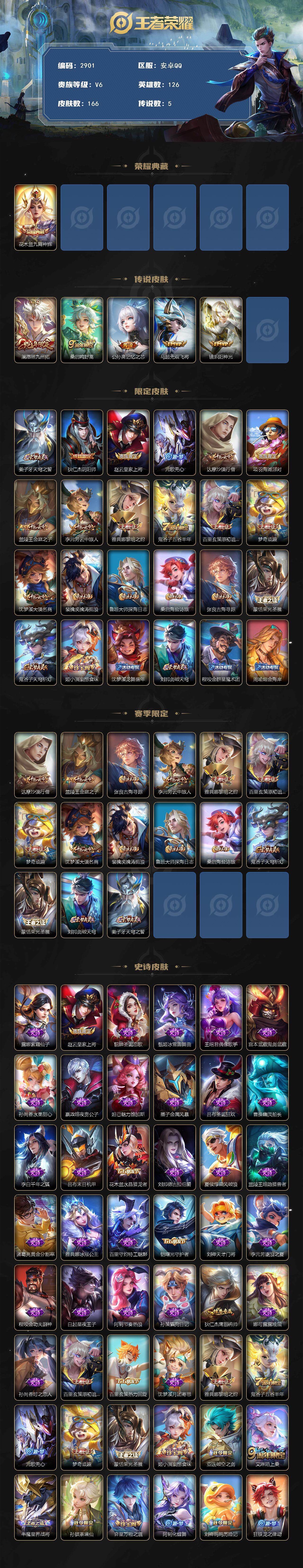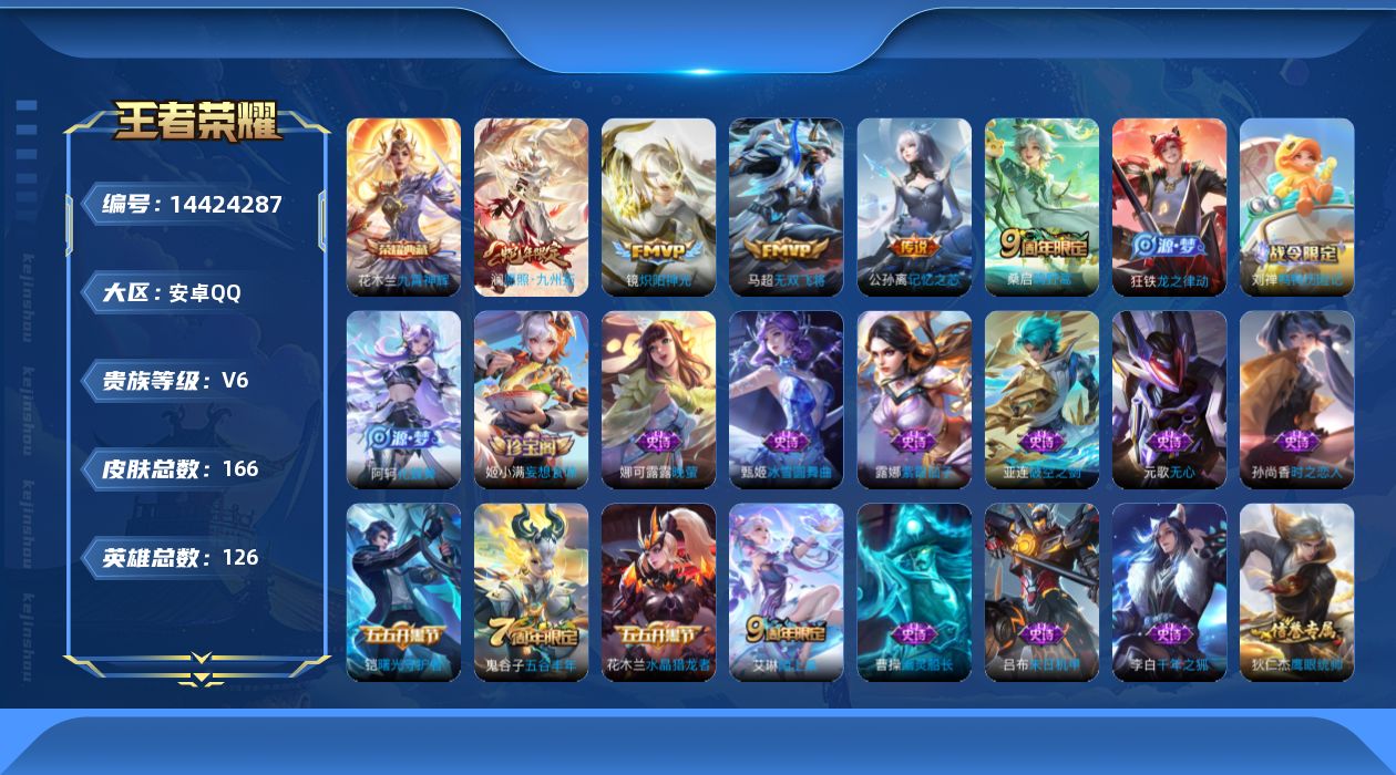 [14424287]安卓q-v5-最强王者段位-126英雄-166皮肤-1典藏-0珍品无双-0无双-0珍品传说-5传说-48史诗 【英雄全皮】:空空儿全皮,影全皮 【荣耀典藏】:花木兰九霄神辉 【传说皮肤】:澜愿照九州拓,桑启鸣野蒿,公孙离记忆之芯,马超无双飞将,镜炽阳神光 【限定皮肤】:姜子牙天穹之誓,狄仁杰阴阳师,赵云皇家上将,元歌无心,达摩沙漠行僧,项羽海滩派对,兰陵王金庭之子,李元芳云中旅人,雅典娜黎明之约,鬼谷子五谷丰年,百里玄策原初追逐者,梦奇顽趣,沈梦溪大漠名商,裴擒虎擒涛扼浪,鲁班大师探海日志,桑启海盐诗旅,张良古海寻踪,蒙恬荣光圣徽,鬼谷子天穹祈灯,姬小满妄想食味,沈梦溪龙舞盛年,刘邦剑破天穹,程咬金群星魔术团,周瑜熔金海岸 【赛季限定】:达摩沙漠行僧,兰陵王金庭之子,张良古海寻踪,李元芳云中旅人,雅典娜黎明之约,百里玄策原初追逐者,梦奇顽趣,沈梦溪大漠名商,裴擒虎擒涛扼浪,鲁班大师探海日志,桑启海盐诗旅,鬼谷子天穹祈灯,蒙恬荣光圣徽,刘邦剑破天穹,姜子牙天穹之誓 【史诗皮肤】:露娜紫霞仙子,赵云皇家上将,貂蝉圣诞恋歌,甄姬冰雪圆舞曲,王昭君偶像歌手,宫本武藏鬼剑武藏,孙尚香水果甜心,嬴政暗夜贵公子,妲己魅力维加斯,墨子金属风暴,吕布圣诞狂欢,曹操幽灵船长,李白千年之狐,吕布末日机甲,花木兰水晶猎龙者,刘邦德古拉伯爵,夏侯惇乘风破浪,兰陵王暗隐猎兽者,诸葛亮黄金分割率,雅典娜冰冠公主,百里守约特工魅影,铠曙光守护者,刘禅天才门将,李元芳逐浪之夏,程咬金功夫厨神,白起星夜王子,阿轲节奏热浪,孙策猫狗日记,狄仁杰鹰眼统帅,娜可露露晚萤,孙尚香时之恋人,百里玄策原初追逐者,百里玄策热力回旋,沈梦溪月团寄思,雅典娜黎明之约,鬼谷子五谷丰年,元歌无心,梦奇顽趣,蒙恬荣光圣徽,姬小满妄想食味,亚连破空之剑,艾琳陌上桑,牛魔星界战将,孙膑茶境仙,弈星万物之道,阿轲化蝶舞,刘禅鸭鸭历险记,狂铁龙之律动 【其他皮肤】:项羽海滩派对,韩信街头霸王,阿轲爱心护理,赵云白执事,赵云忍炎影,芈月红桃皇后,白起白色死神,牛魔西部大镖客,安琪拉玩偶对对碰,孙膑天使之翼,典韦黄金武士,亚瑟死亡骑士,达摩拳王,花木兰兔女郎,张飞五福同心,宫本武藏万象初新,后羿阿尔法小队,狄仁杰阴阳师,刘备纽约教父,刘备汉昭烈帝,关羽龙腾万里,老夫子功夫老勺,孙尚香沉稳之力,诸葛亮掌控之力,李白敏锐之力,鬼谷子幻乐之