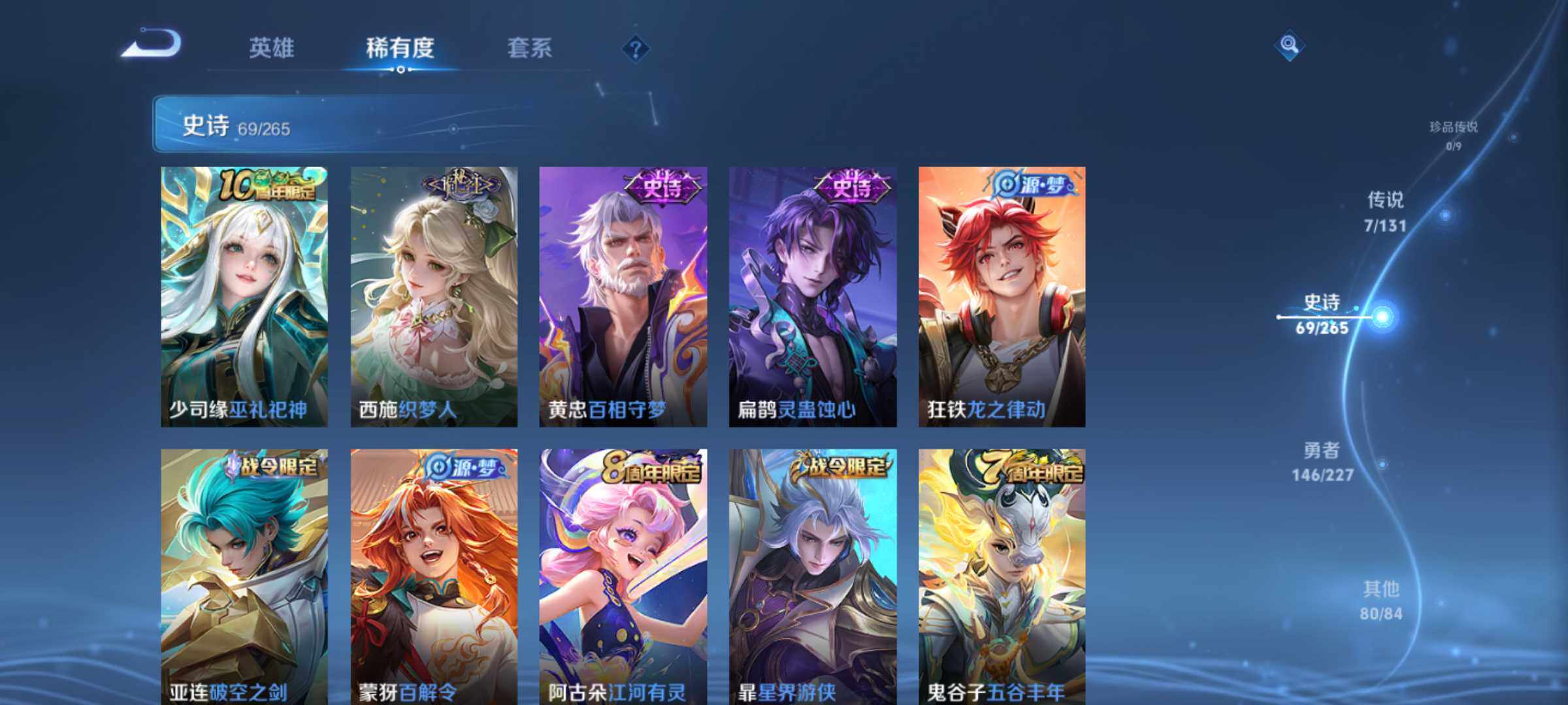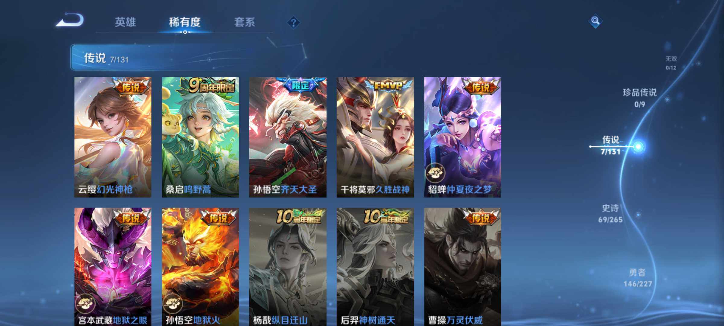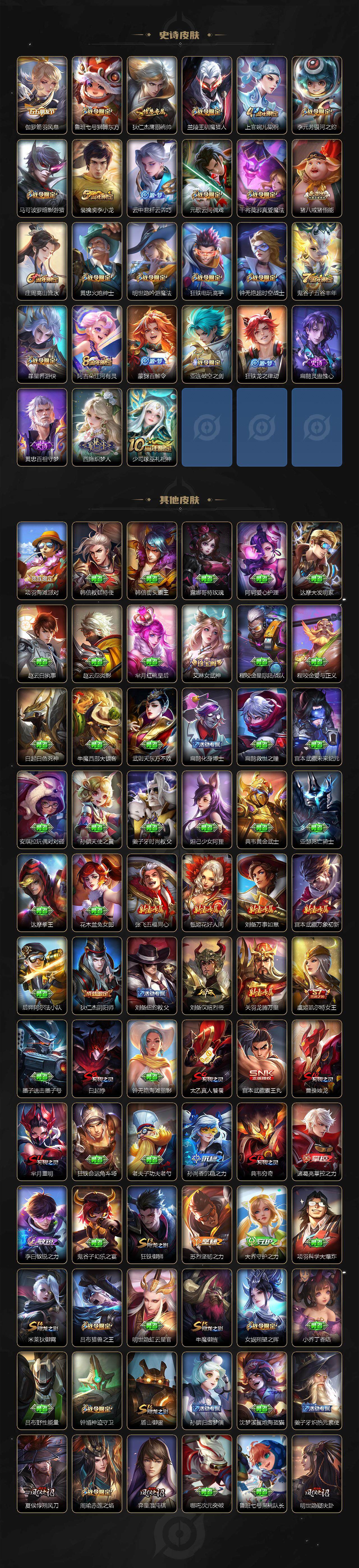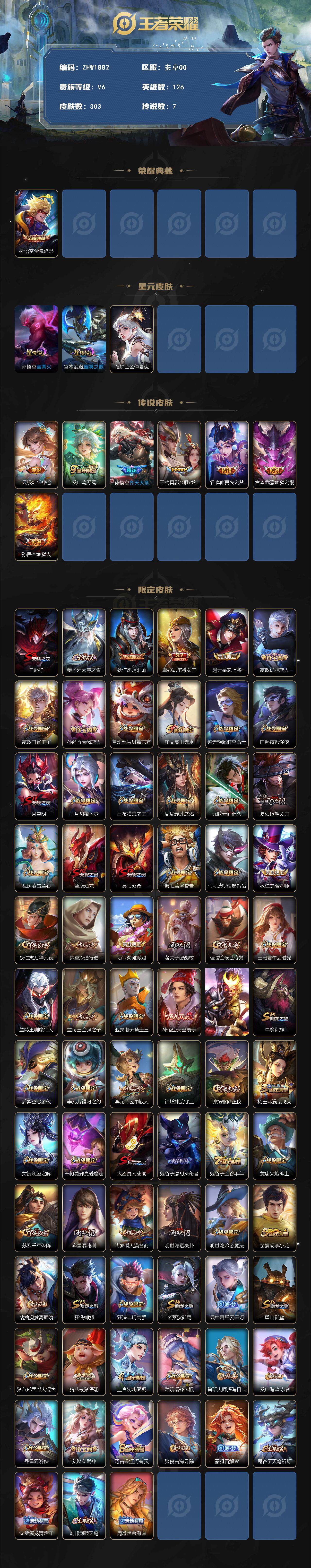 126英雄-303皮肤-【店主推荐捡漏号!可直接换绑】安卓q-v6-至尊星耀ii段位-126英雄-303皮肤-1典藏皮肤-3星传说-7传说-69史诗 【英雄全皮】:鬼谷子全皮,狂铁全皮,猪八戒全皮 【荣耀典藏】:孙悟空全息碎影 【传说皮肤】:云缨幻光神呛,桑启鸣野蒿,孙悟空齐天大圣,干将莫邪久胜战神,貂蝉仲夏夜之梦,宫本武
