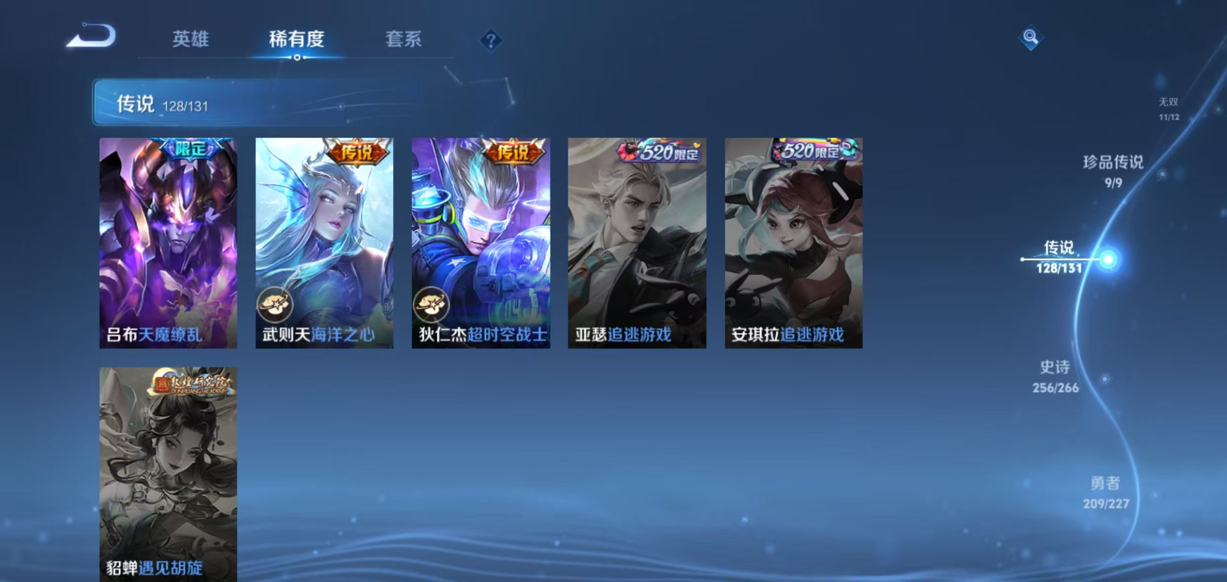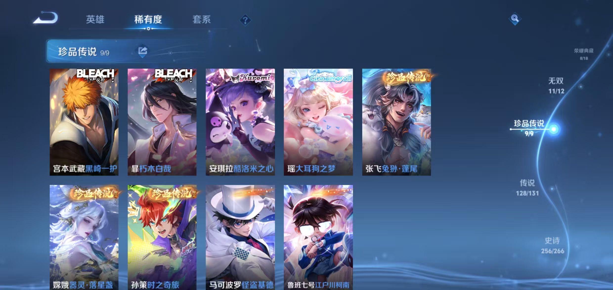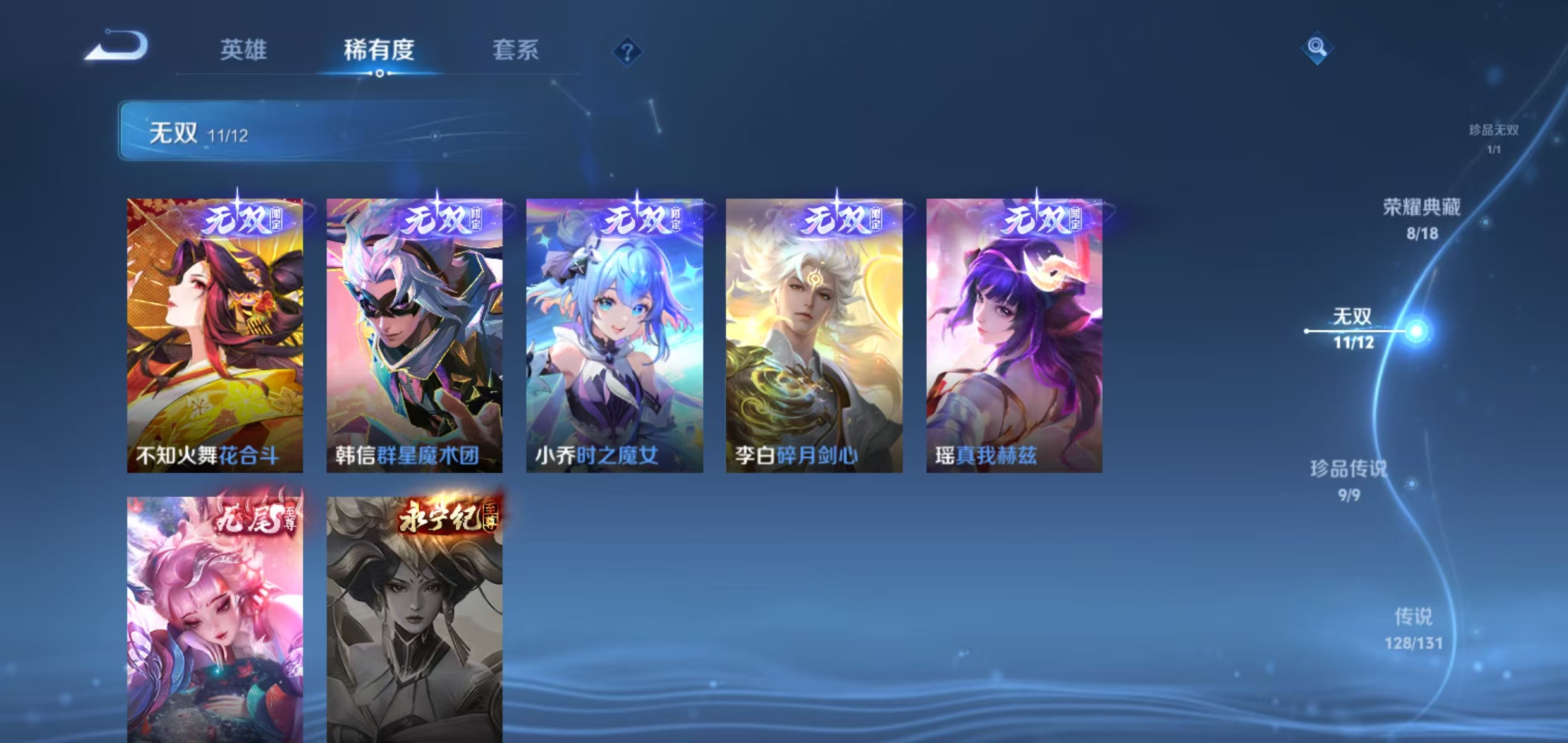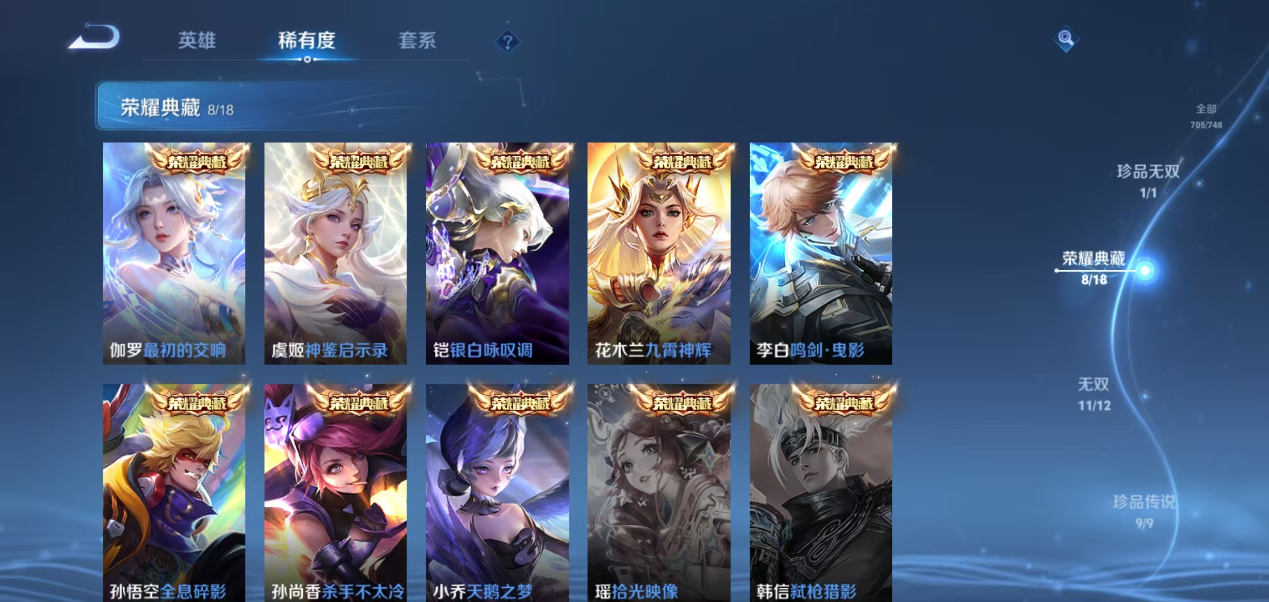荣耀v10(稳1月份)705皮肤 8典藏 1小兵 (天鹅之梦,全息碎影,最初的交响,银白咏叹调,杀手不太冷,九霄神辉,神鉴启示录,鸣剑·曳影) 11无双(神罪,天机白泽,器灵·螭龙剑,雪境奇遇,离恨烟,花合斗,群星魔术团,青丘·九尾,时之魔女,碎月剑心,真我赫兹) 9珍品(朽木白哉,黑崎一护,酷洛米之心,大耳狗之梦,兔狲·蓬尾,器灵·落星盏,时之奇旅,江户川柯南,怪盗基德) 1珍品无双(馥梦繁花) 128传说(纵目迁山,神树通天,万灵伏威,千山共赴,诡秘之主,死亡执政官,九山相柳,永曜之星,云诺千山,续相思,星之鸣奏,千劫归真,愿照·福禄聚,愿照·众生和,愿照·岁时盈,愿照·九州拓,幻光神呛,愿照·山河定,愿照·千秋盛,祥瑞亨通,玄雷天君,鸣野蒿,映山客,牧神诗旅,默契交锋,霜北刀,冥王哈迪斯,无尽星芒,时雨天司,凤求凰,挚爱之约,挚爱花嫁,心动手记,海洋之心,音你闪耀,末日机甲,绛天战甲,音你心动,音你心动,群星魔术团,天魔缭乱,黄金天蝎座,神器·狴犴令,金乌负日,时之恋人,落雪白狼,曦玄引,曦玄引,武陵仙君,寅虎·赤拳,战鼓燎原,乘龙·铭钟鼎,乘龙·问璇玑,乘龙·淬吴钩,琥珀纪元,琥珀纪元,补天,时之祈愿,觅芳踪,逐花归海,霜月吟,小动物乐团,夜礼服假面,永恒水手月亮,飞鸢探春,星穹之声,寅虎·瑞焰,至美·化雀舞,时之奇旅,时之奇旅,影龙天霄,遇见神鼓,武圣,惊梅引,猫影幻舞,云鹰飞将,末日机甲,太华,花朝如约,鹤归松栖,妄想奇谈,冠军飞将,胖达荣荣,仲夏夜之梦,灼幽烈阳,妄想实况,鹤羽星尊,电玩·雷克斯,百相守梦,记忆之芯,浮生妄,画中仙,燃星之曲,无限倾心,无限倾心,炽翼辉光,地狱之眼,齐天大圣,山海·炽霜斩,山海·苍雷引,山海·琳琅生,怒海麟威,诗剑行,异界灵契,绯月行,碎云,枫霜尽,前尘镜,深海之息,启示之音,无双飞将,一念神魔,超时空战士,黄金狮子座,淬星耀世,乞巧织情,游龙清影,启明星使,李 ,祈雪灵祝,炽阳神光,零号·赤焰,黄金白羊座,久胜战神,白虎志,云霓雀翎,黄金射手座,地狱火) 带1传说灵宝 2传说天幕 247皮肤按键