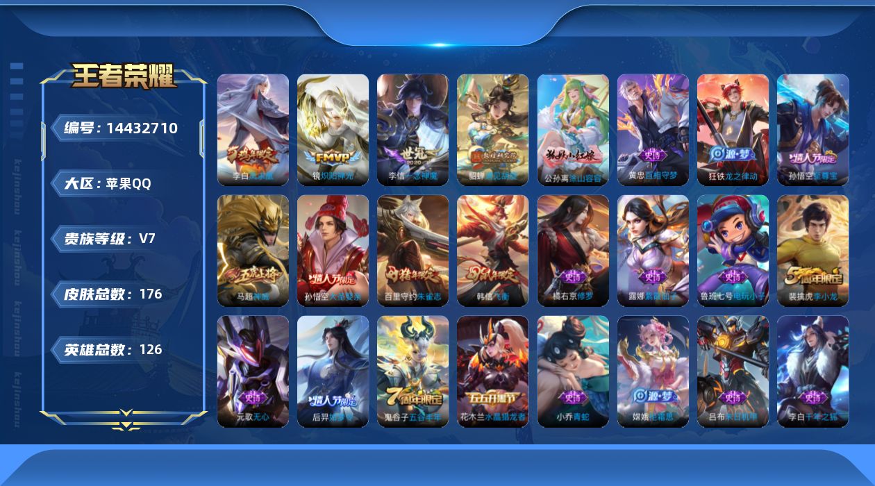 苹果q【可二次】v7-126英雄-176皮肤-9王者印记【全皮英雄】 鬼谷子全皮 【传说】 凤求凰 遇见胡旋 炽阳神光 一念神魔 【热门】涂山容容 神威 至尊宝 朱雀志 飞衡 后羿如梦令 大圣娶亲 拒霜思 冰冠公主 原初追逐者 黎明之约 梁祝 电玩小子 黄忠百相守梦 原初探秘者 李小龙 水晶猎龙者
