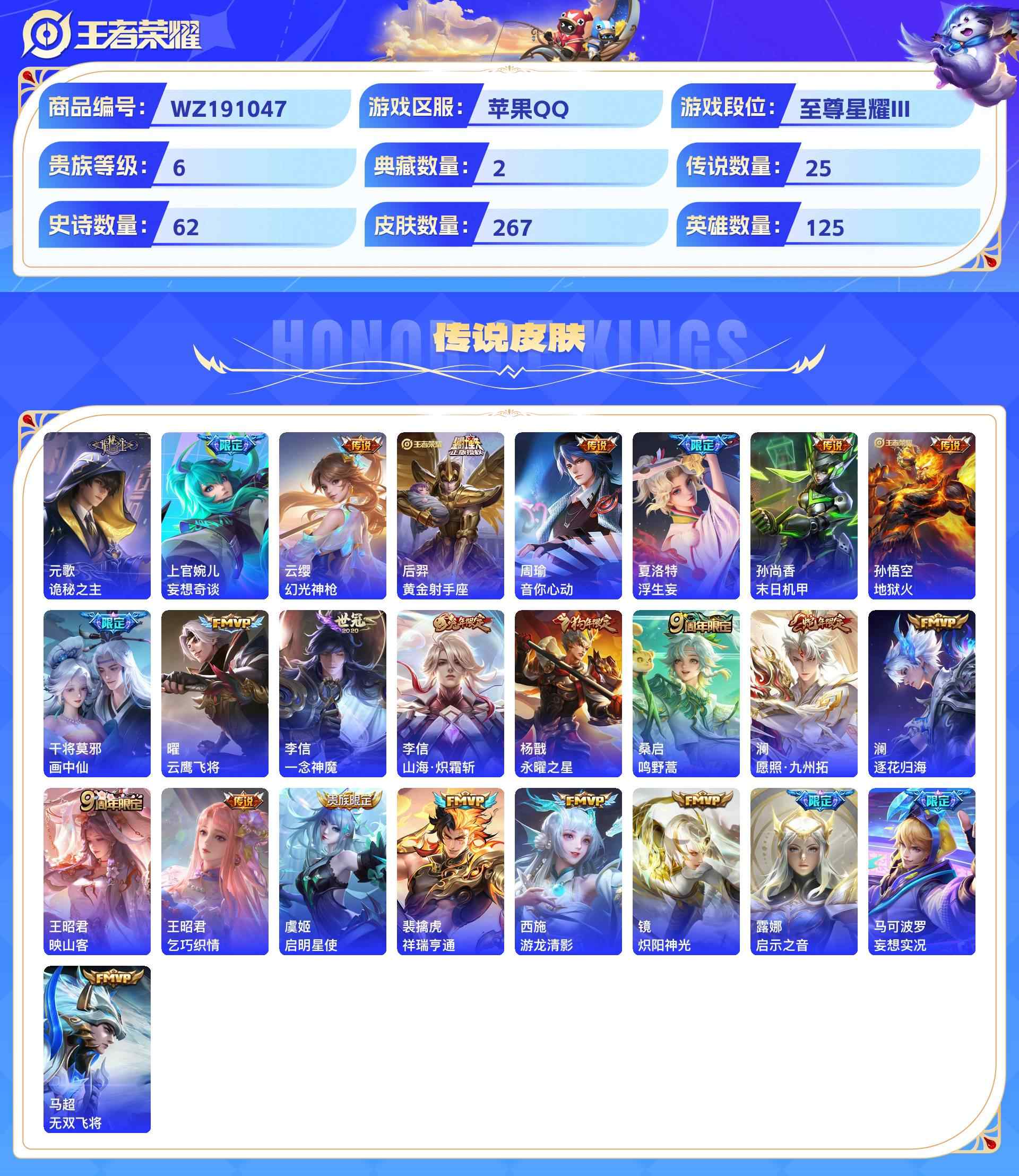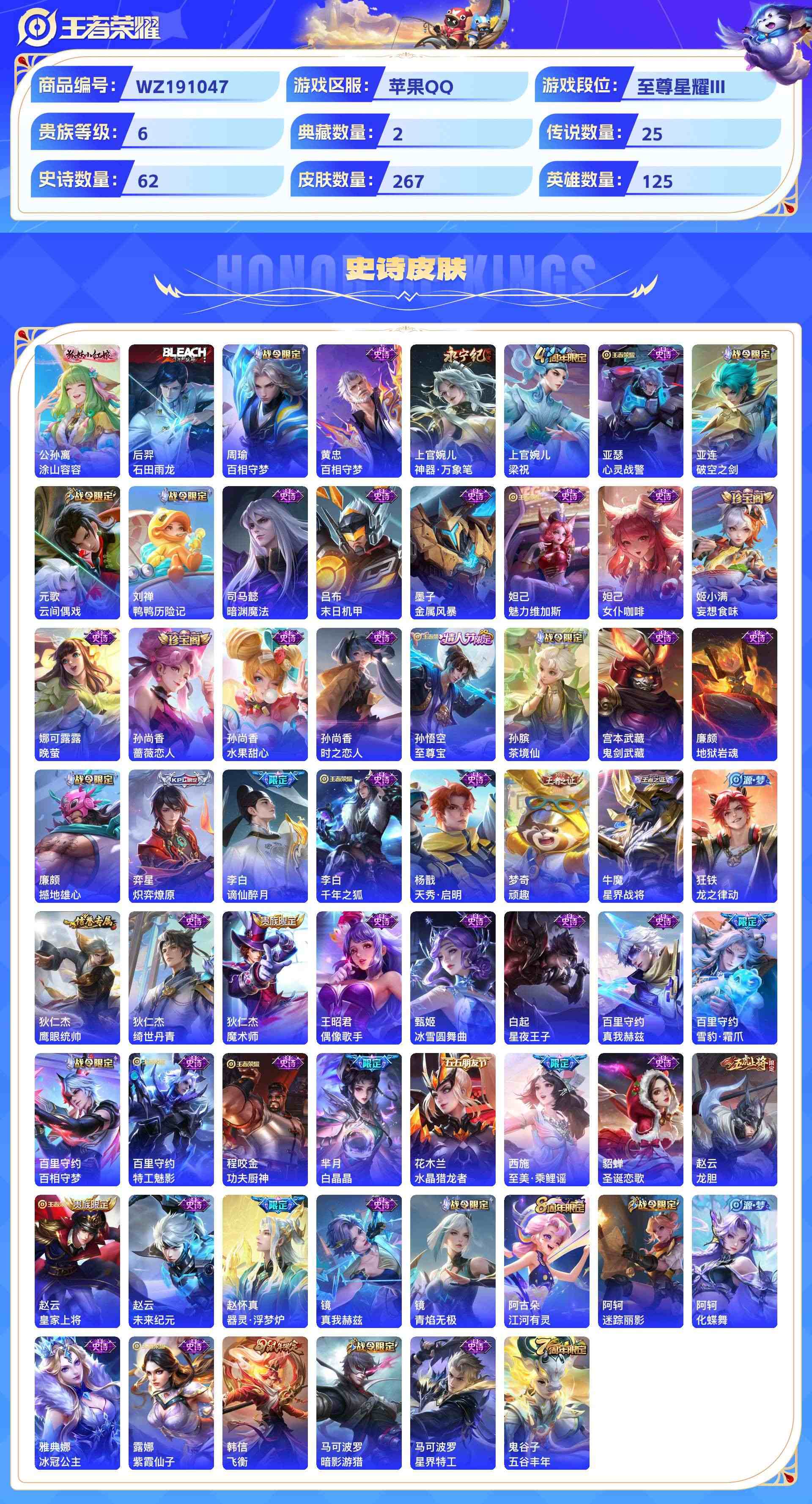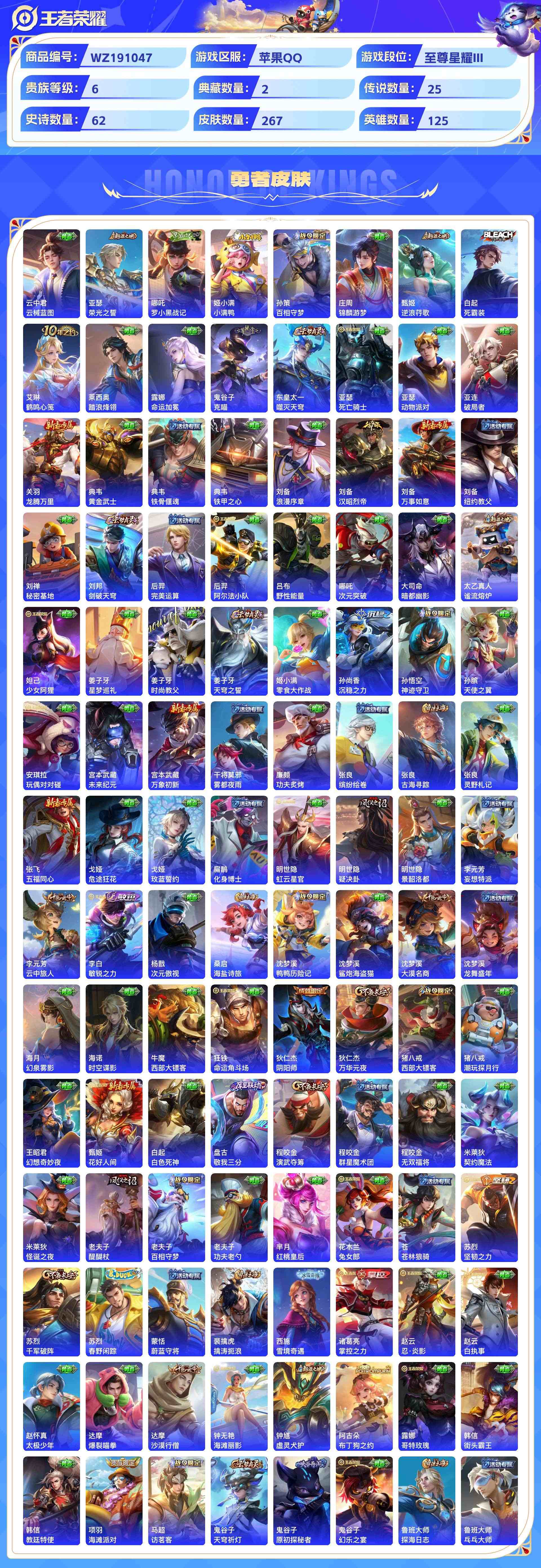 wz191047|精品金标号1金标(上官婉儿)【荣耀典藏】赤影疾锋鸣剑·曳影【珍品传说】黑崎一护朽木白哉兔狲·蓬尾怪盗基德江户川柯南【无双限定】天机白泽器灵·螭龙剑苹果qq 贵族8级 267皮 2典藏 5珍品传说 2无双 25传说 62史诗3星传说19个性按键1天幕