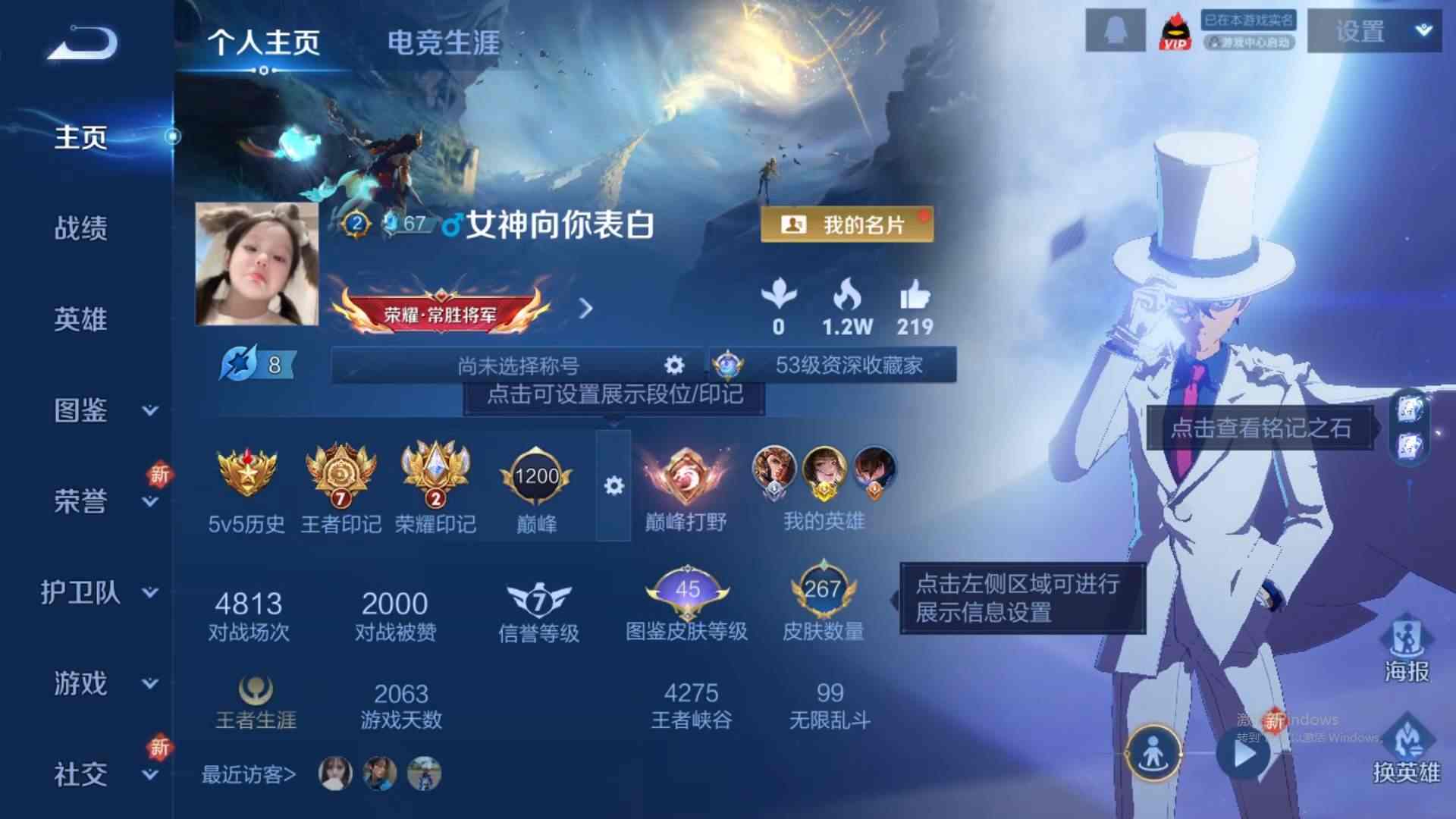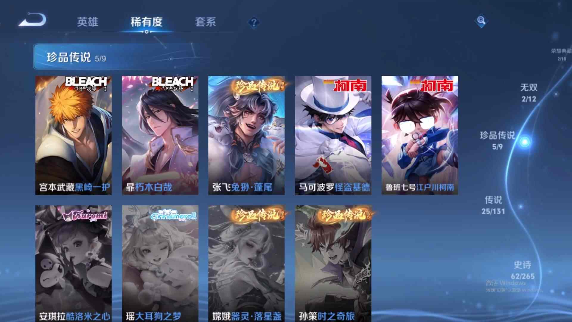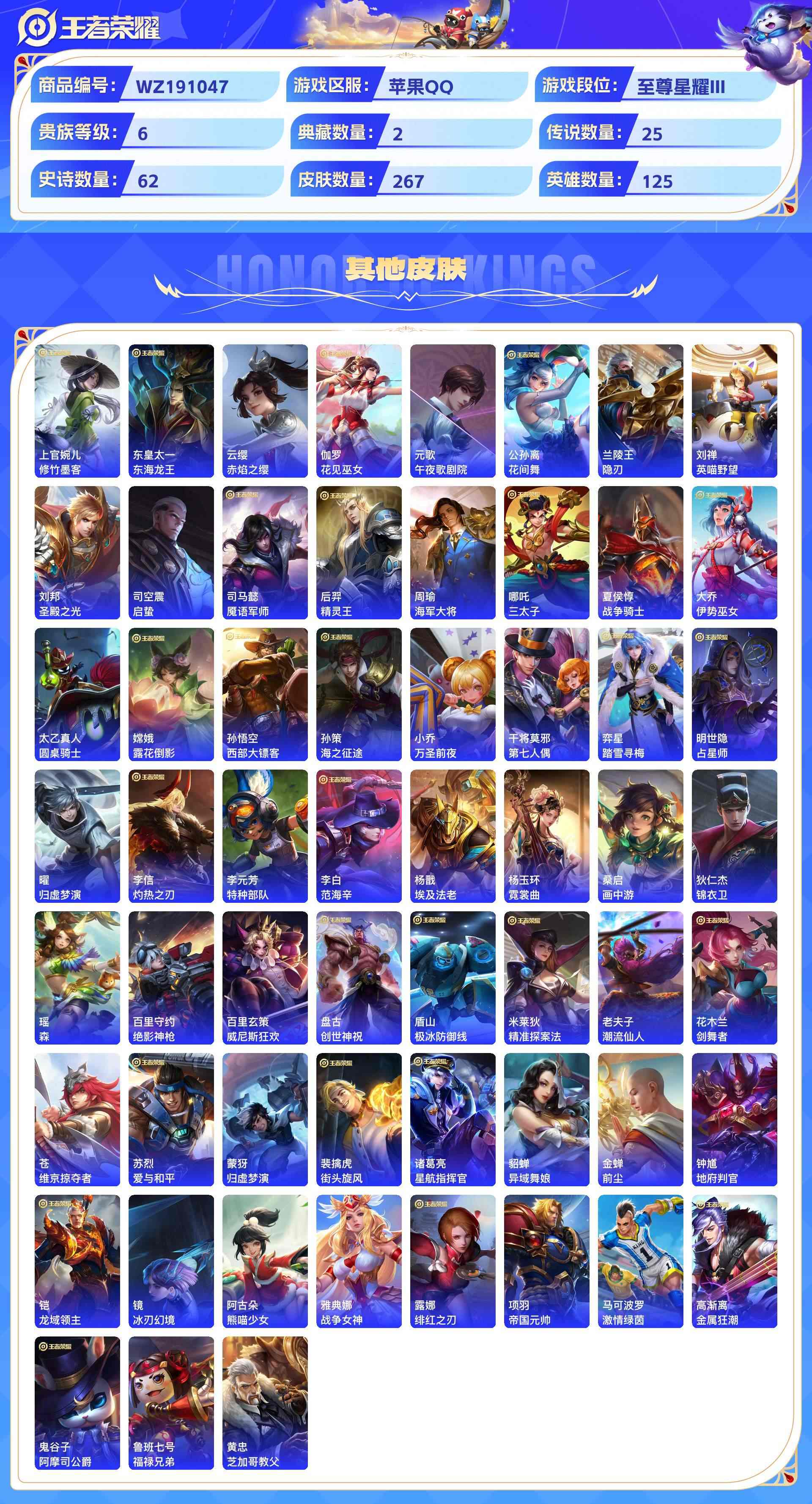 wz191047|精品金标号1金标(上官婉儿)【荣耀典藏】赤影疾锋鸣剑·曳影【珍品传说】黑崎一护朽木白哉兔狲·蓬尾怪盗基德江户川柯南【无双限定】天机白泽器灵·螭龙剑苹果qq 贵族8级 267皮 2典藏 5珍品传说 2无双 25传说 62史诗3星传说19个性按键1天幕