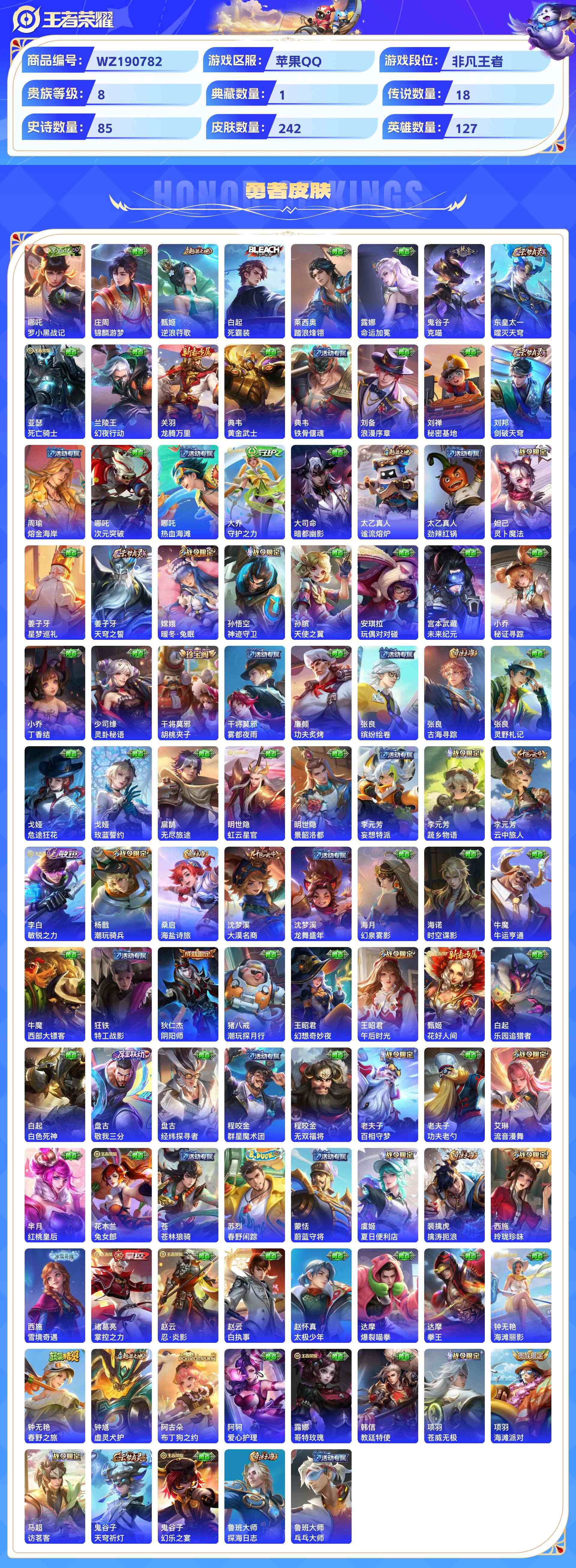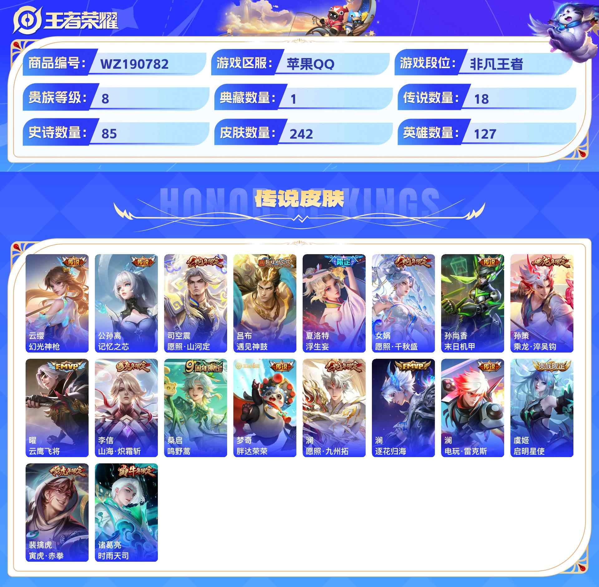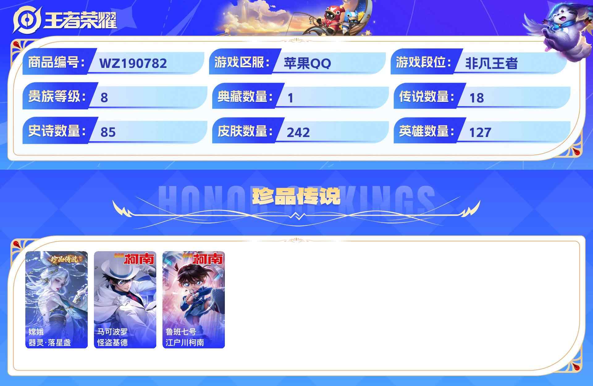 wz190782|精品号【荣耀典藏】弑呛猎影【珍品传说】器灵·落星盏怪盗基德江户川柯南【传说皮肤】幻光神呛记忆之芯愿照·山河定遇见神鼓浮生妄愿照·千秋盛末日机甲乘龙·淬吴钩云鹰飞将山海·炽霜斩鸣野蒿胖达荣荣愿照·九州拓逐花归海电玩·雷克斯启明星使寅虎·赤拳时雨天司苹果qq 贵族8级 242皮 1典藏 3珍品传说 18传说 85史诗1星传说14个性按键1天幕
