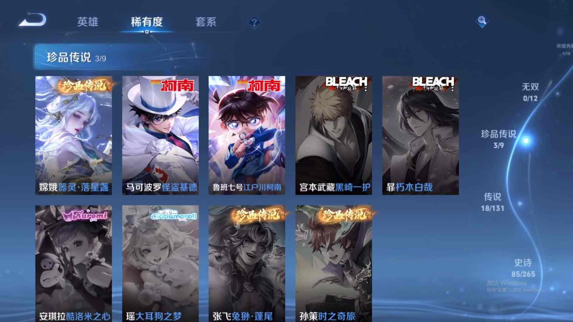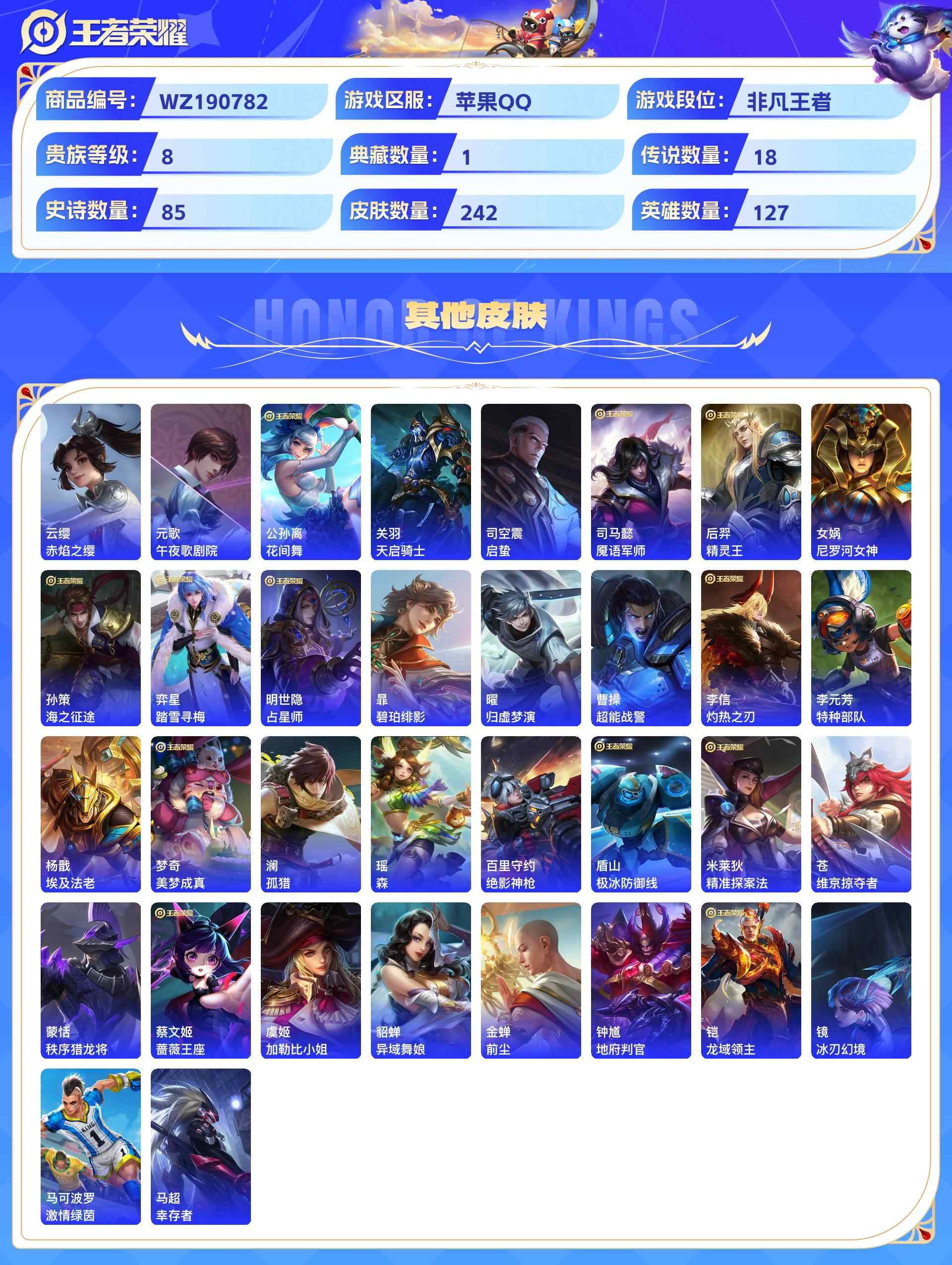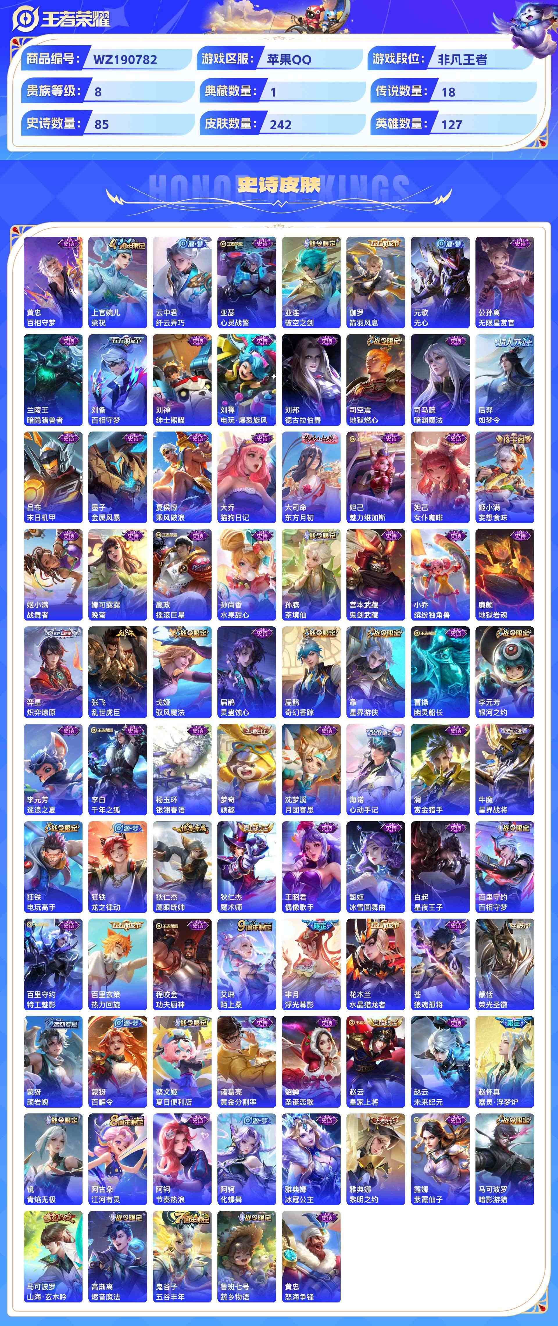 wz190782|精品号【荣耀典藏】弑呛猎影【珍品传说】器灵·落星盏怪盗基德江户川柯南【传说皮肤】幻光神呛记忆之芯愿照·山河定遇见神鼓浮生妄愿照·千秋盛末日机甲乘龙·淬吴钩云鹰飞将山海·炽霜斩鸣野蒿胖达荣荣愿照·九州拓逐花归海电玩·雷克斯启明星使寅虎·赤拳时雨天司苹果qq 贵族8级 242皮 1典藏 3珍品传说 18传说 85史诗1星传说14个性按键1天幕